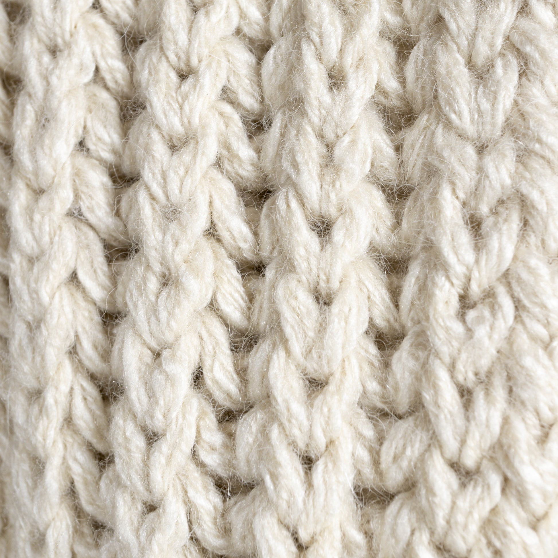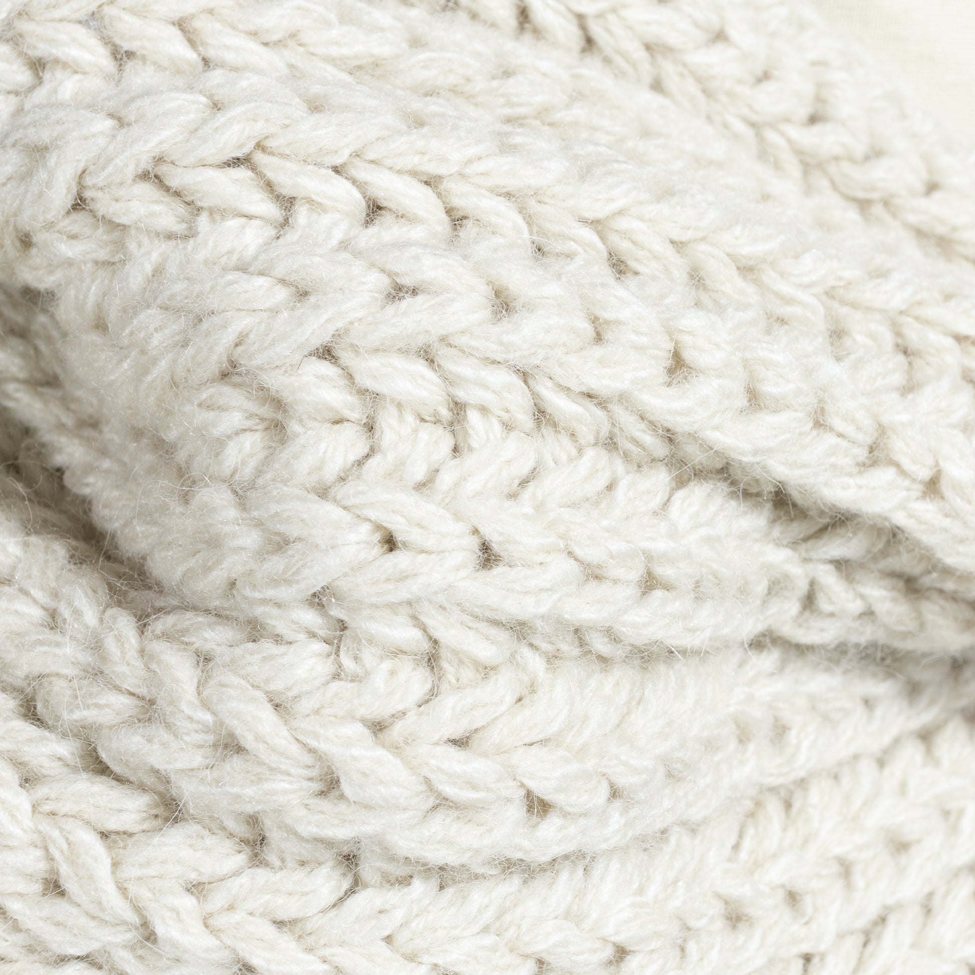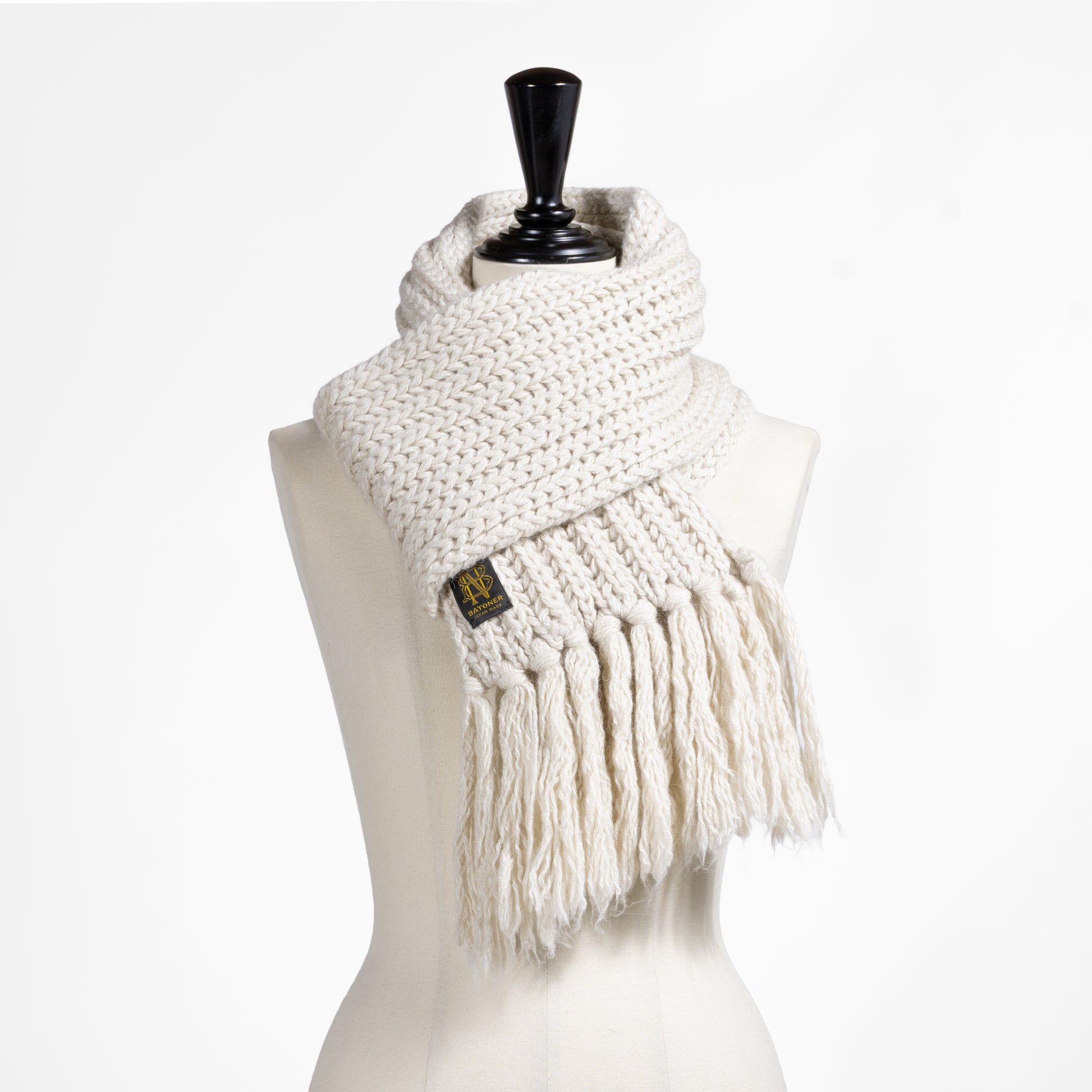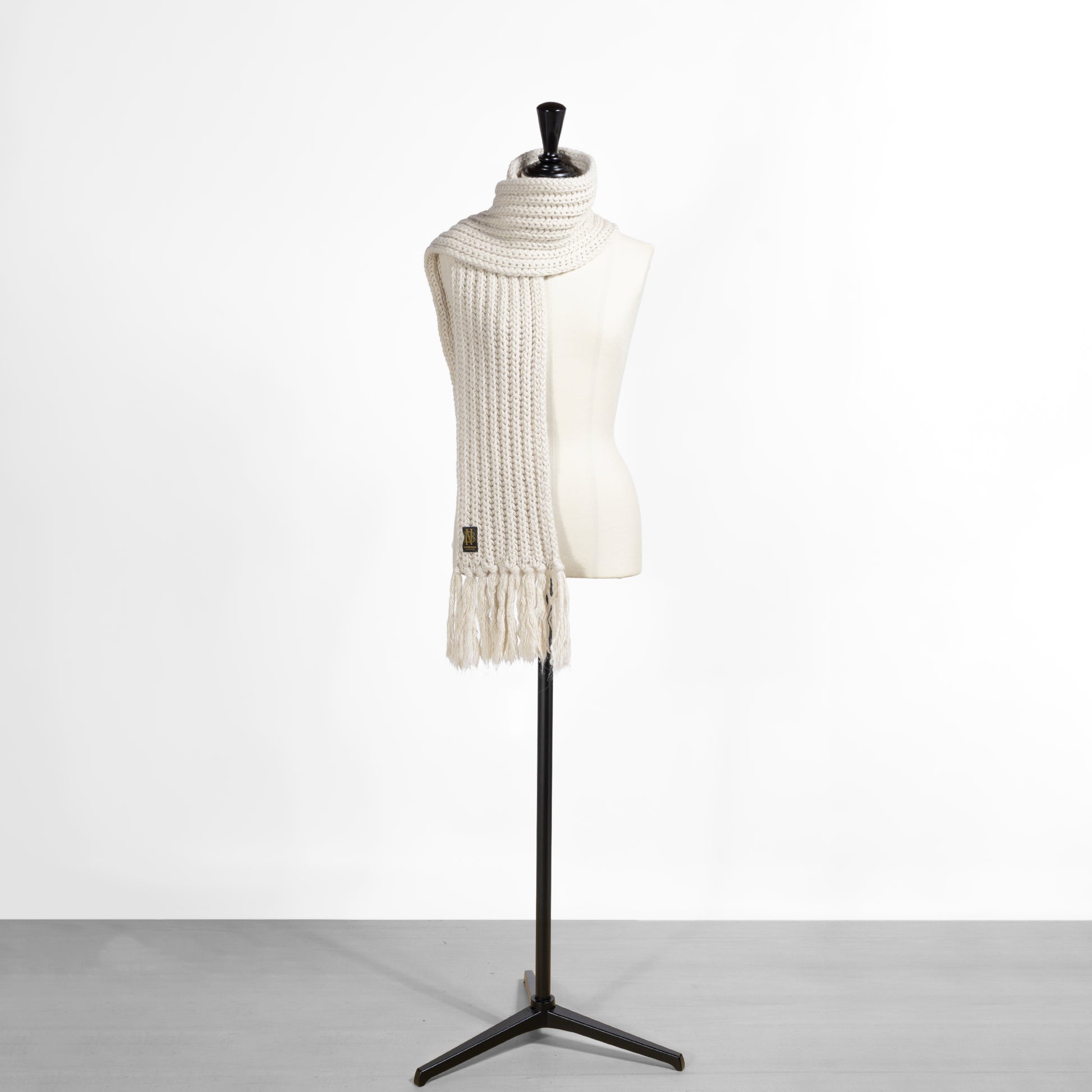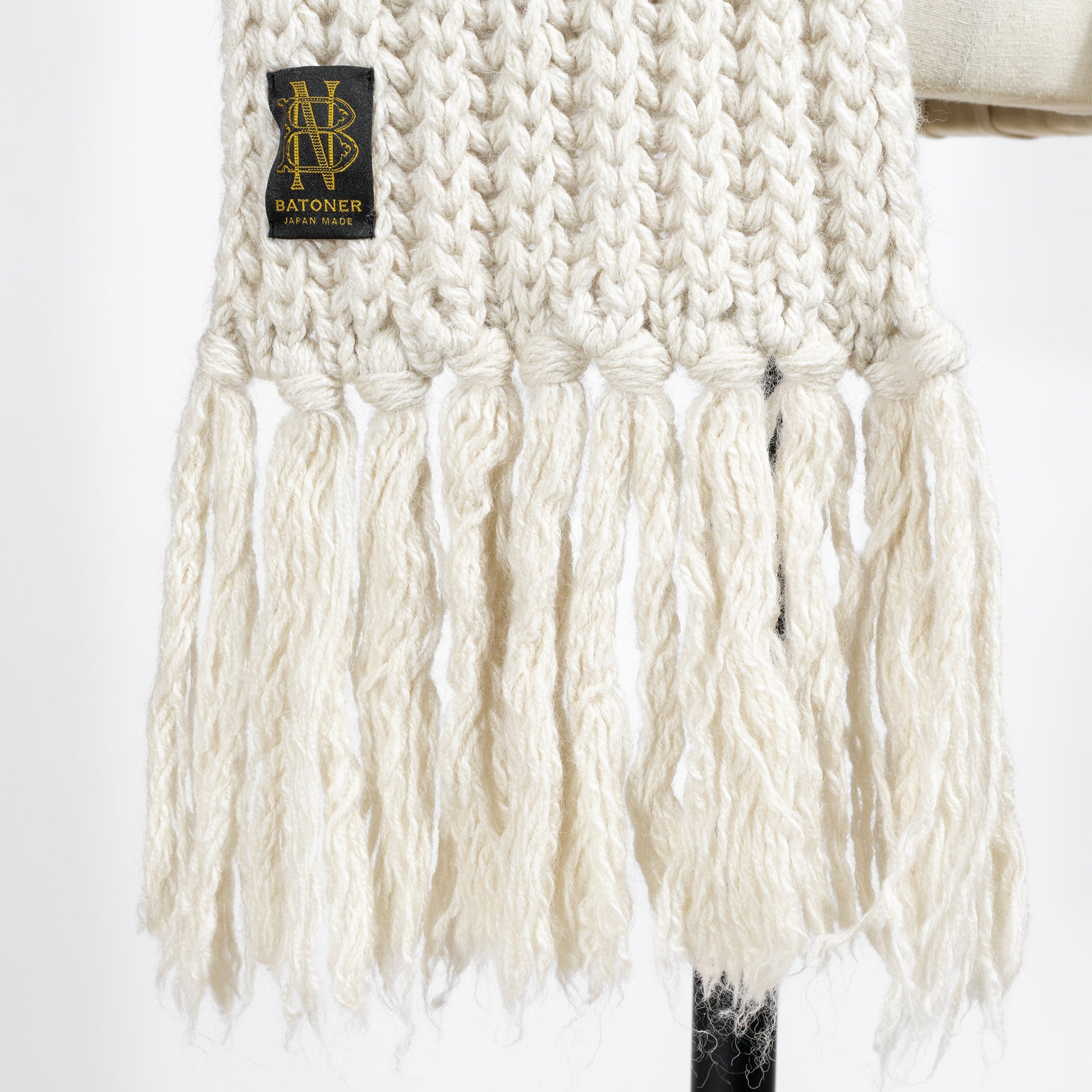 膨らみの強い太番手のメリノウール、柔らかく優しい肌触りのアルパカ、さらに光沢感のあるシルクをブレンドした上質な素材使いが魅力のローゲージマフラー