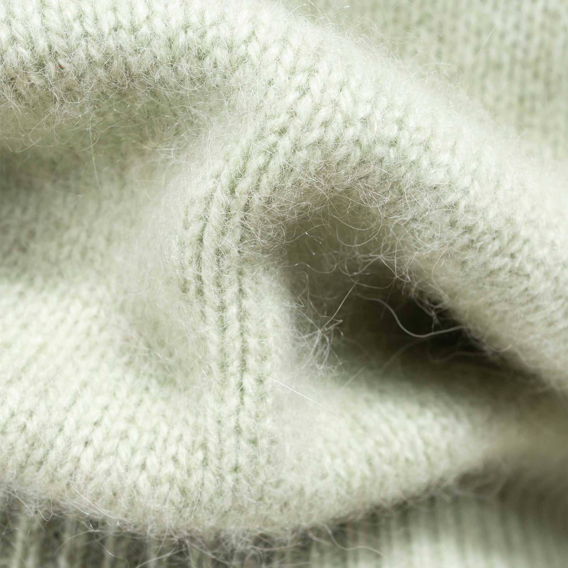 カシミヤ4大産地の一つアルランシャンで採取されたカシミヤヤギと、ブルーフォックスを3:1の黄金比でブレンドした極上の糸を使用