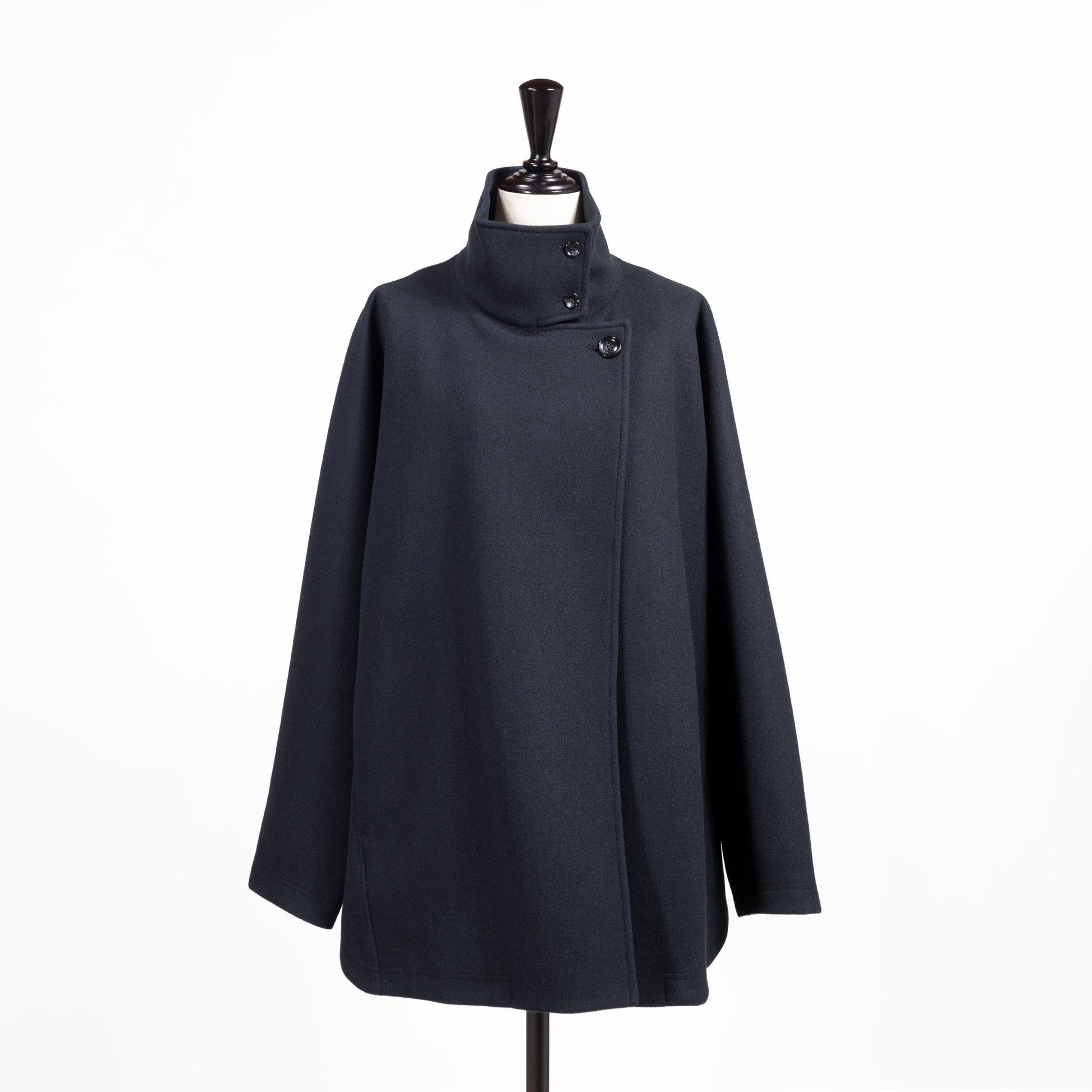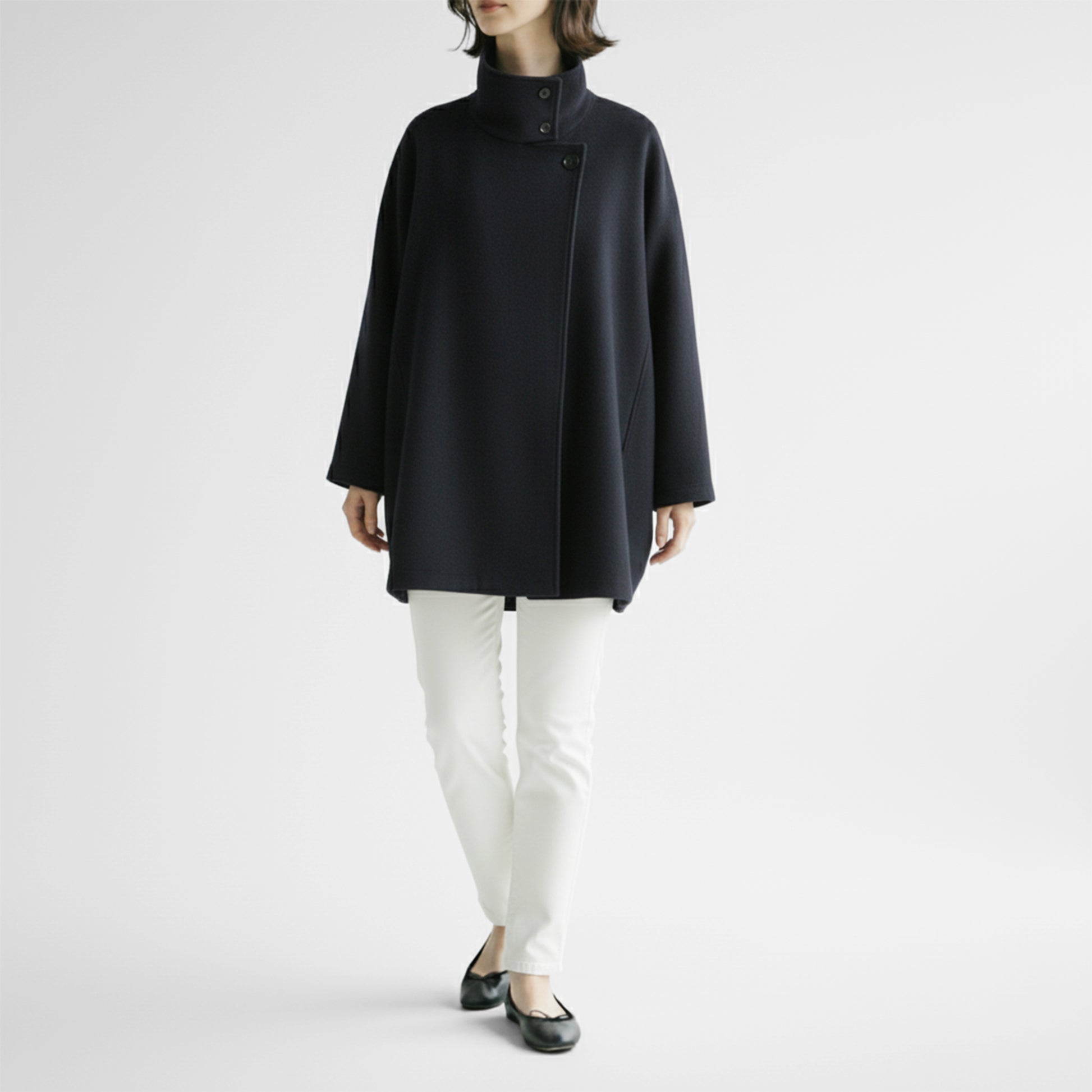 首元の3つのボタンで留めるケープ風のデザインが印象的なショートコート