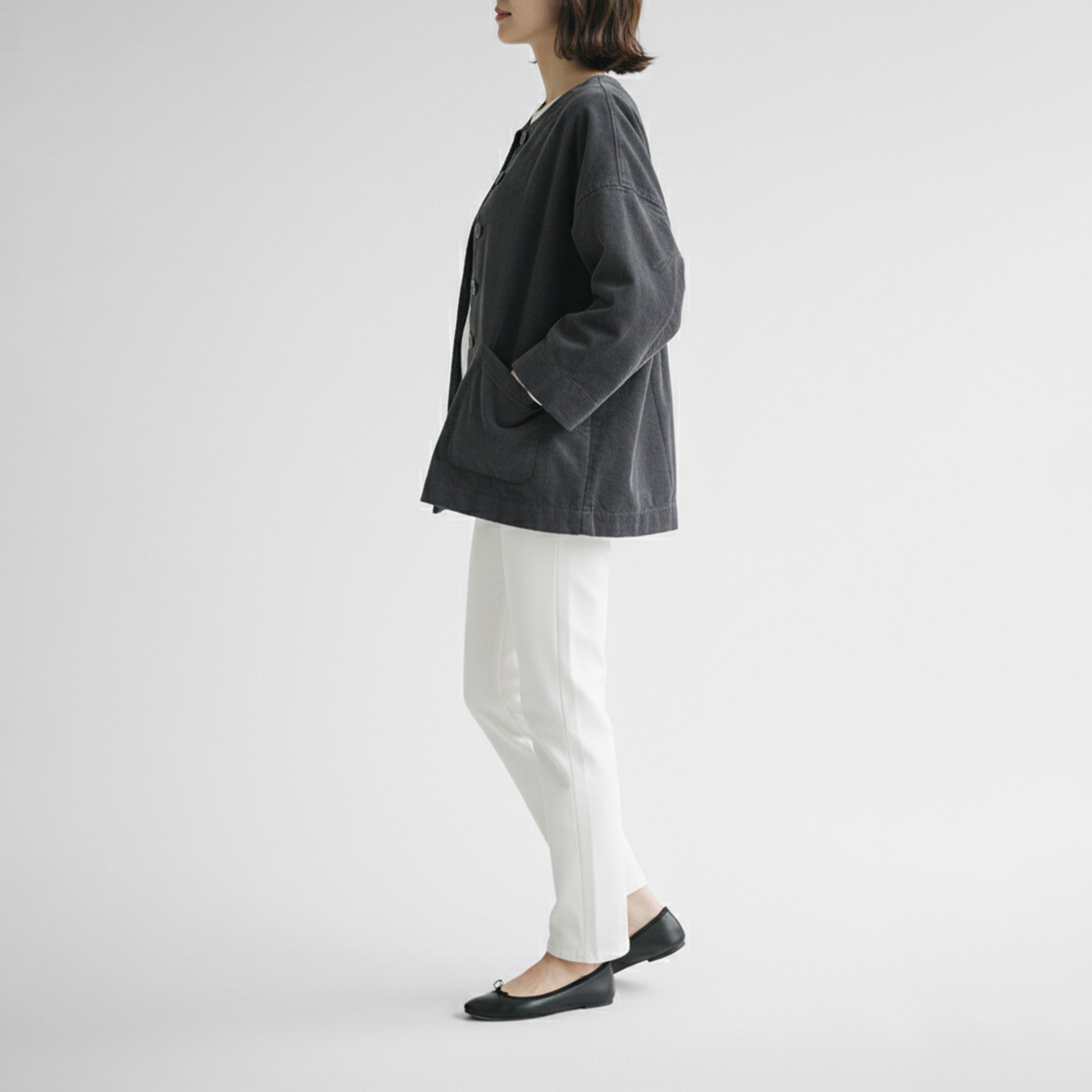 スッキリとしたノーカラーのシンプルなデザインで、幅広いコーディネートで着回せる便利な1着です