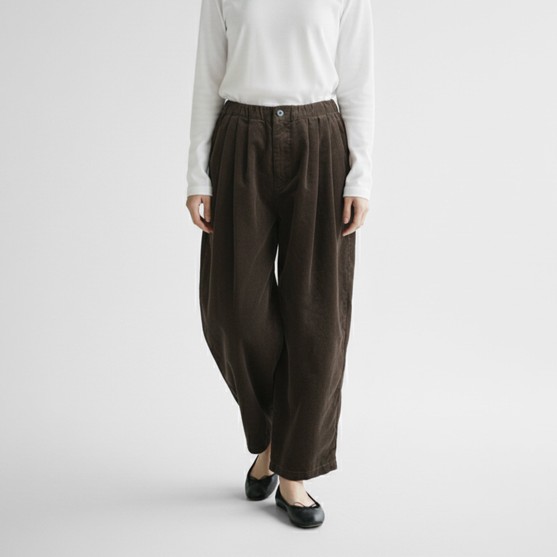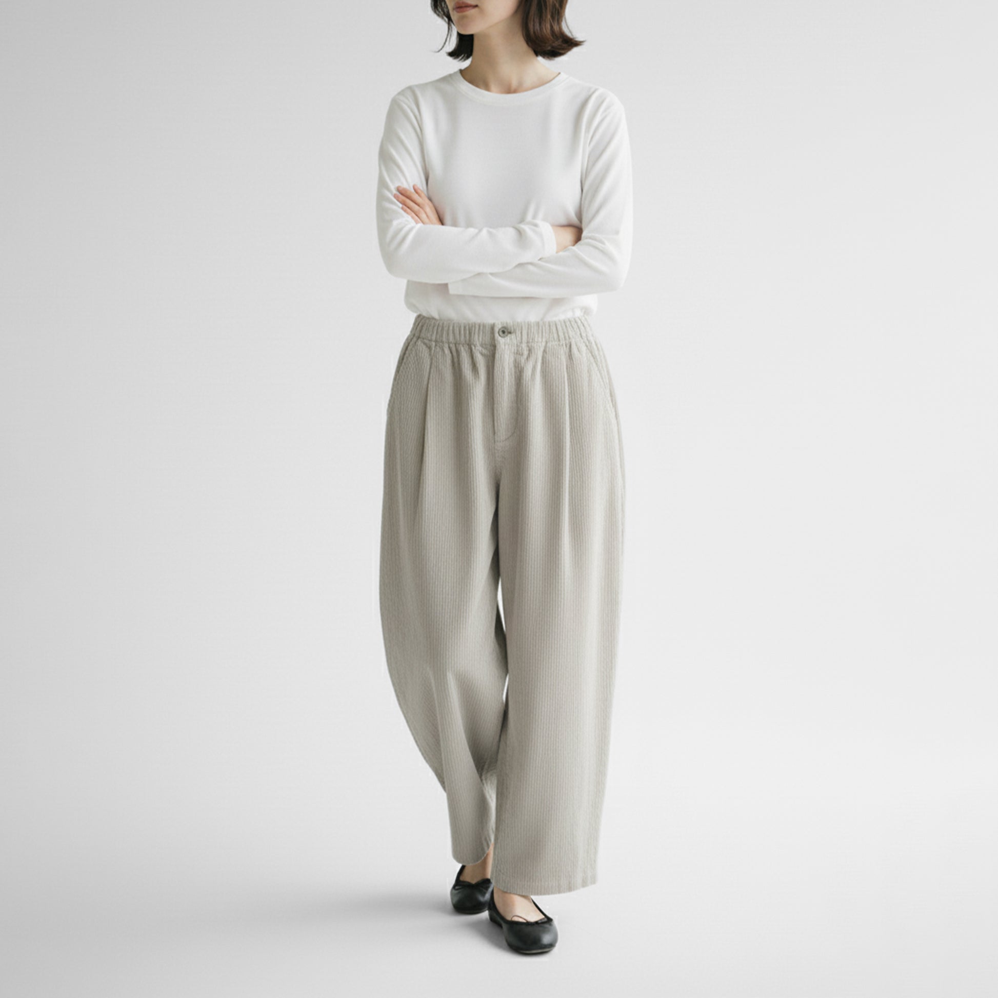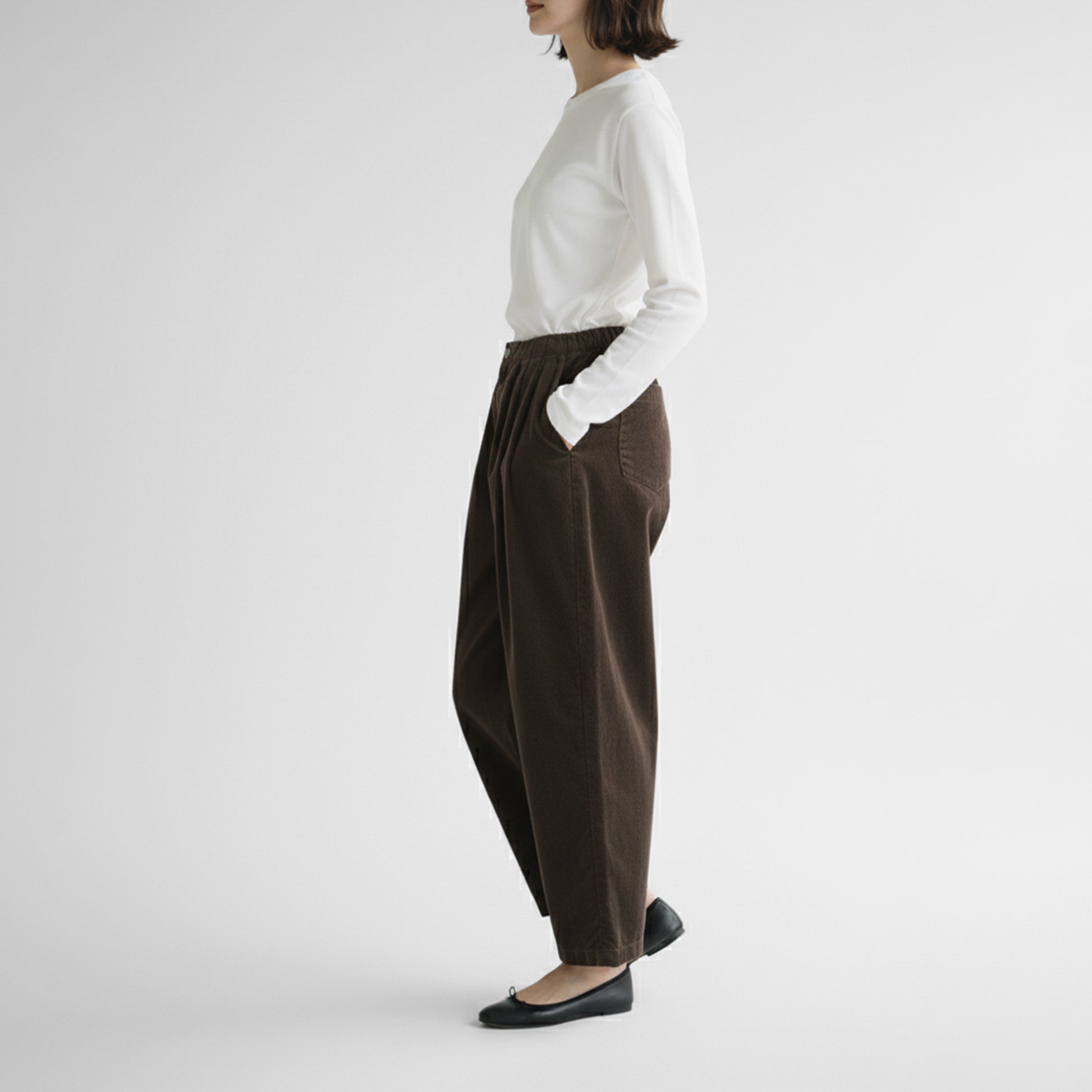 厚すぎずとゴワつきのない柔らかな生地感と、ウエストゴムのゆったりとしたワイドシルエットで、いつでも快適でストレスフリーなはき心地を提供してくれます