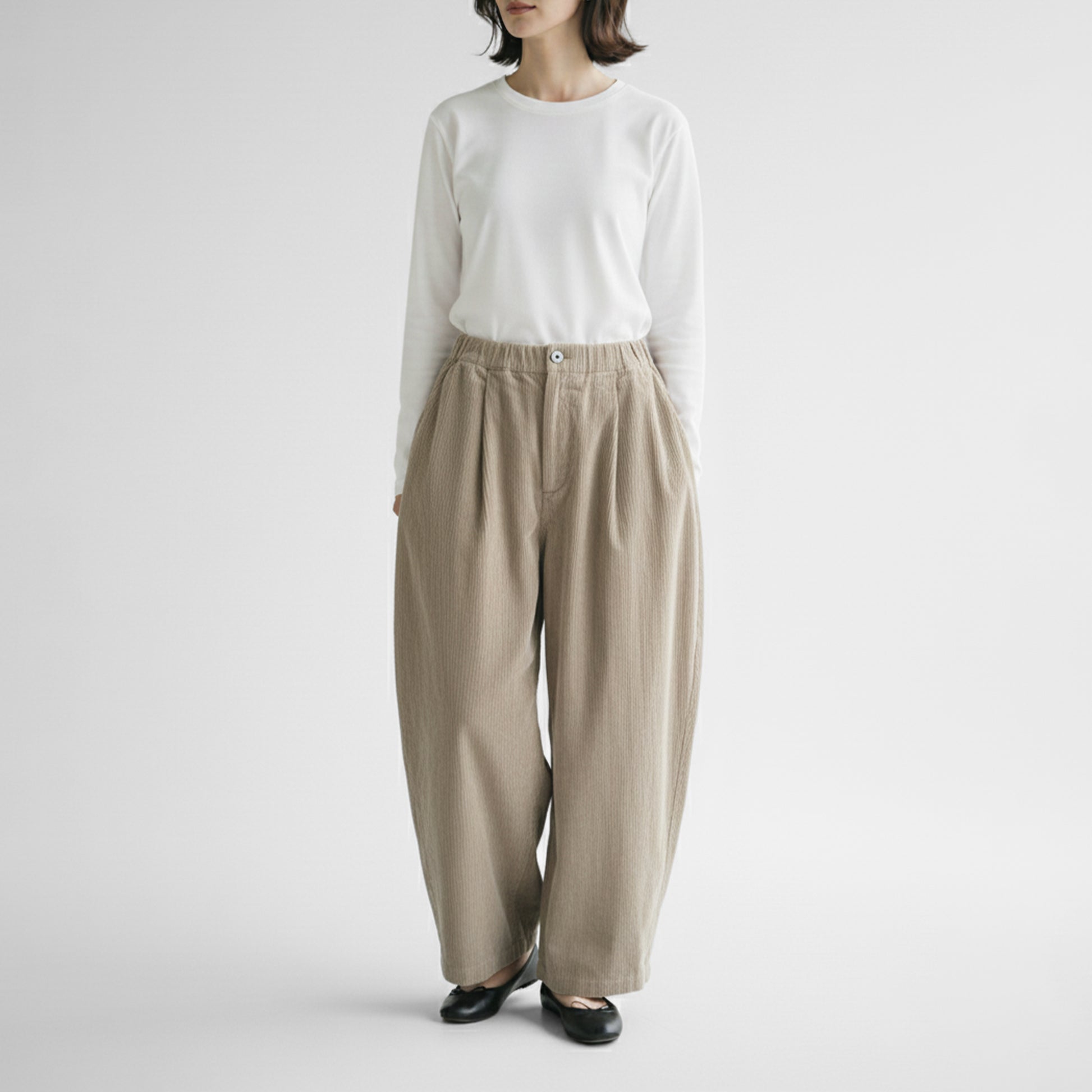 秋冬の気分を盛り上げるコーデュロイ素材のワイドパンツです