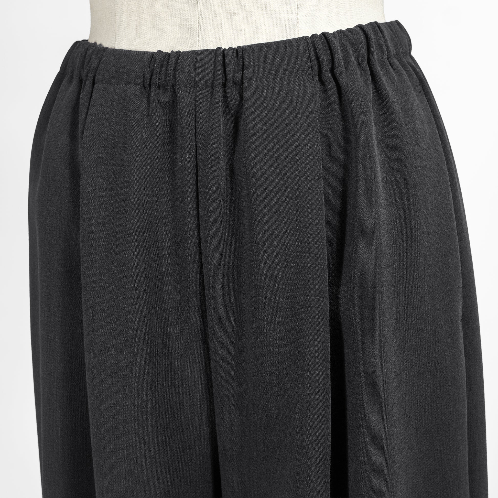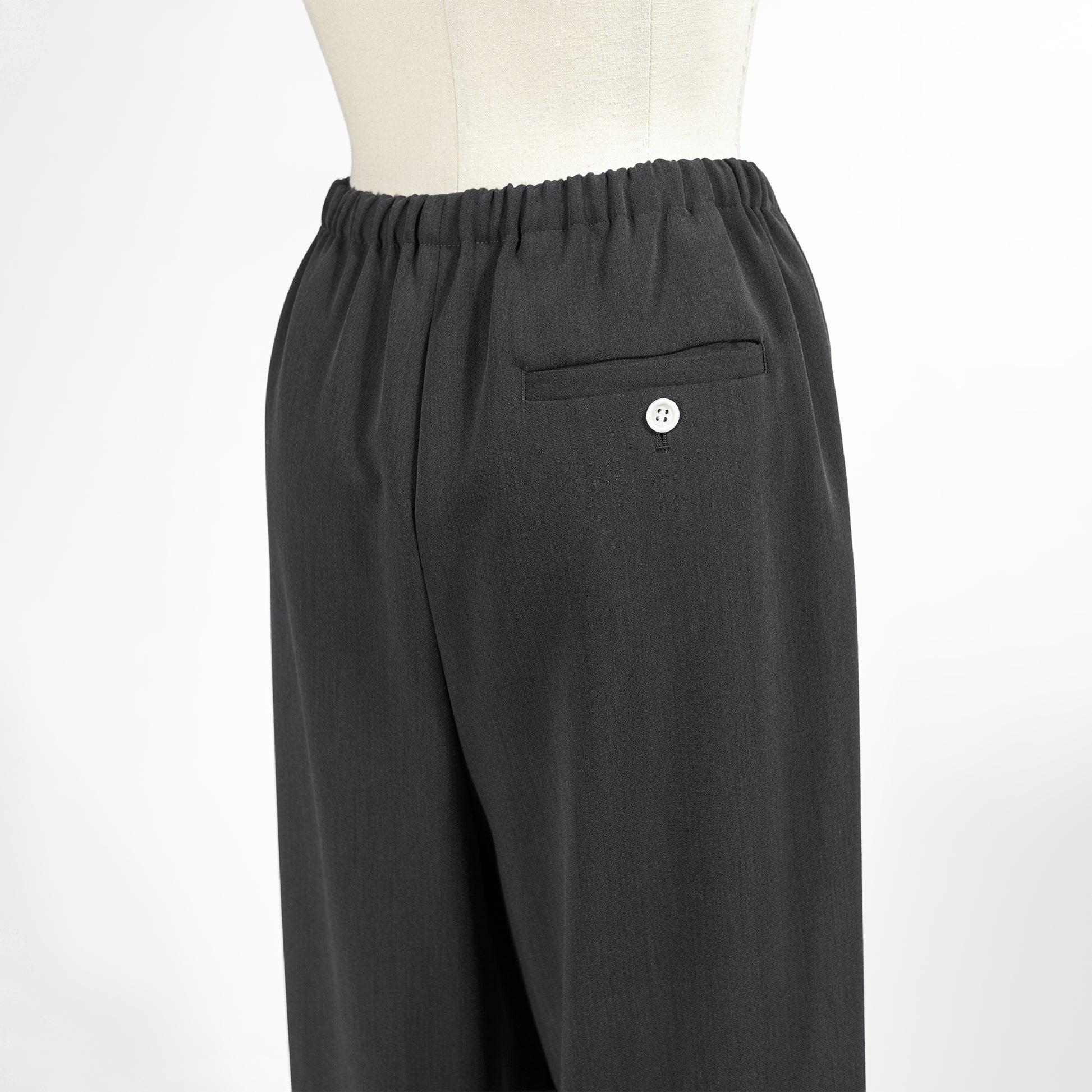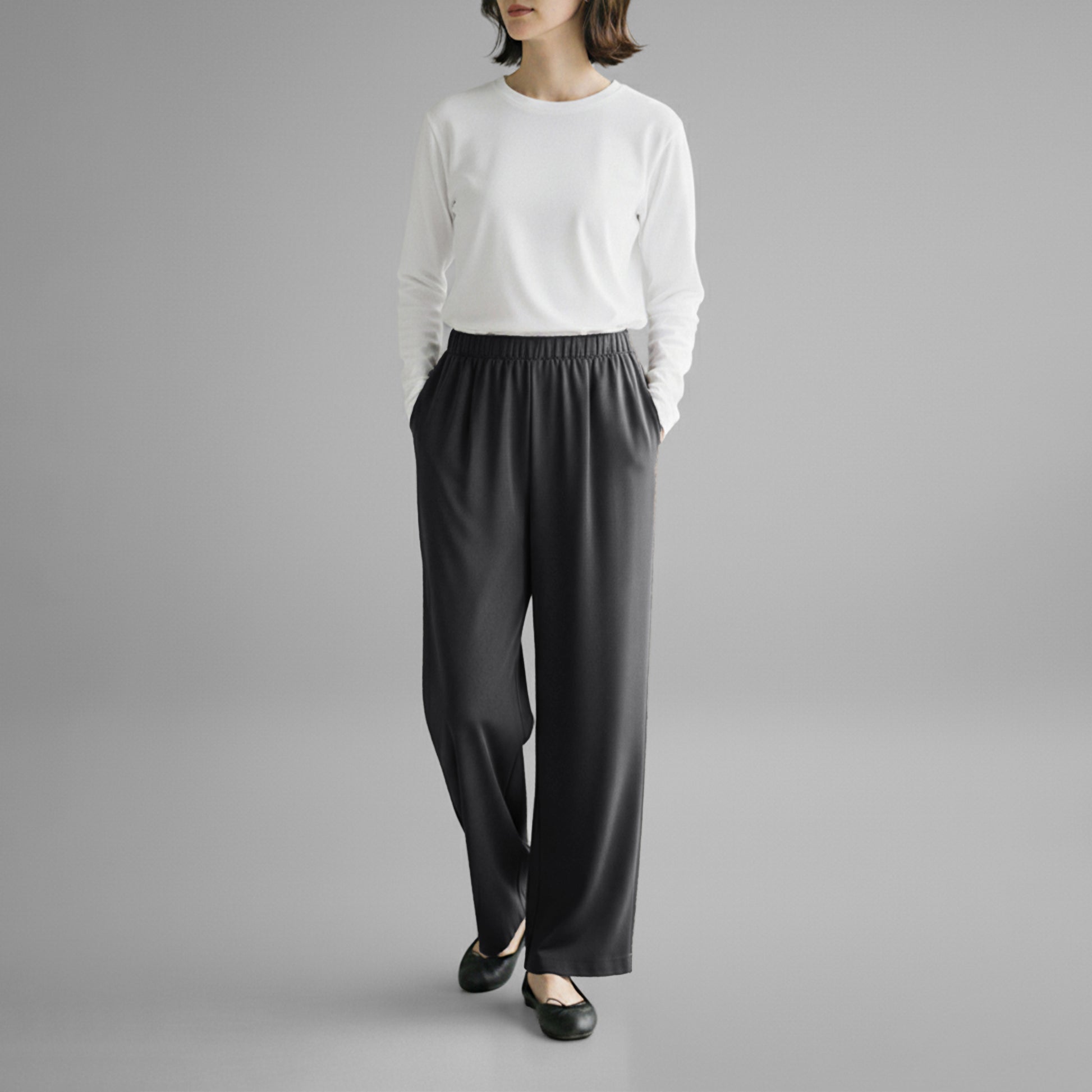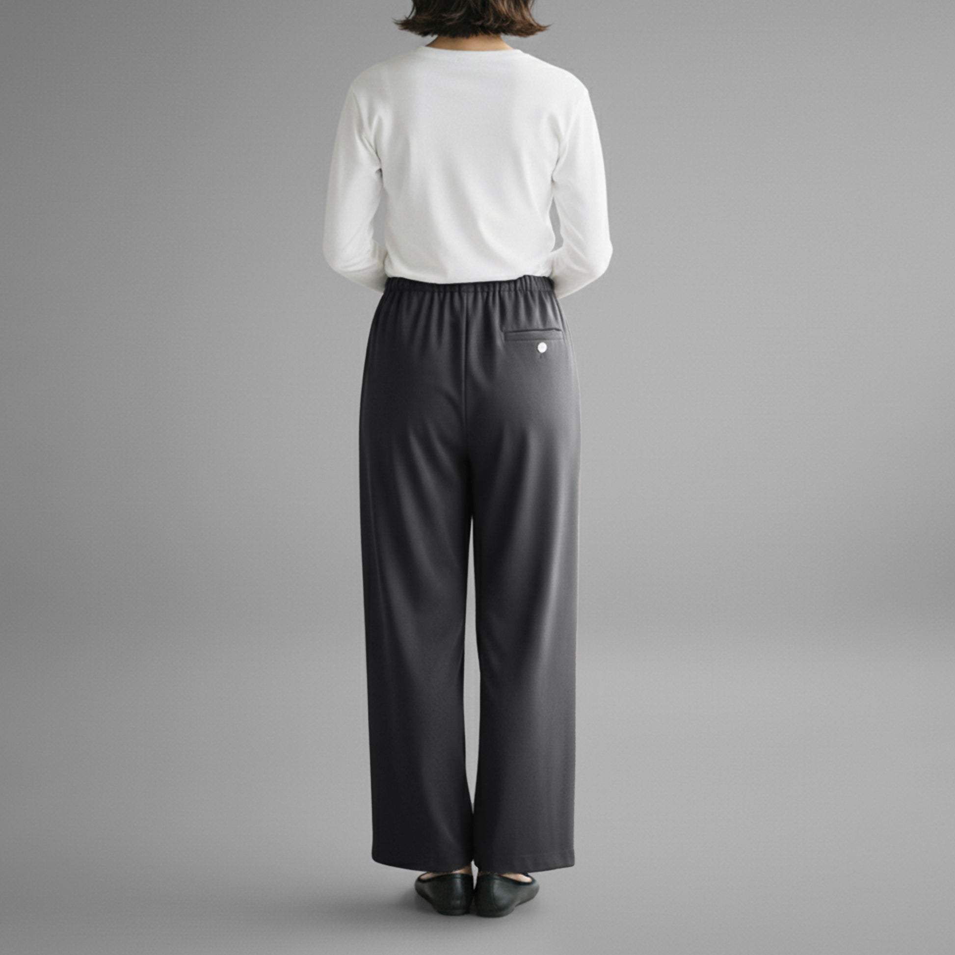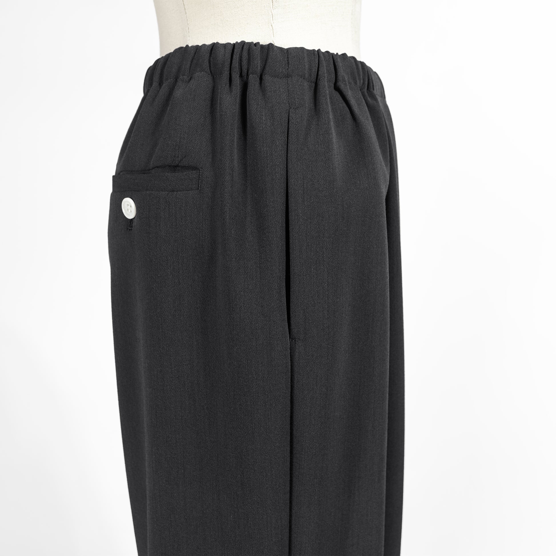 ウエストゴムのカジュアルなデザインながら、フロントタックとウール見えする上質素材のおかげで、上品にはくことができます
