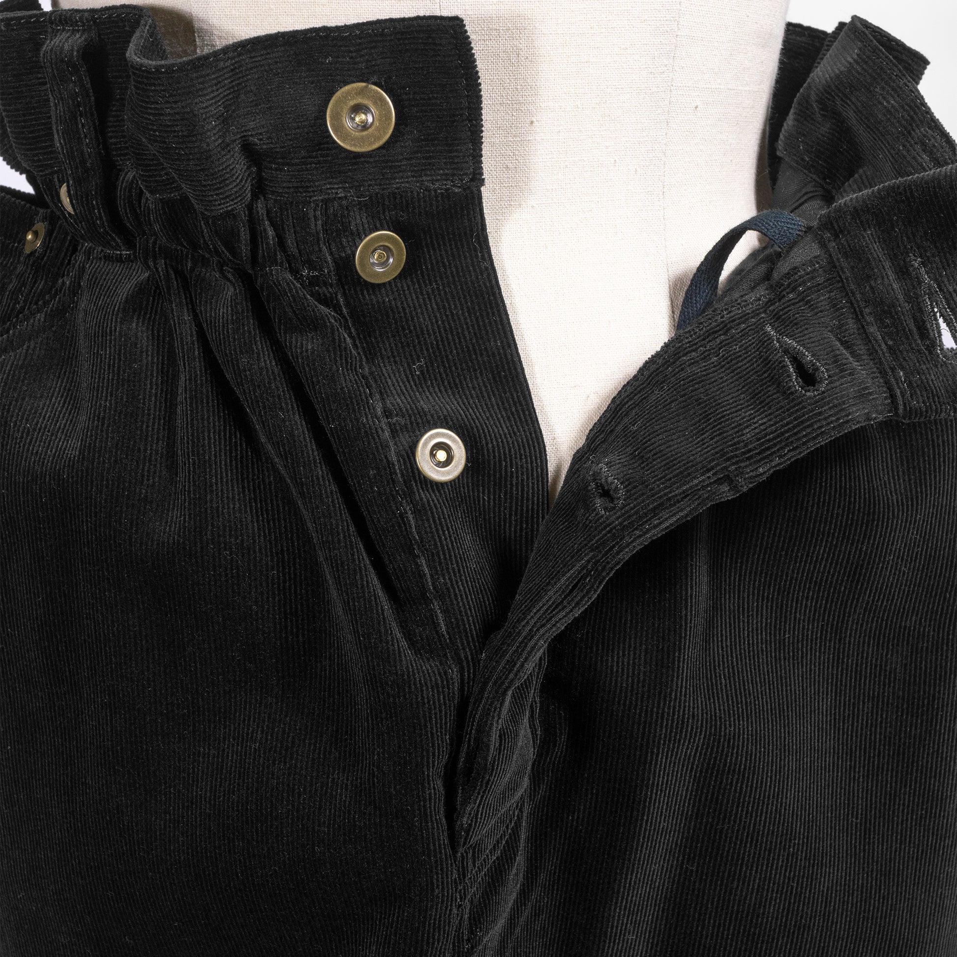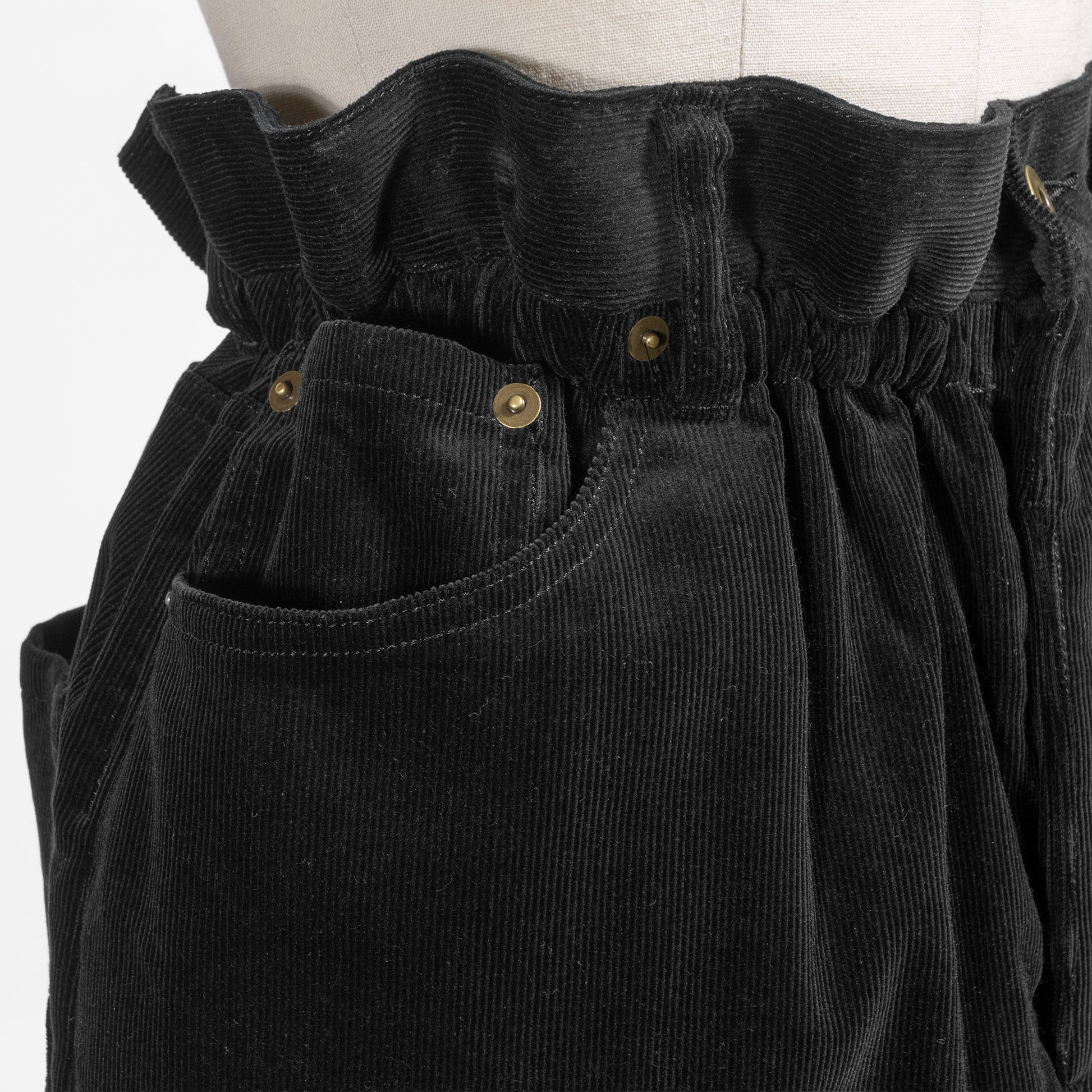 ウエスト内側のドローストリングを絞ることで生まれるギャザーディテール、デニム風の5ポケット、エレガントなマキシ丈がデザインポイント