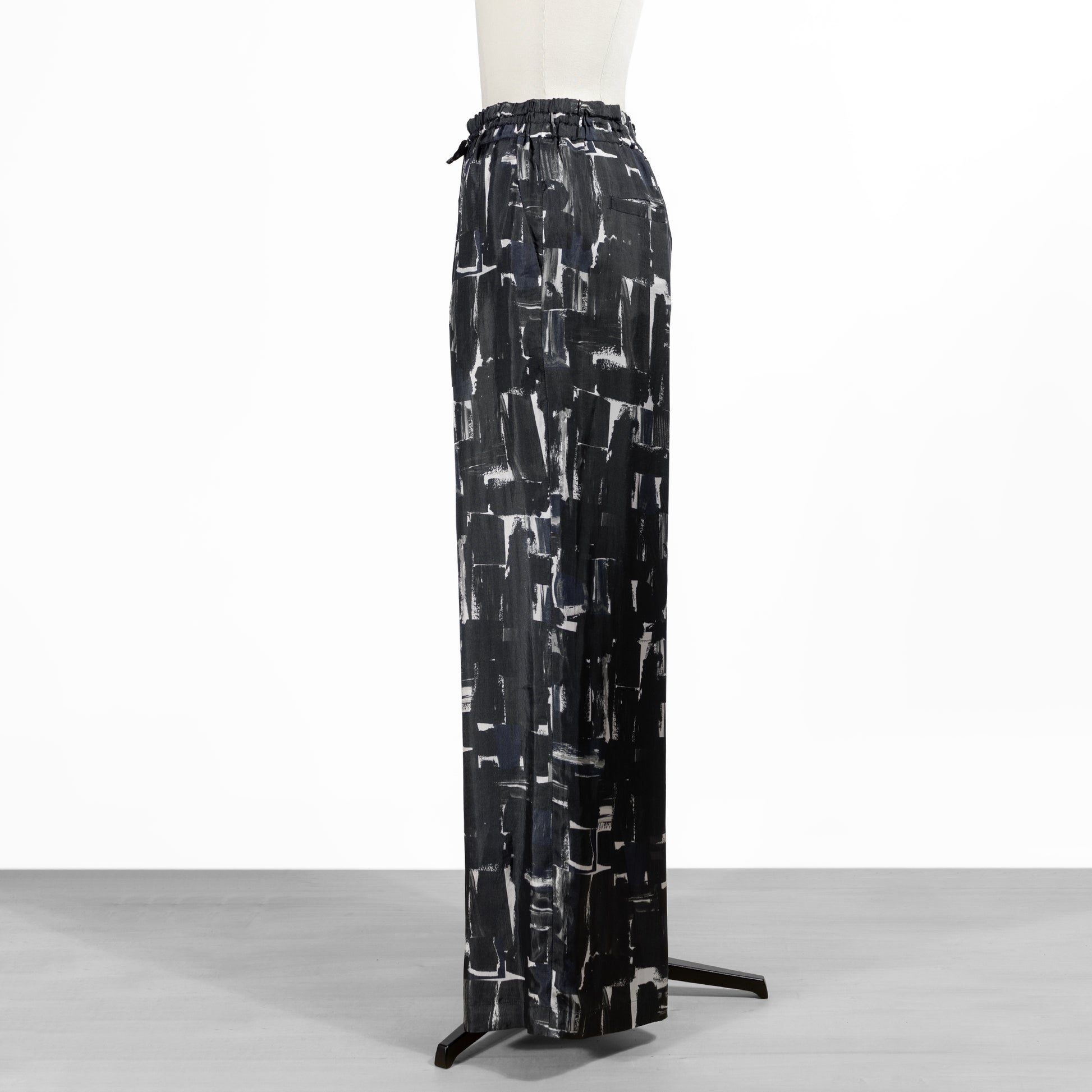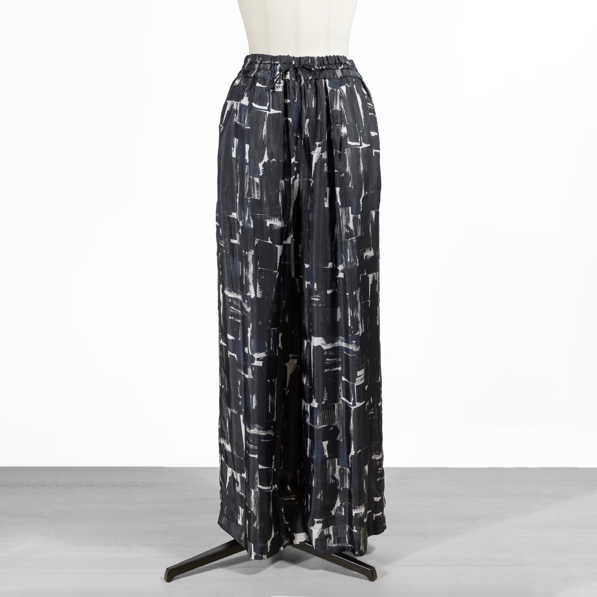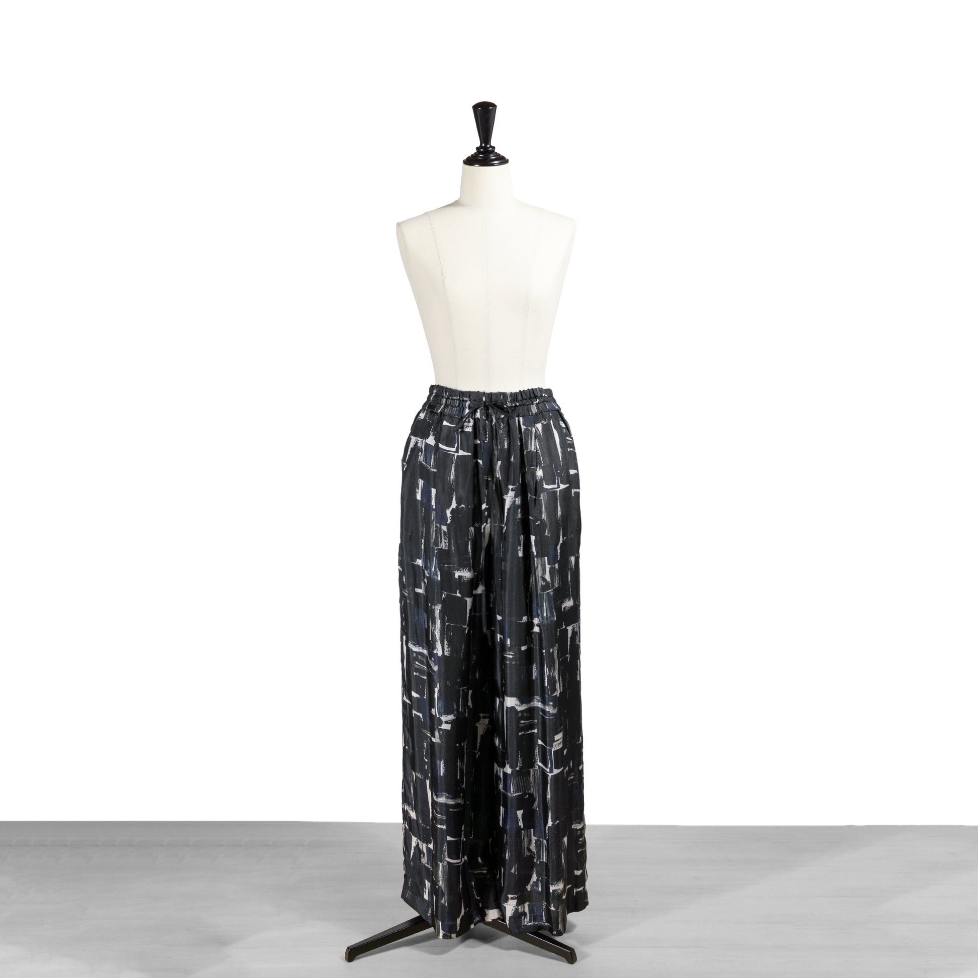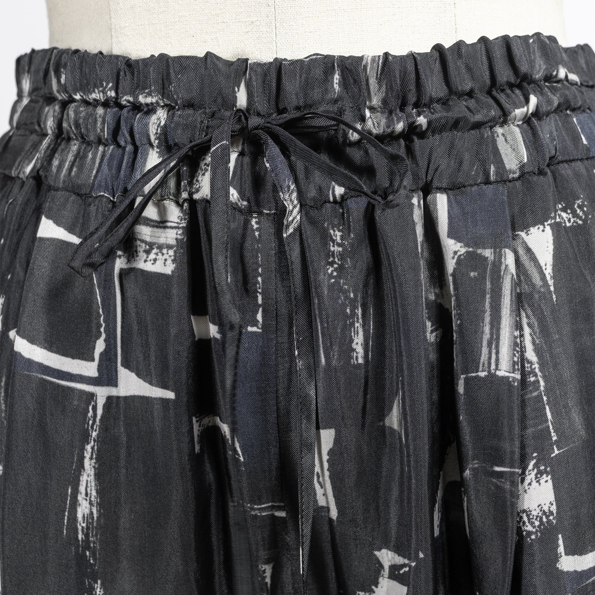 ウエストゴムのリラックス感漂うデザインに、抽象画のように描かれたシックなブラッシュペインティング柄がアクセント