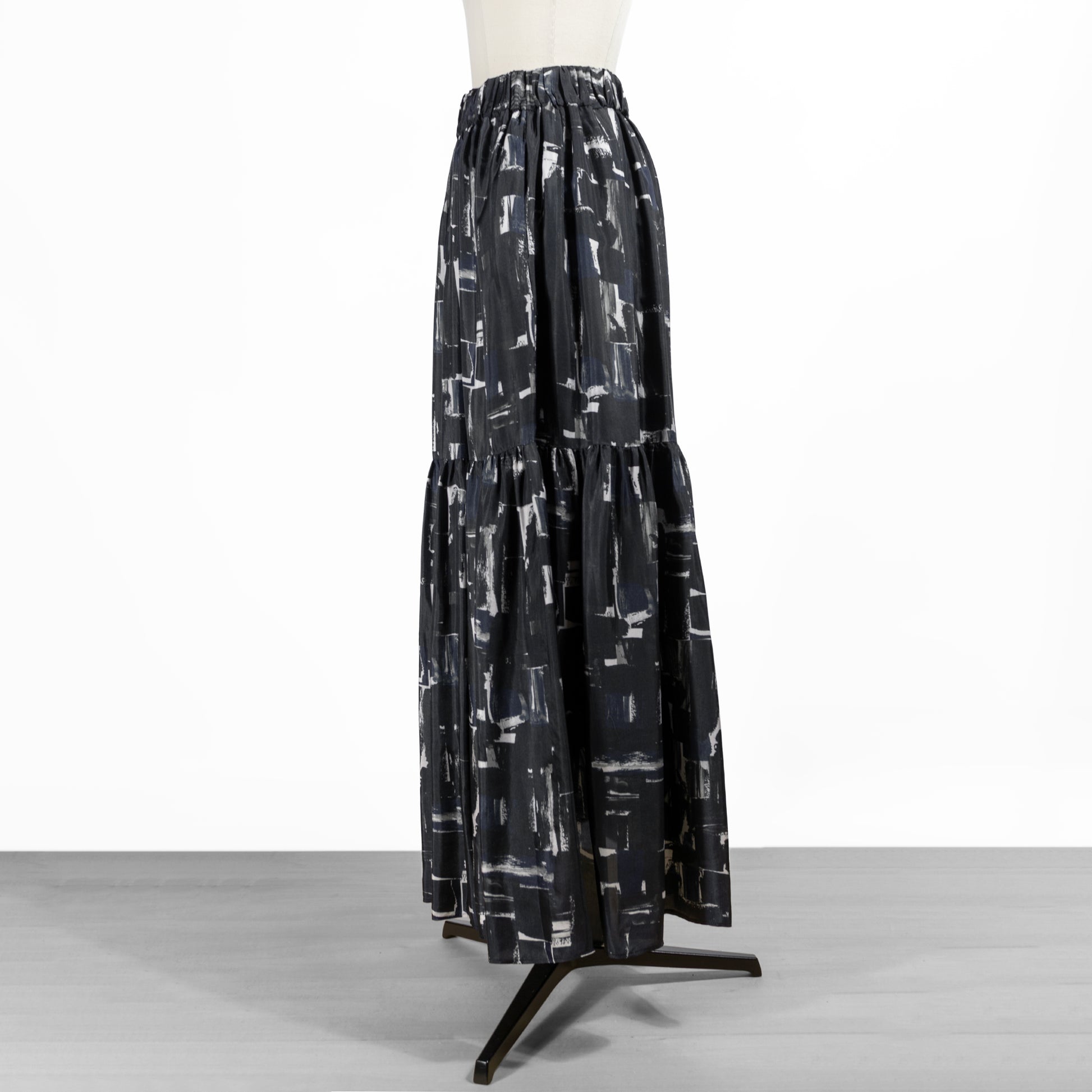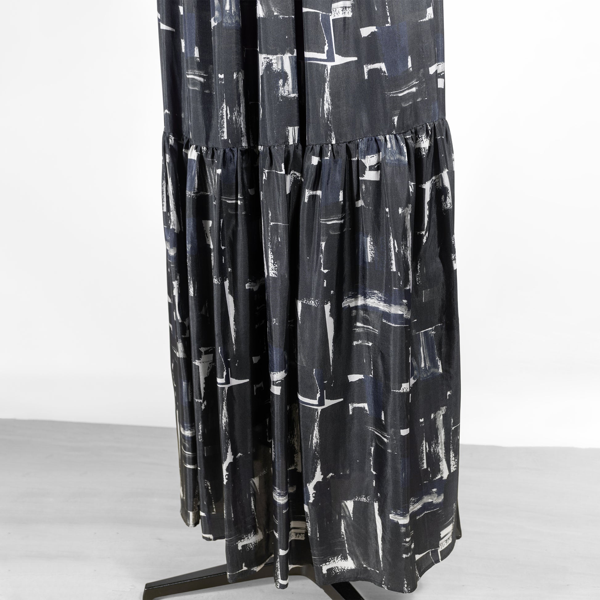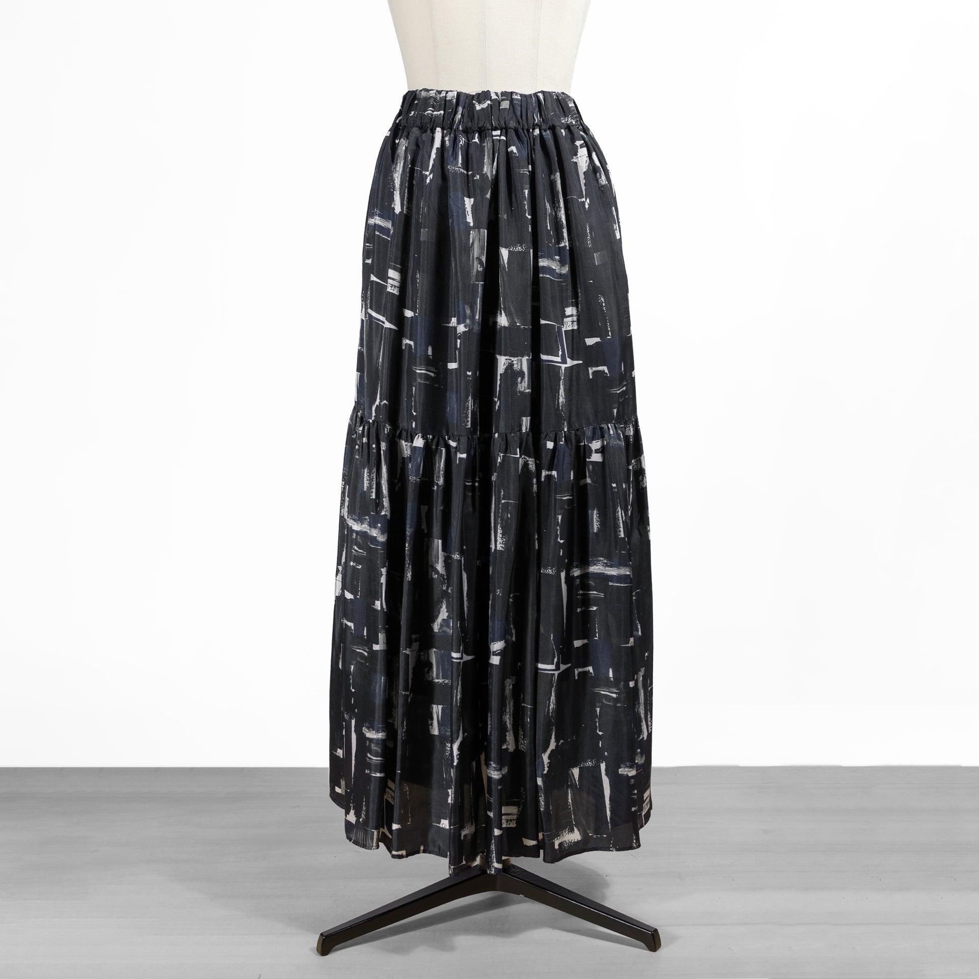 ティアードディテールのレディなデザインに、抽象画のように描かれたシックなブラッシュペインティング柄がアクセントをプラス