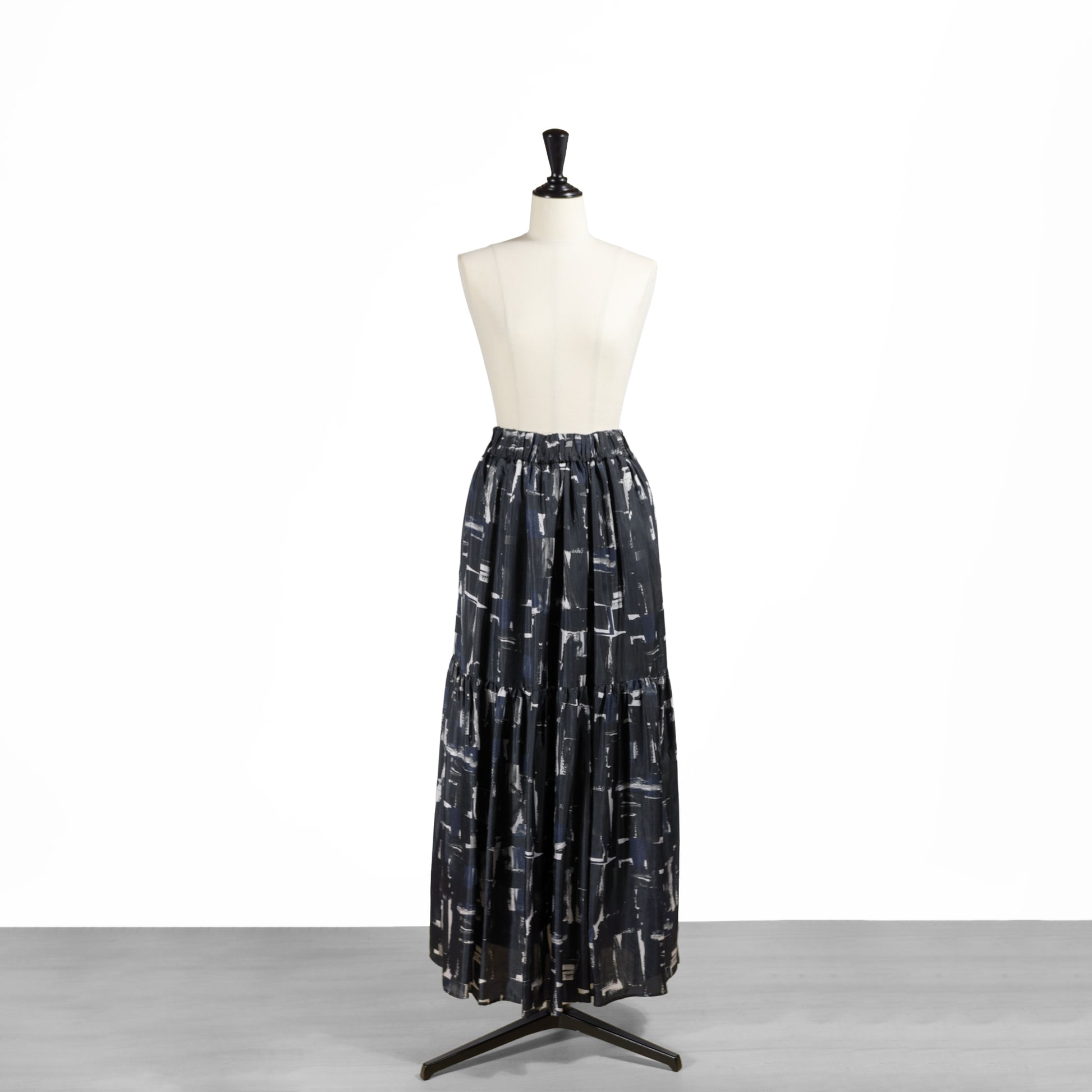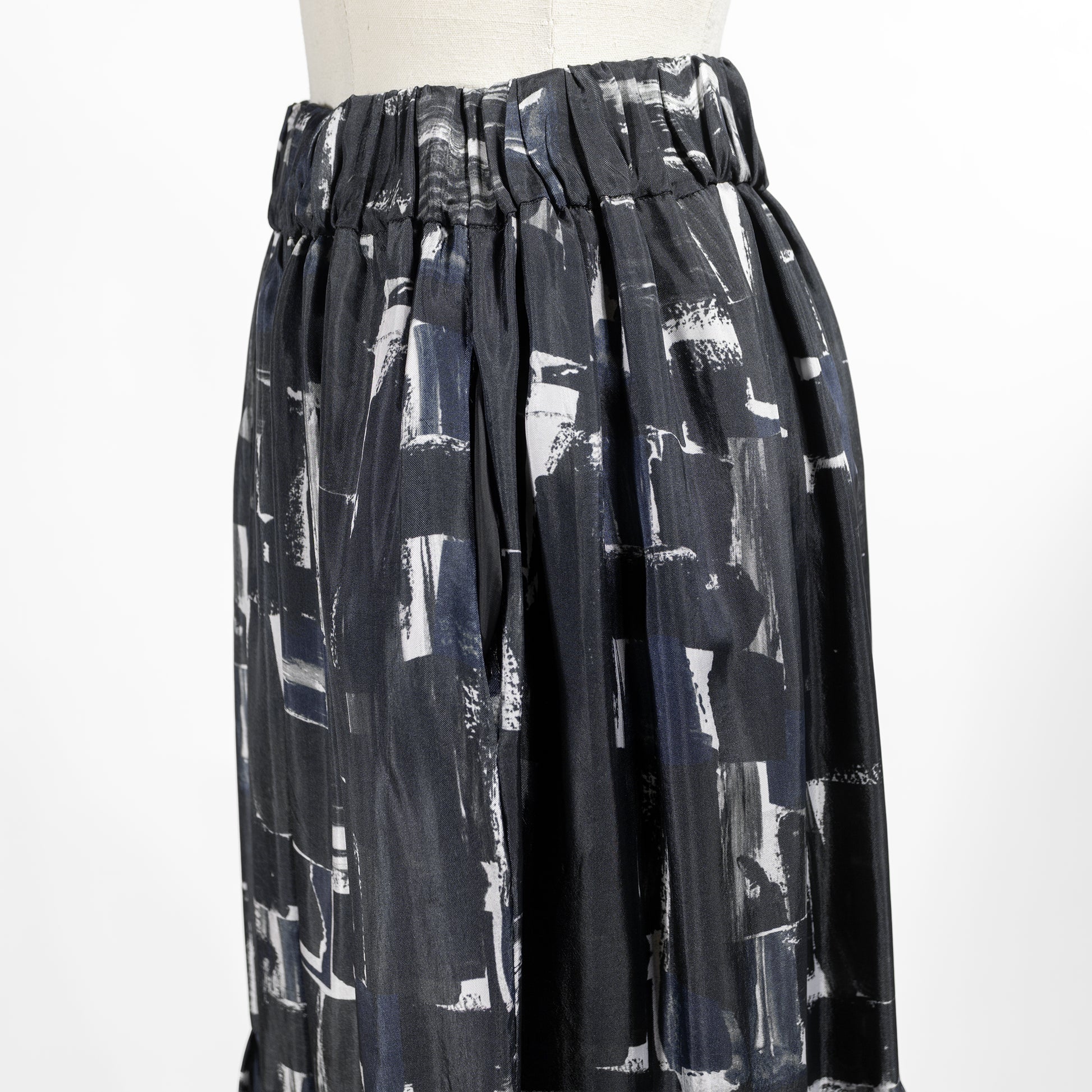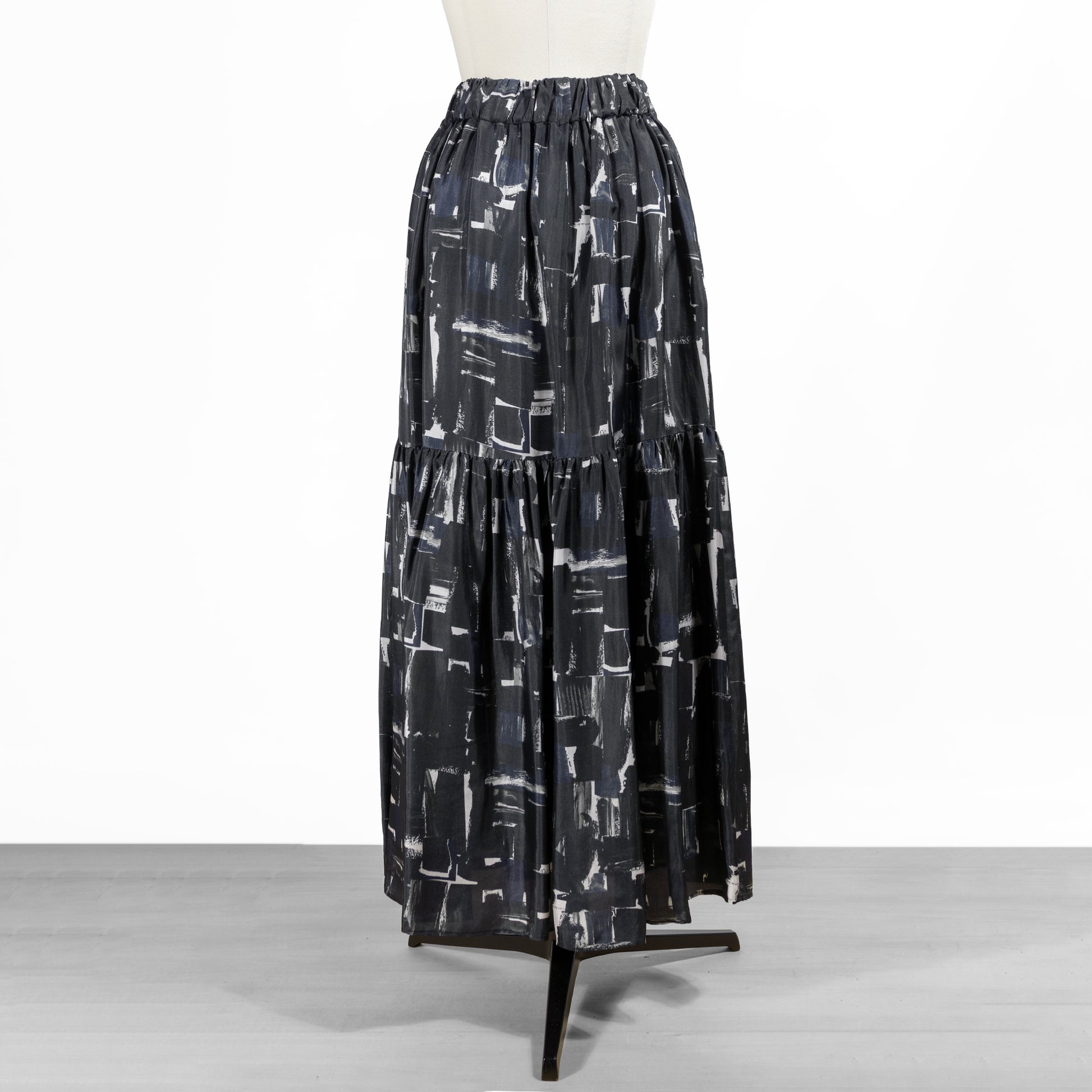 ティアードディテールのレディなデザインに、抽象画のように描かれたシックなブラッシュペインティング柄がアクセントをプラス