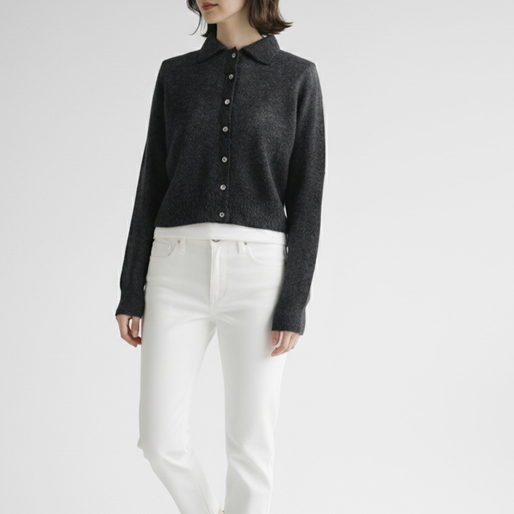 カーディガンとして羽織るのはもちろん、ボタンを留めてポロニット感覚で着るのもOK