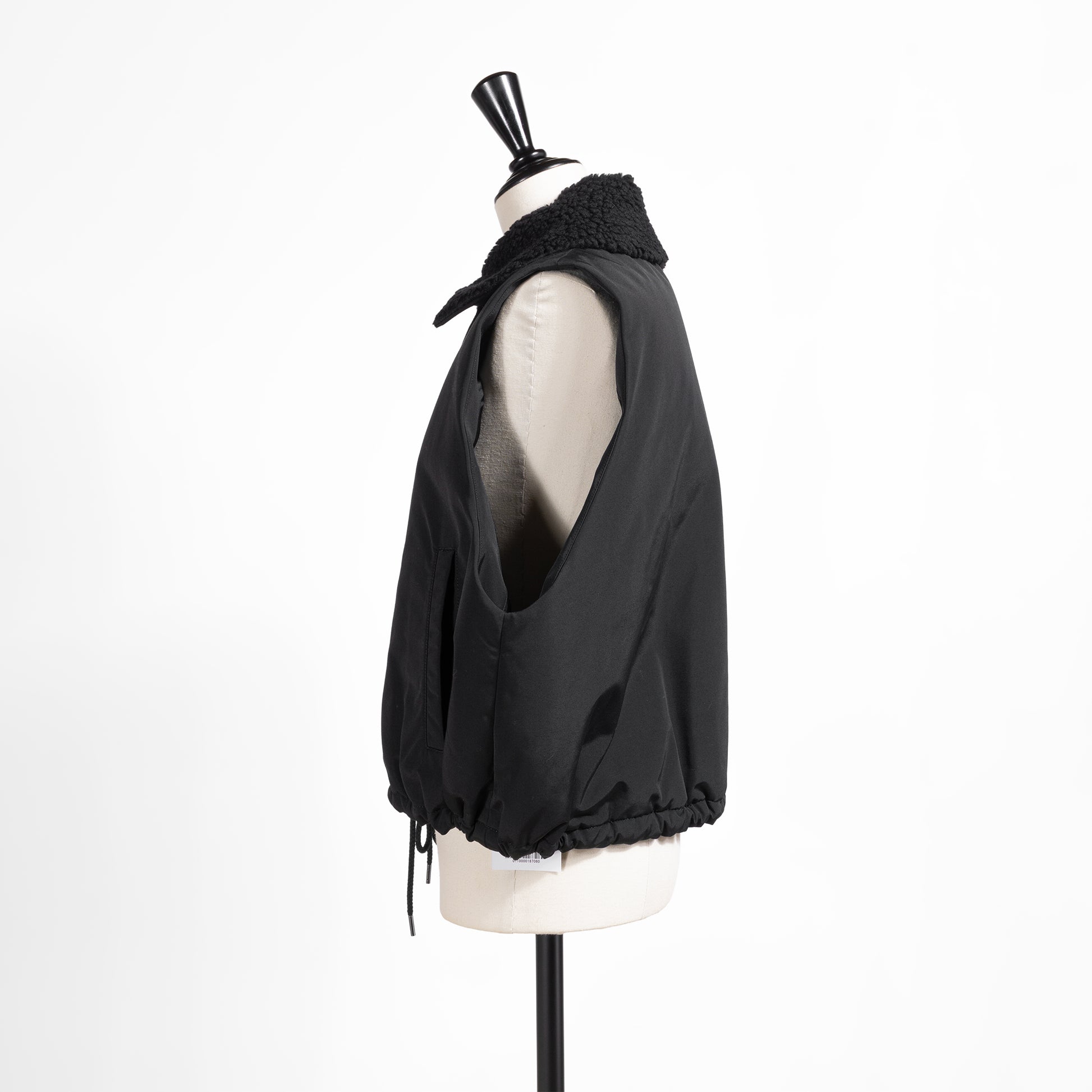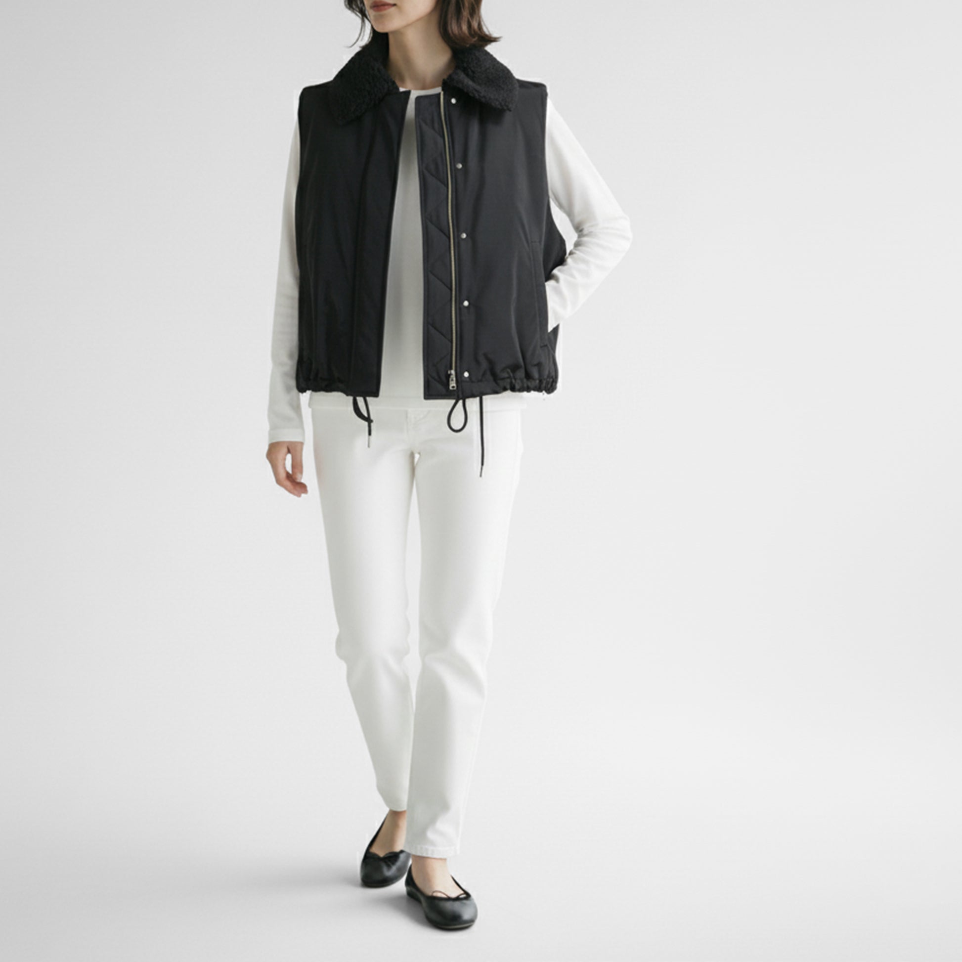 ウール混ボア素材の襟が季節感を演出するカジュアルモードなジレ