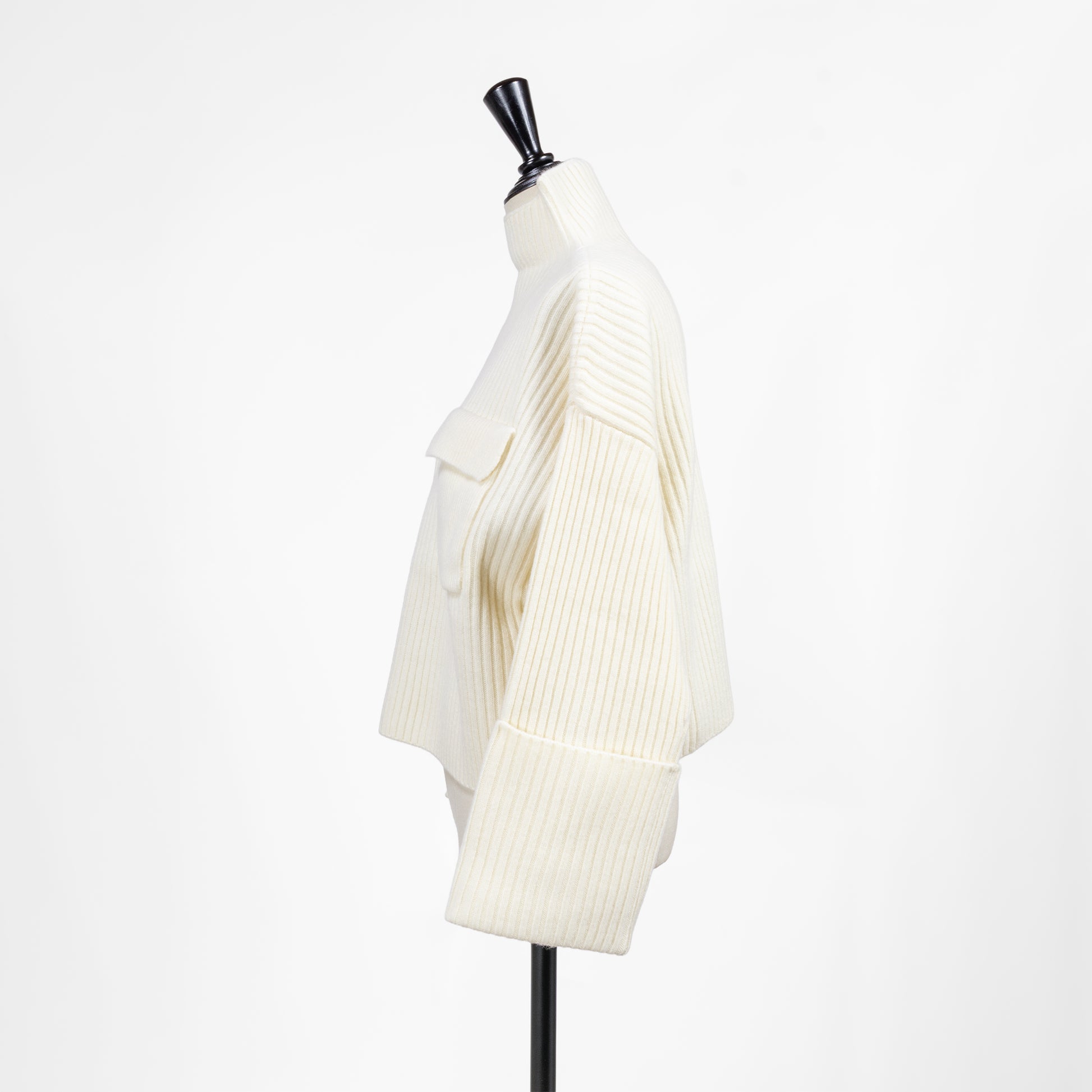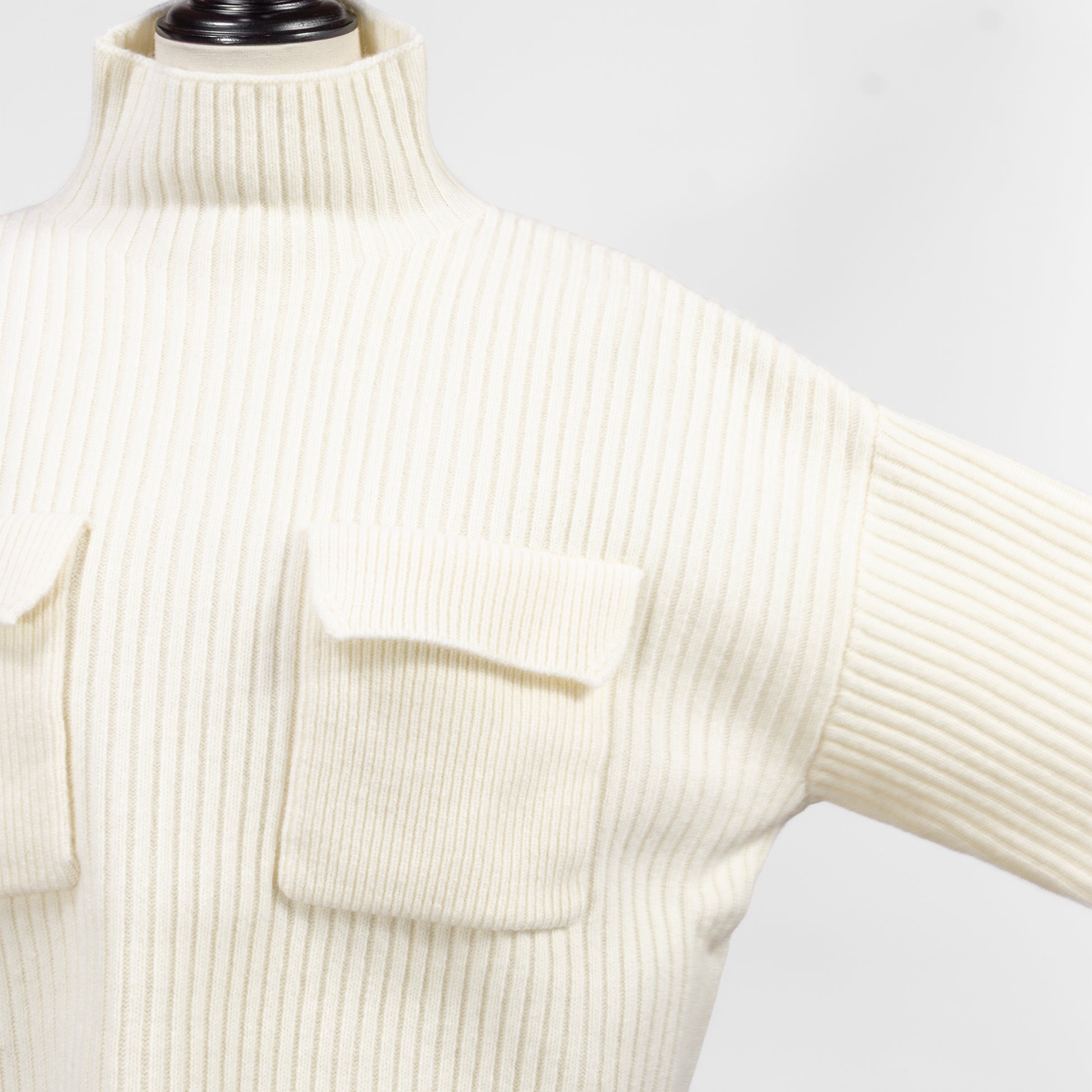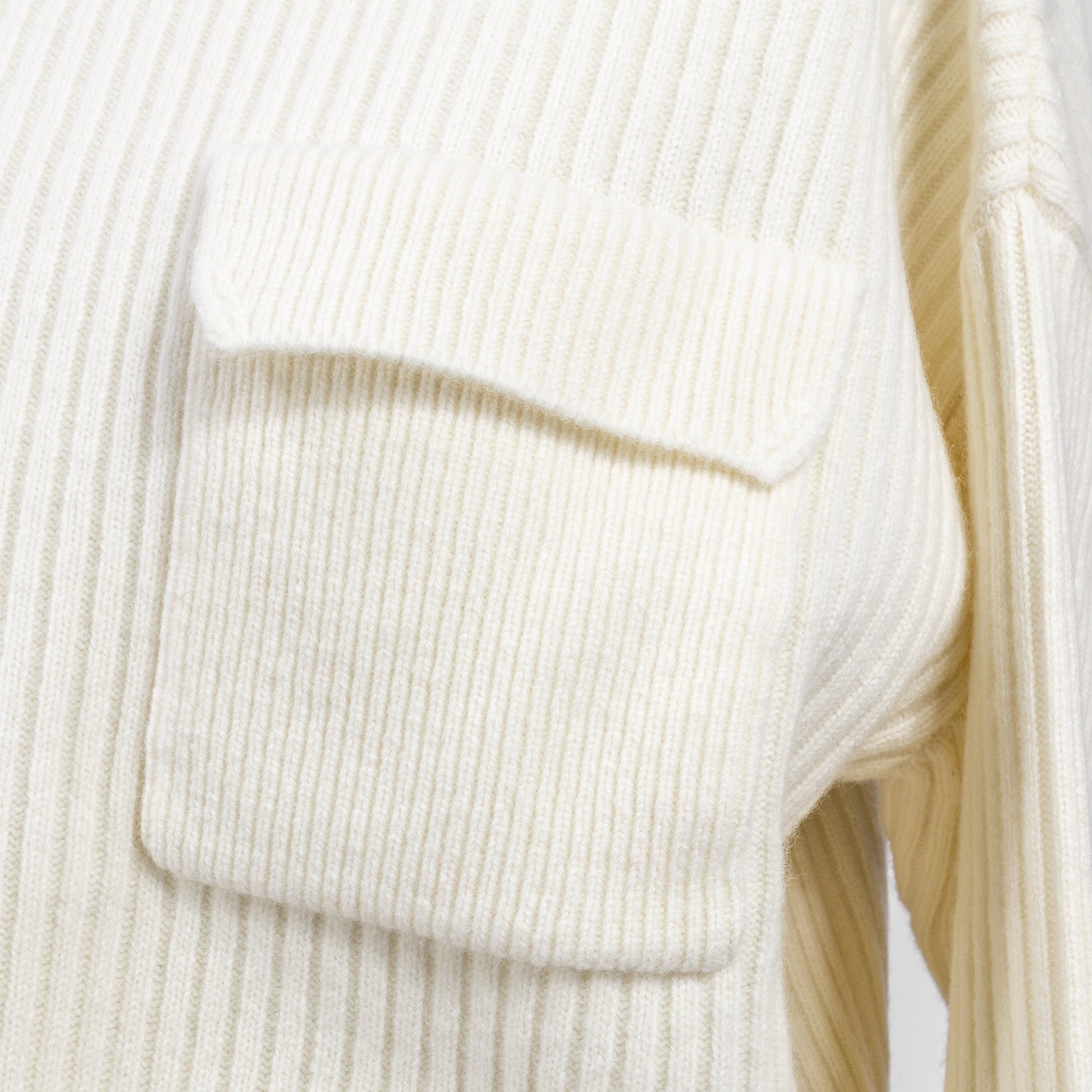 フラップ付きのポケットと、長めのカフスがポイントになったリブ編みニット
