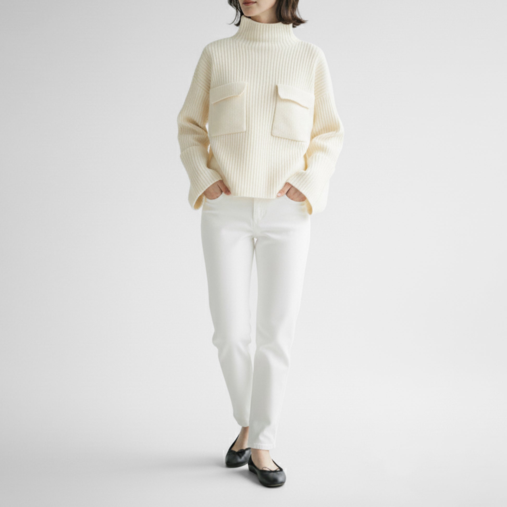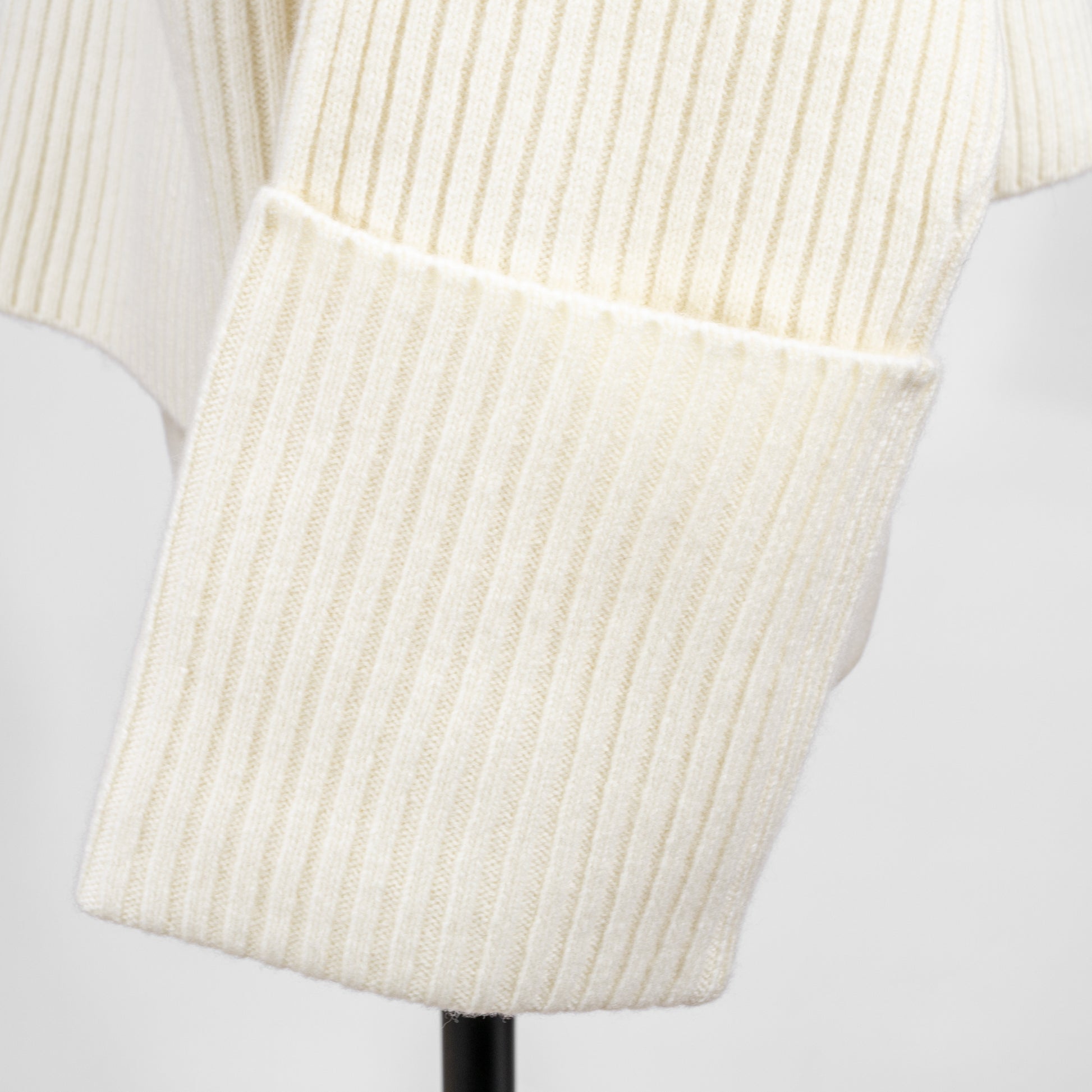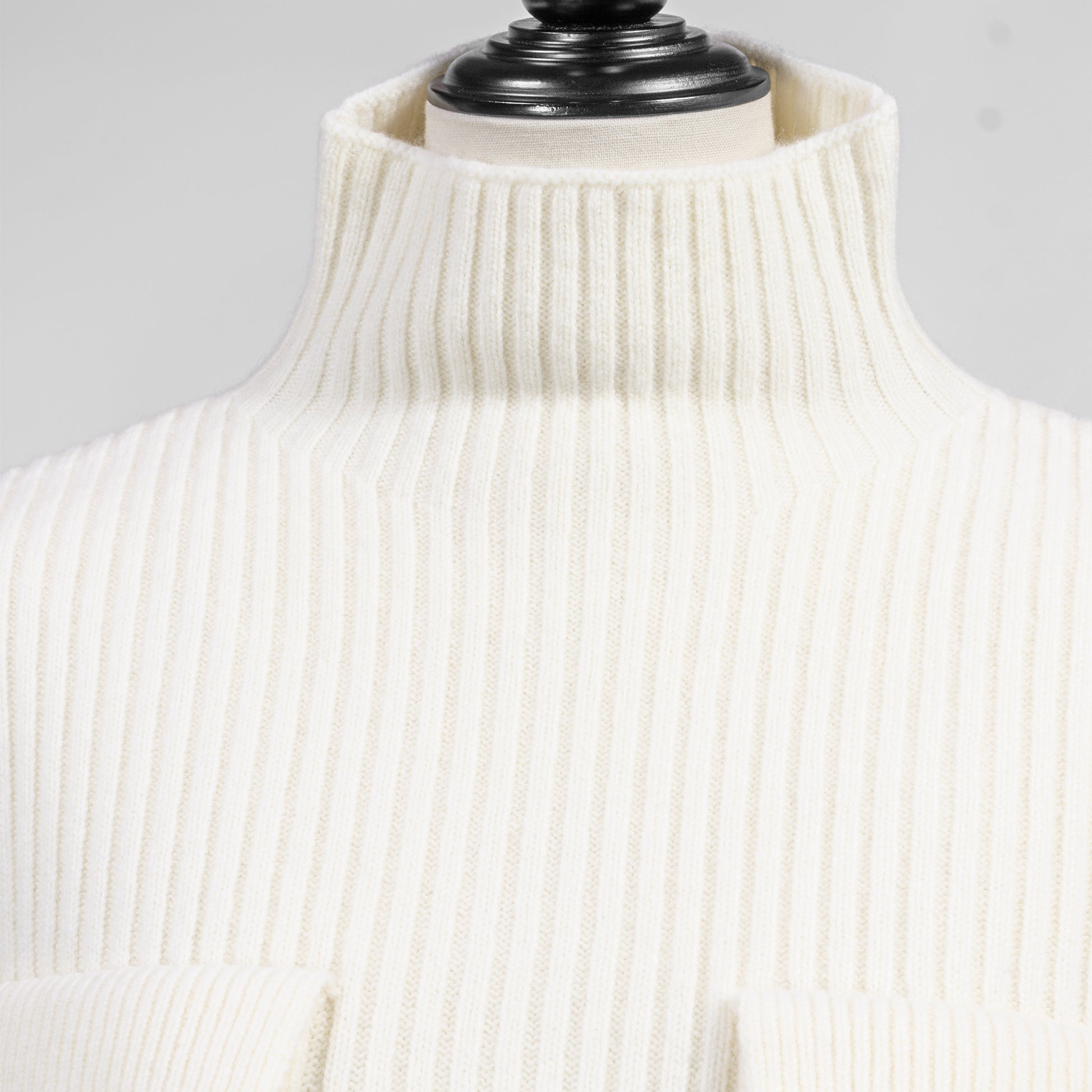 フラップ付きのポケットと、長めのカフスがポイントになったリブ編みニット