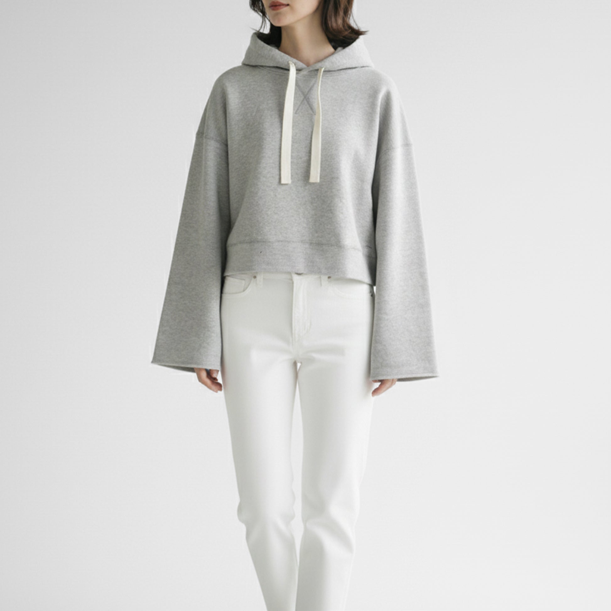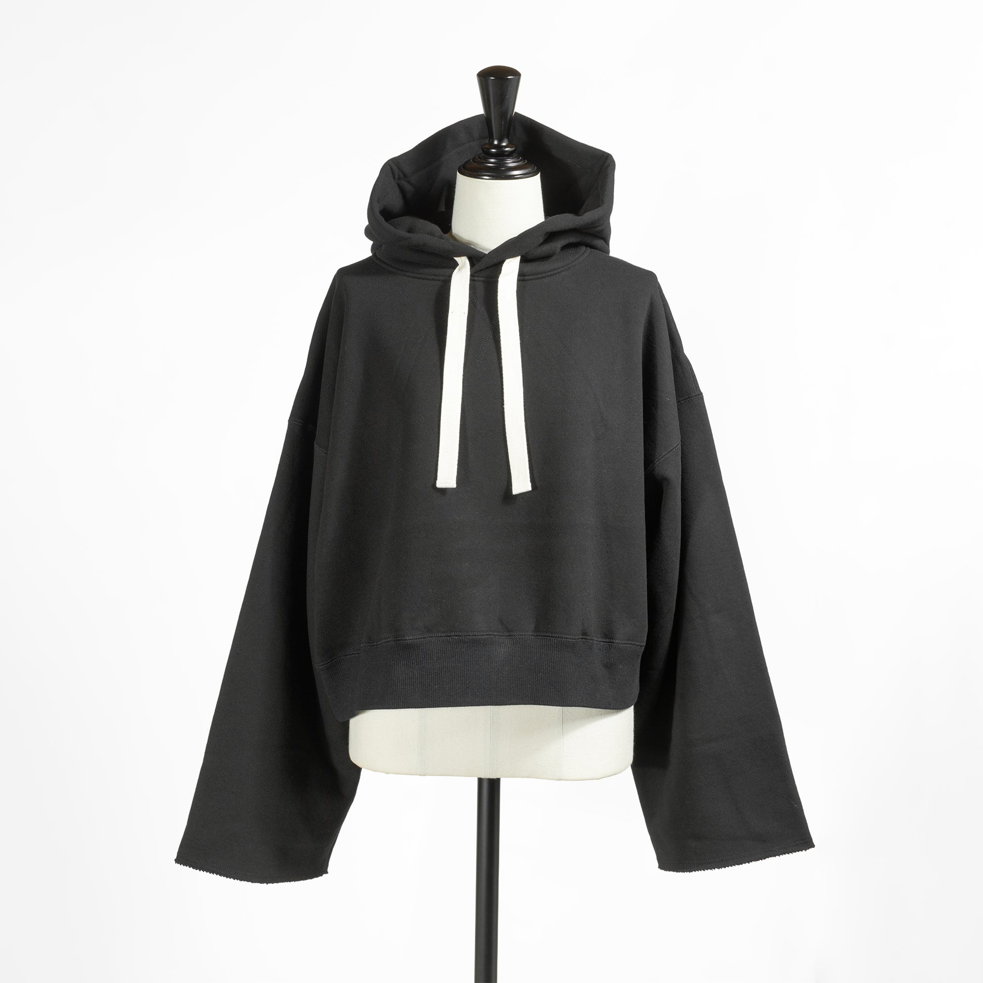 スッキリとしたクロップド丈と長めのワイドスリーブがポイントになったパーカーです