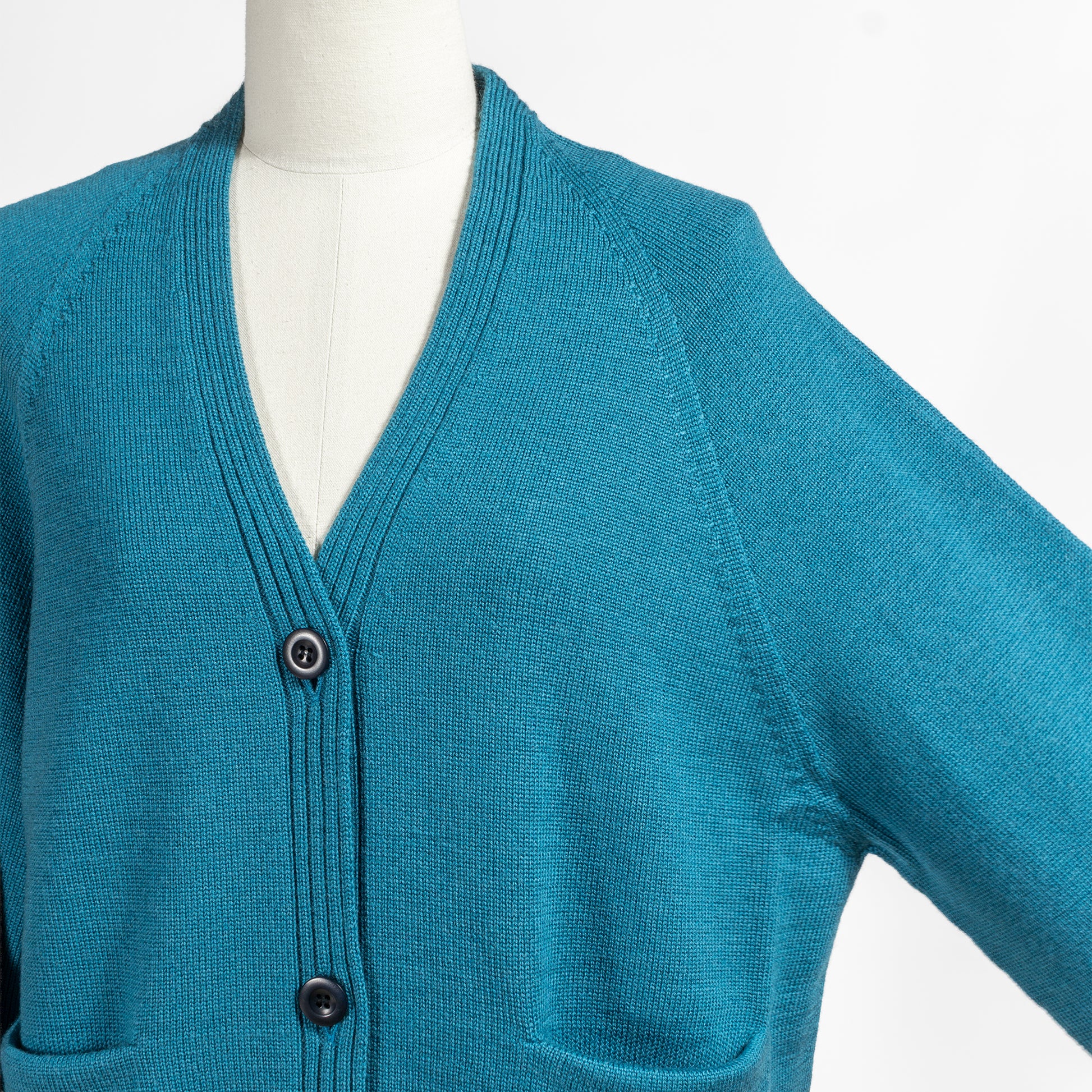 スッキリとした着丈と前立ての畦編みがポイントになった、SARAHWEARのロングセラーカーディガン