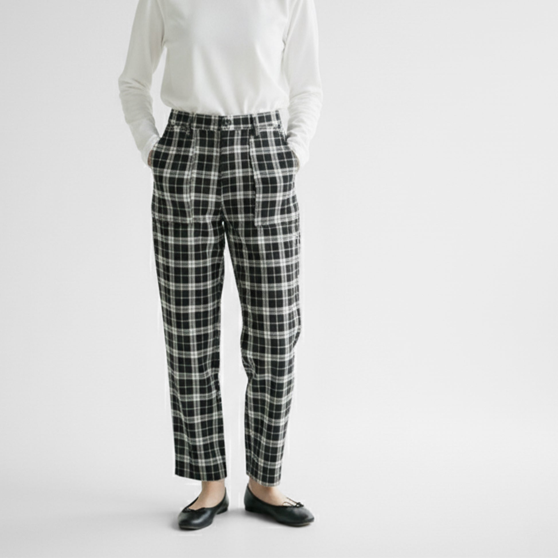 モノトーンのシックなタータンチェックは色合わせもしやすく、カジュアルからキレイめまで幅広いコーディネートをお楽しみいただけます