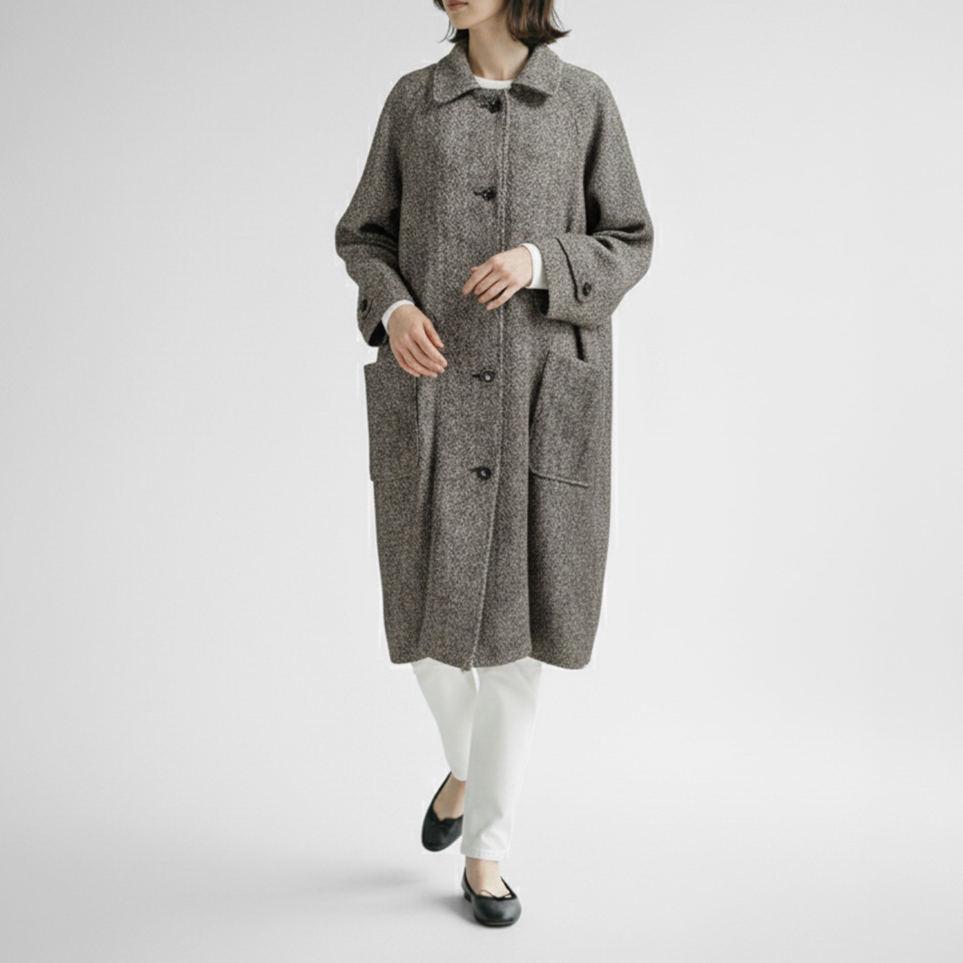流行に左右されないデザインと上質な素材使い、さらに体型の変化も気にならないゆったりとしたシルエットで、長く愛用いただけるタイムレスなコートとです