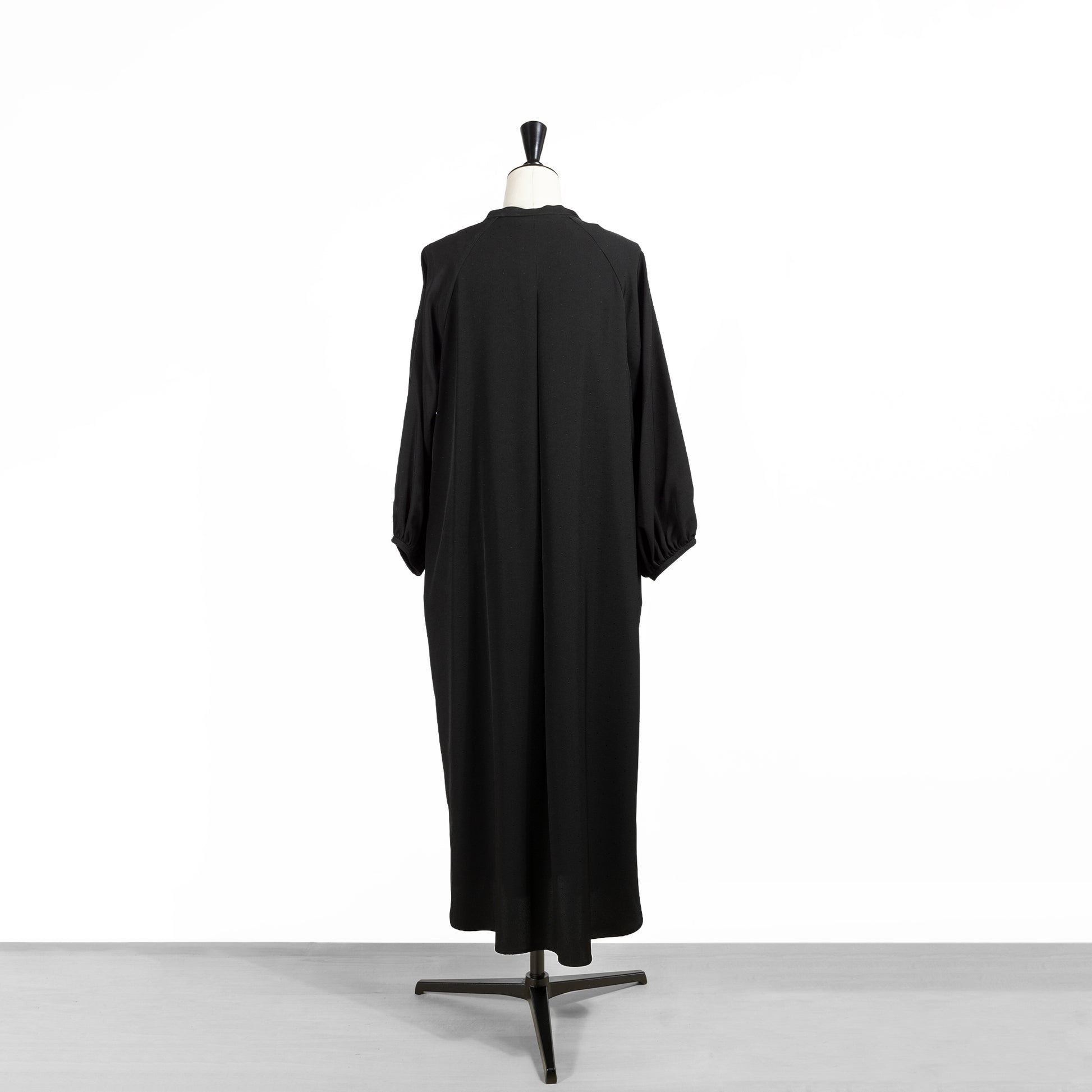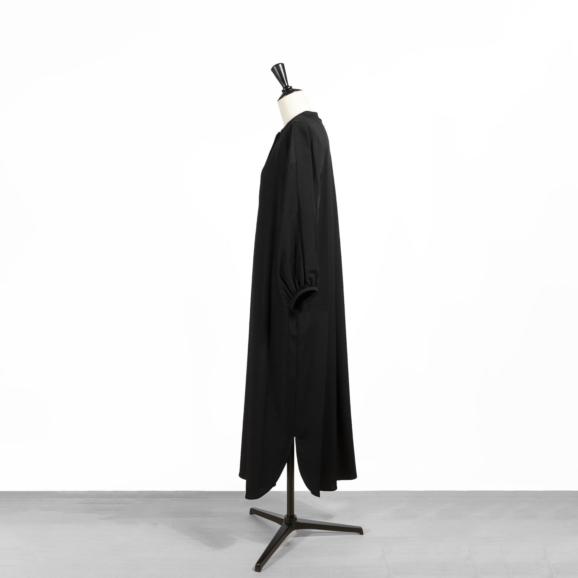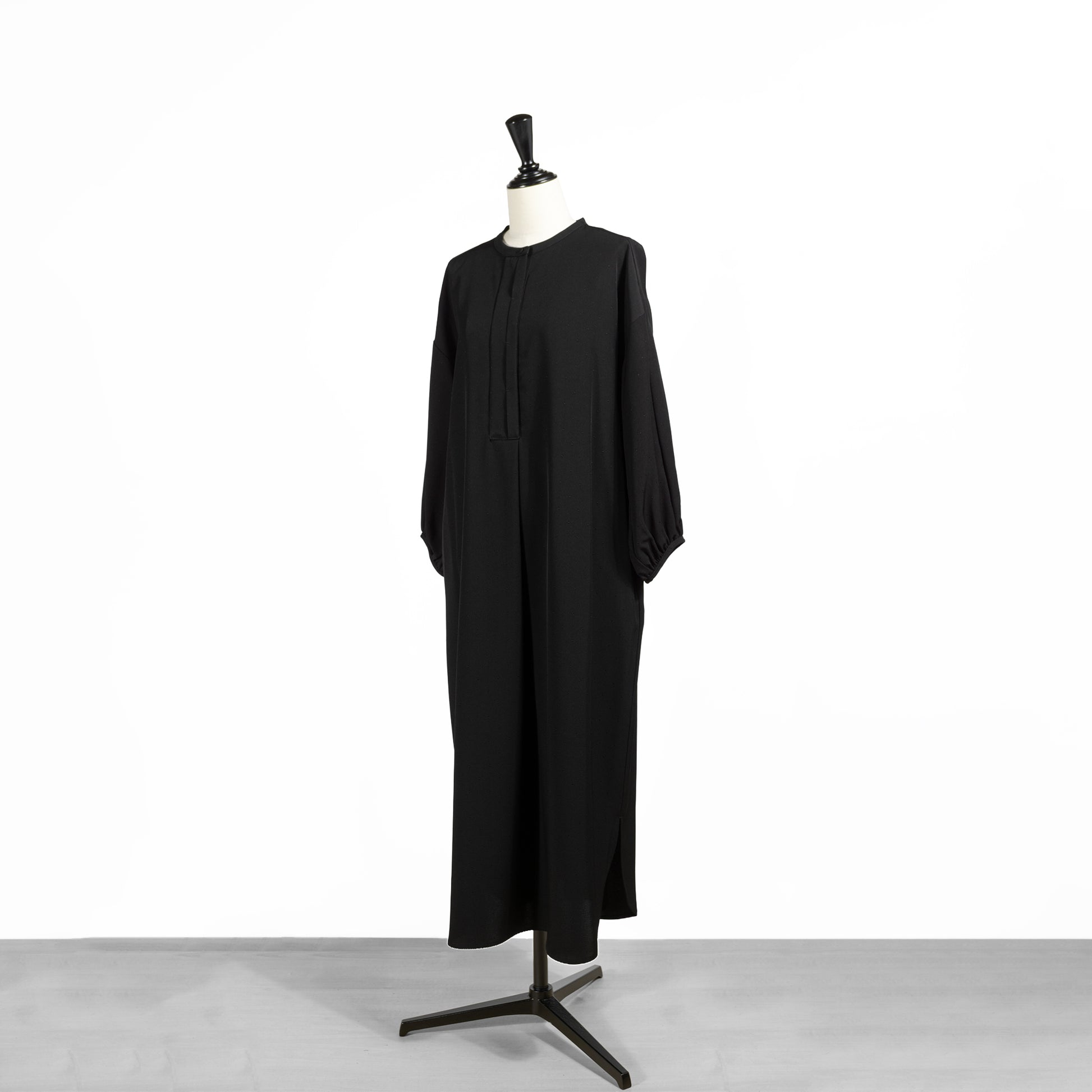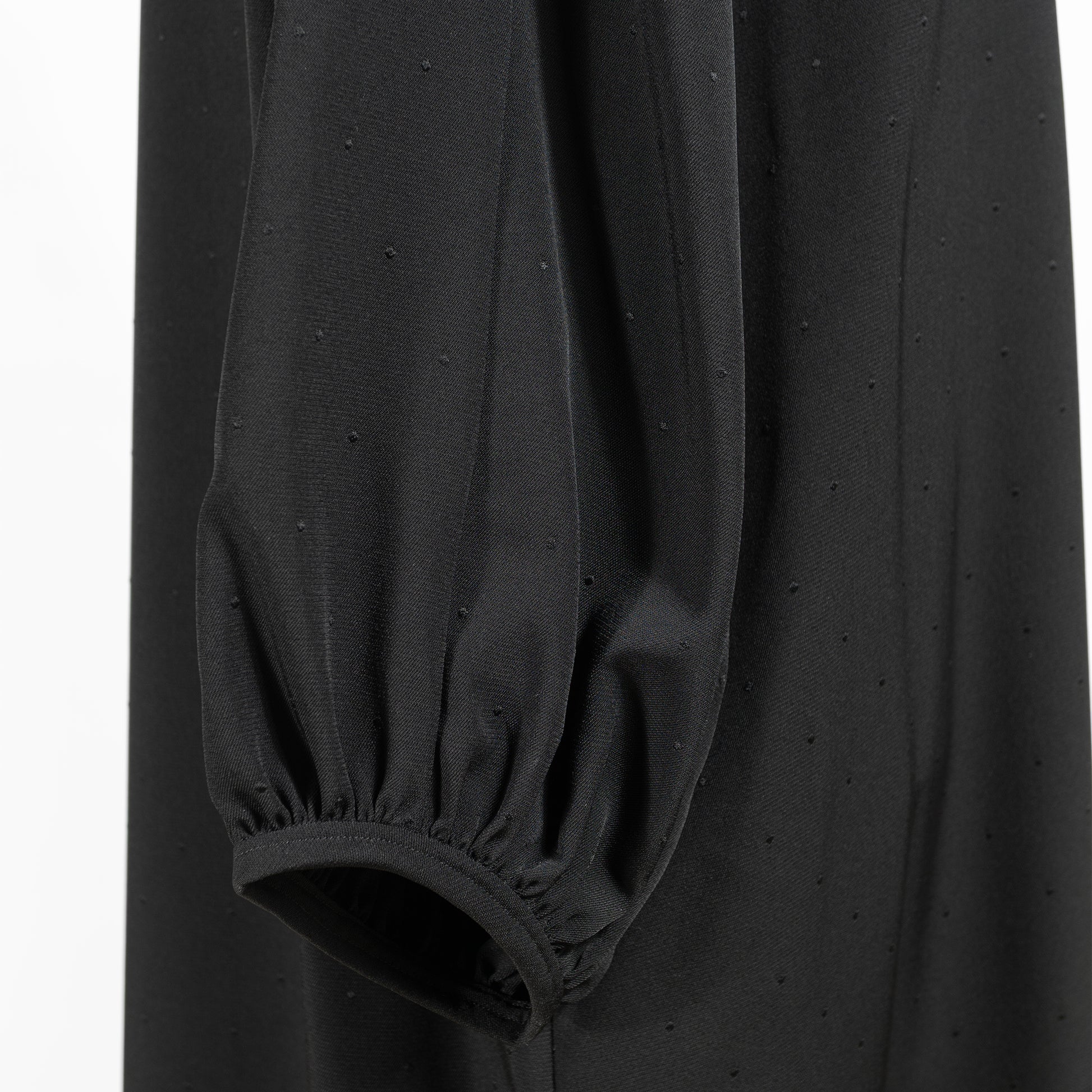 凝った比翼仕立てと、女性らしいパフスリーブが目を惹くシックなブラックドレス
