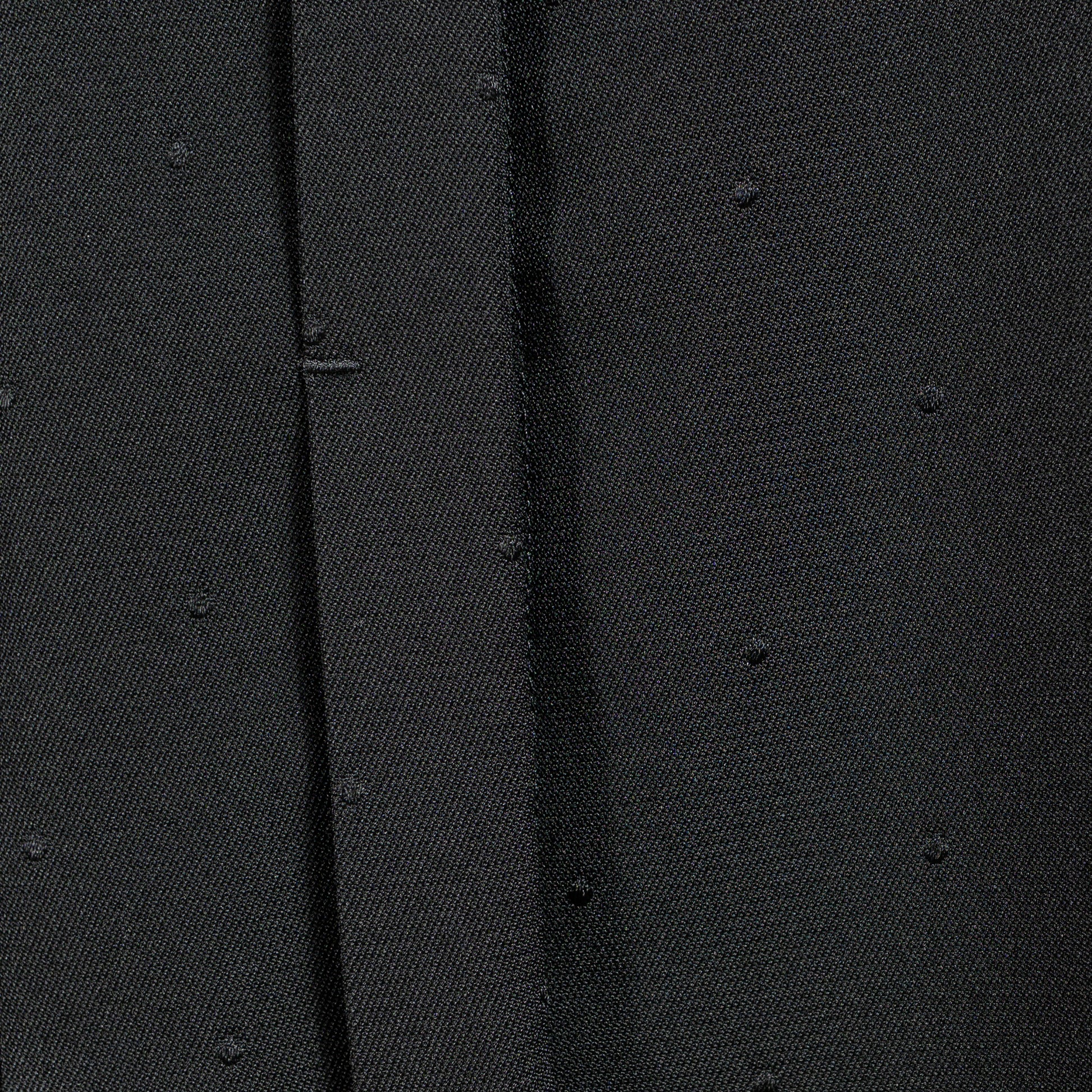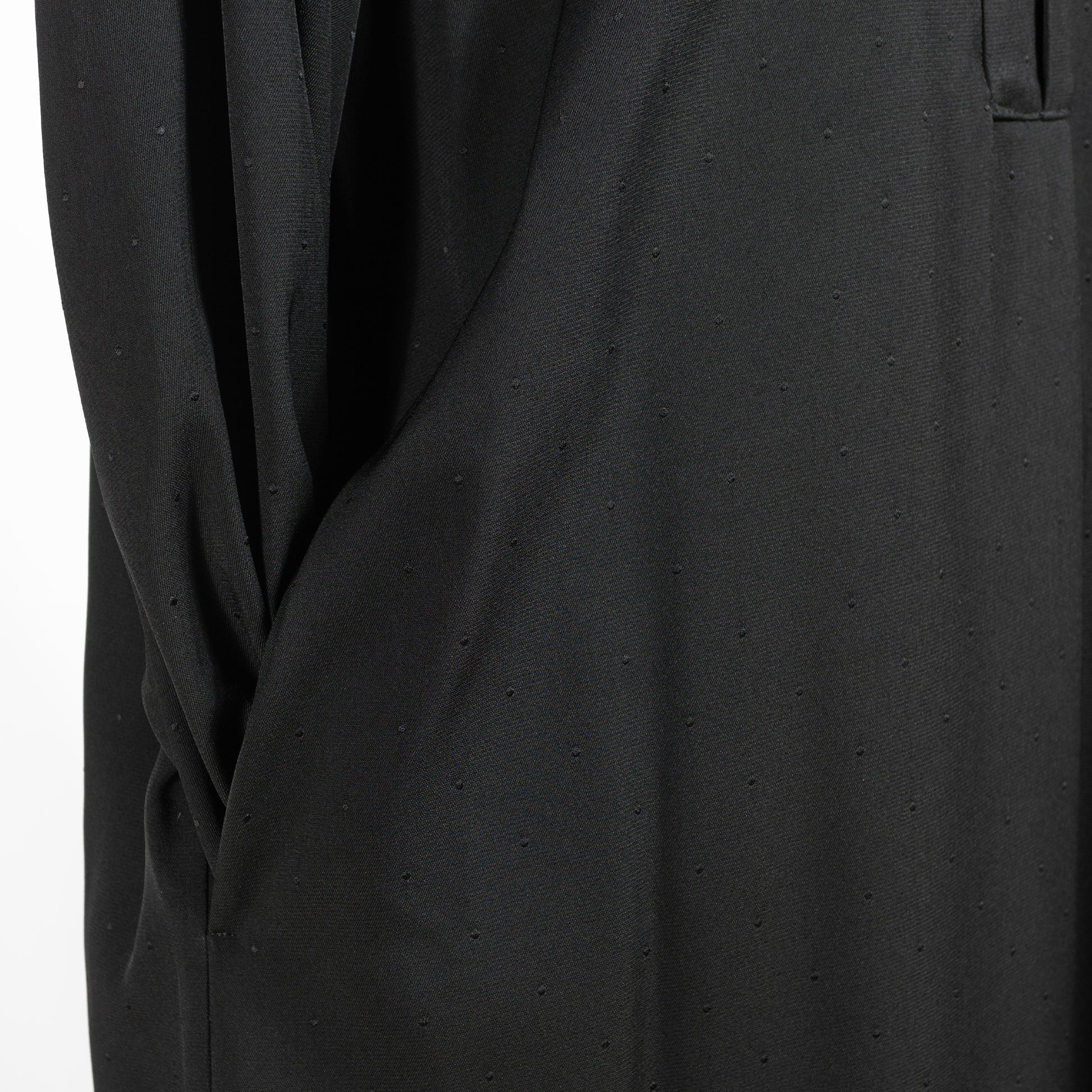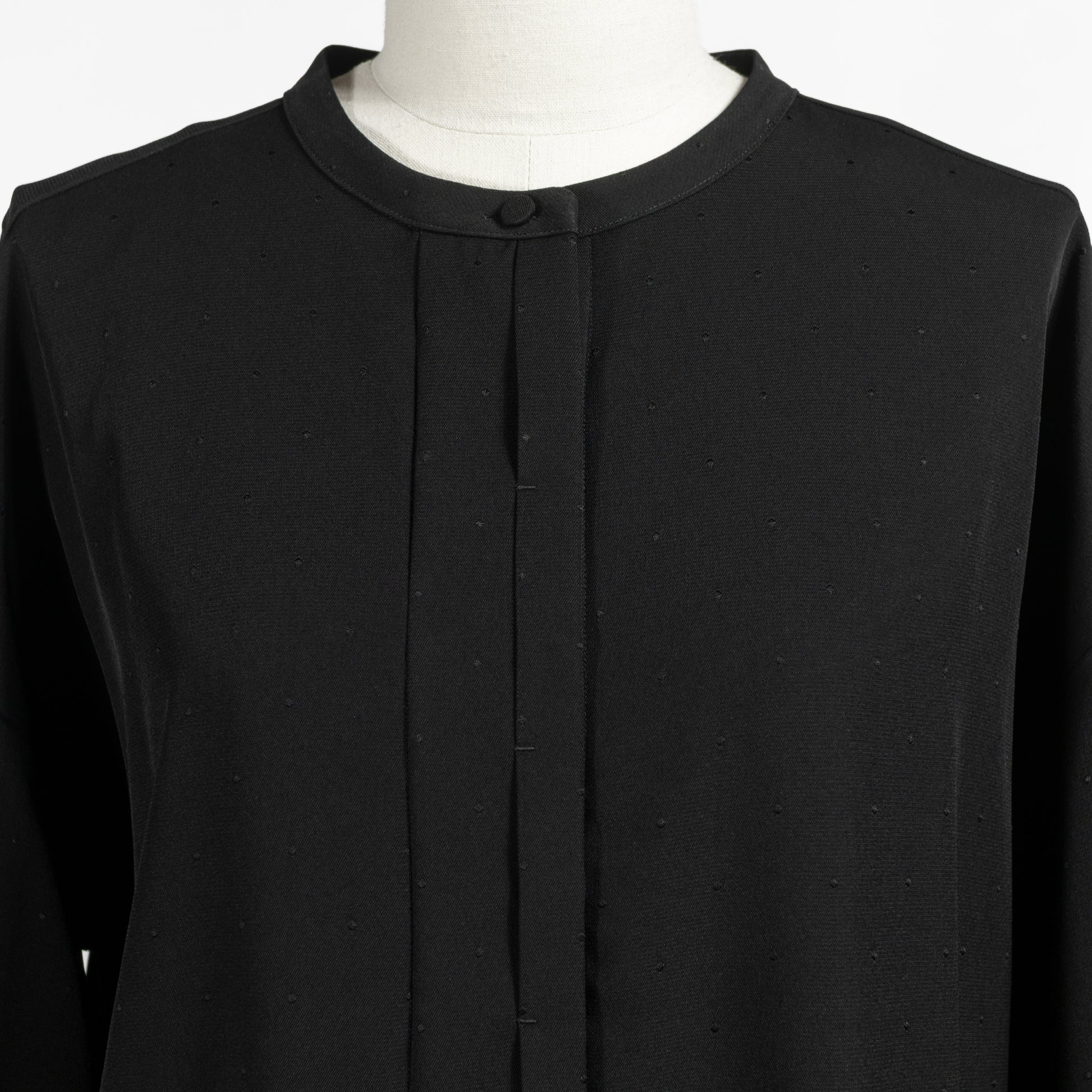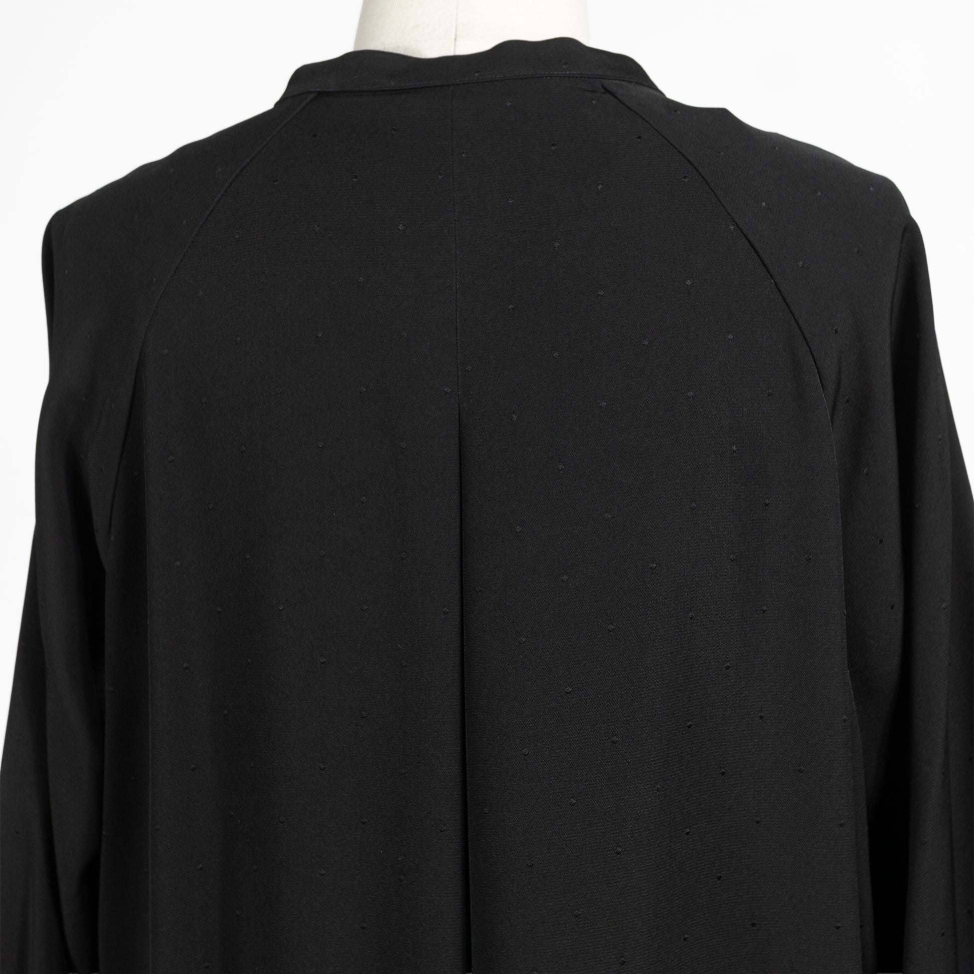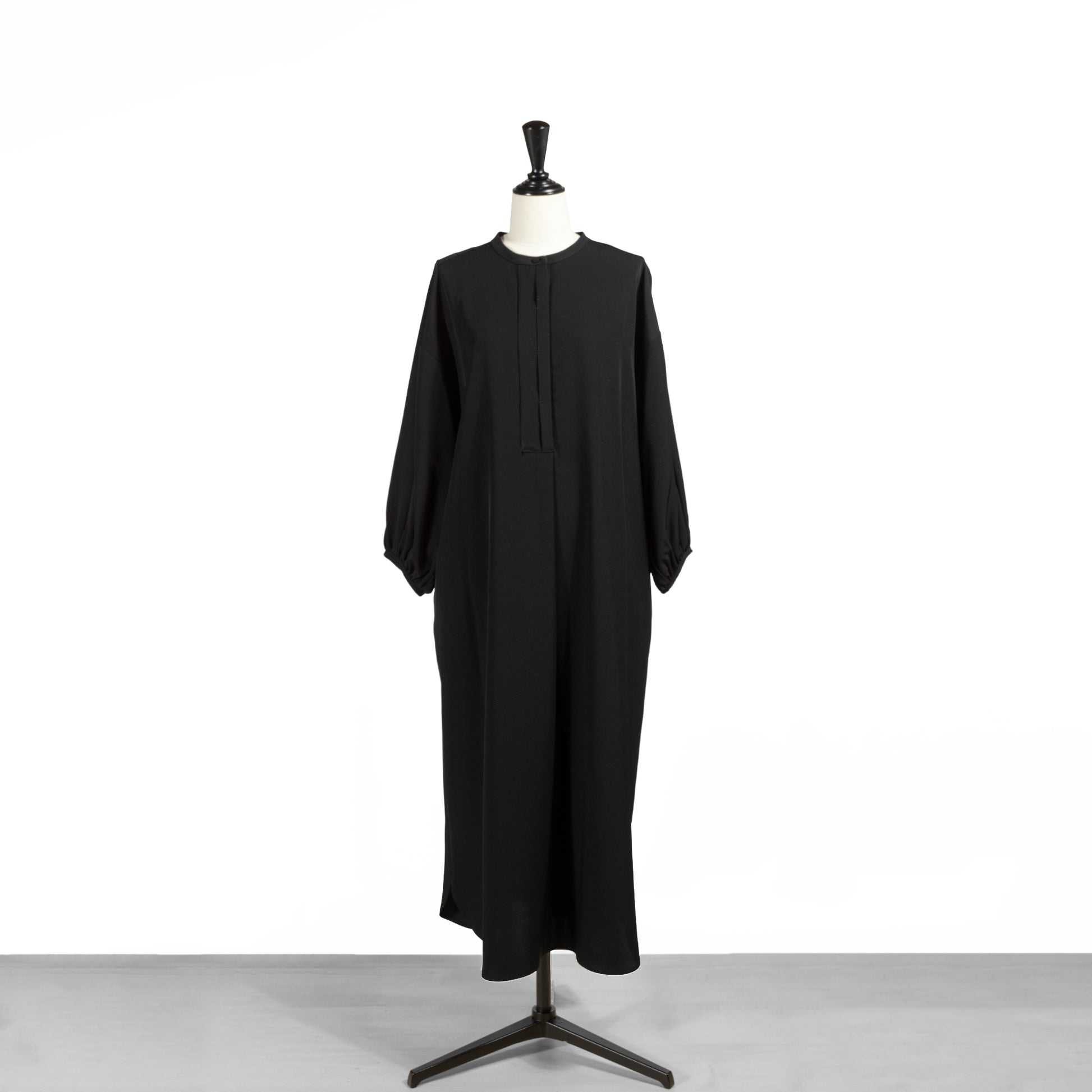 凝った比翼仕立てと、女性らしいパフスリーブが目を惹くシックなブラックドレス