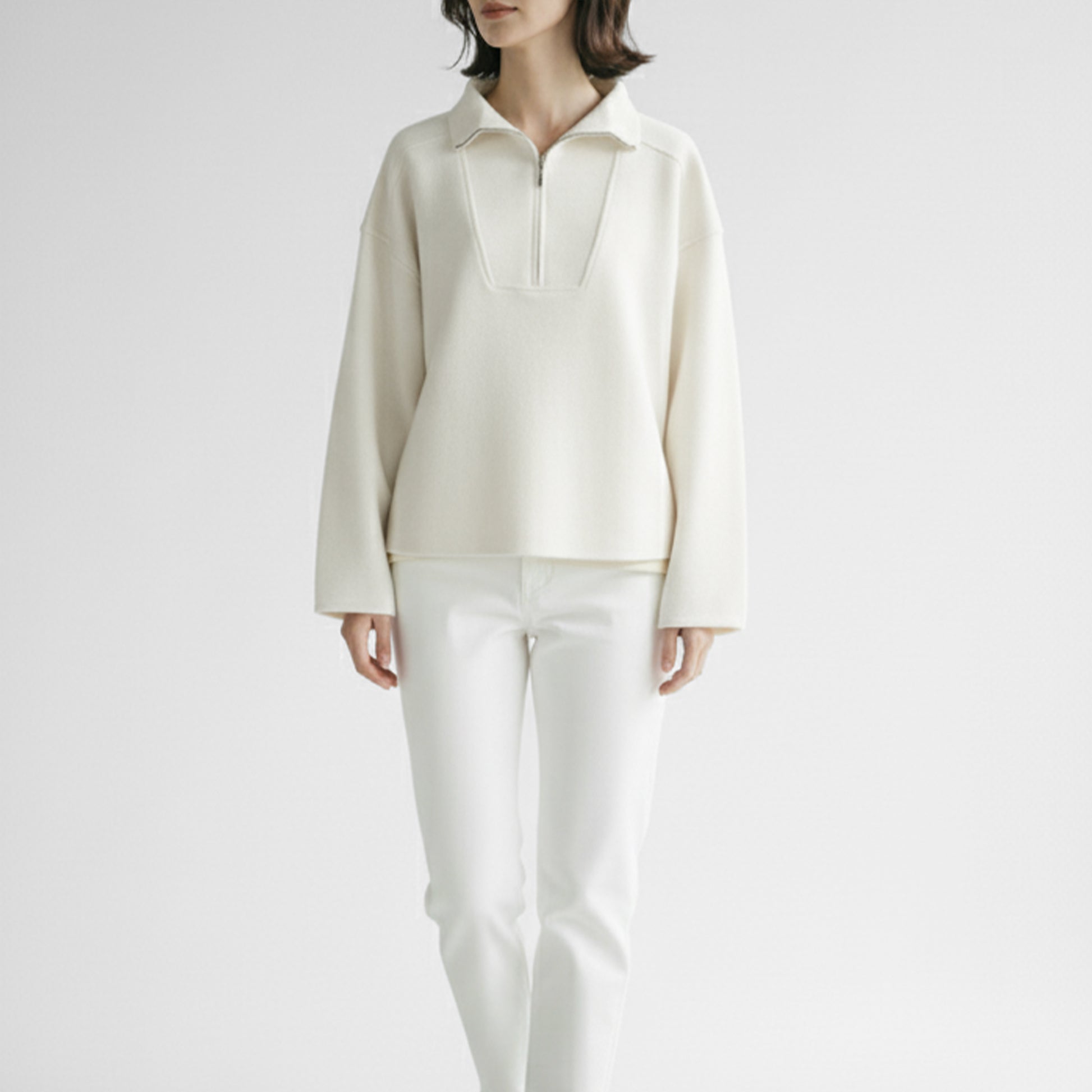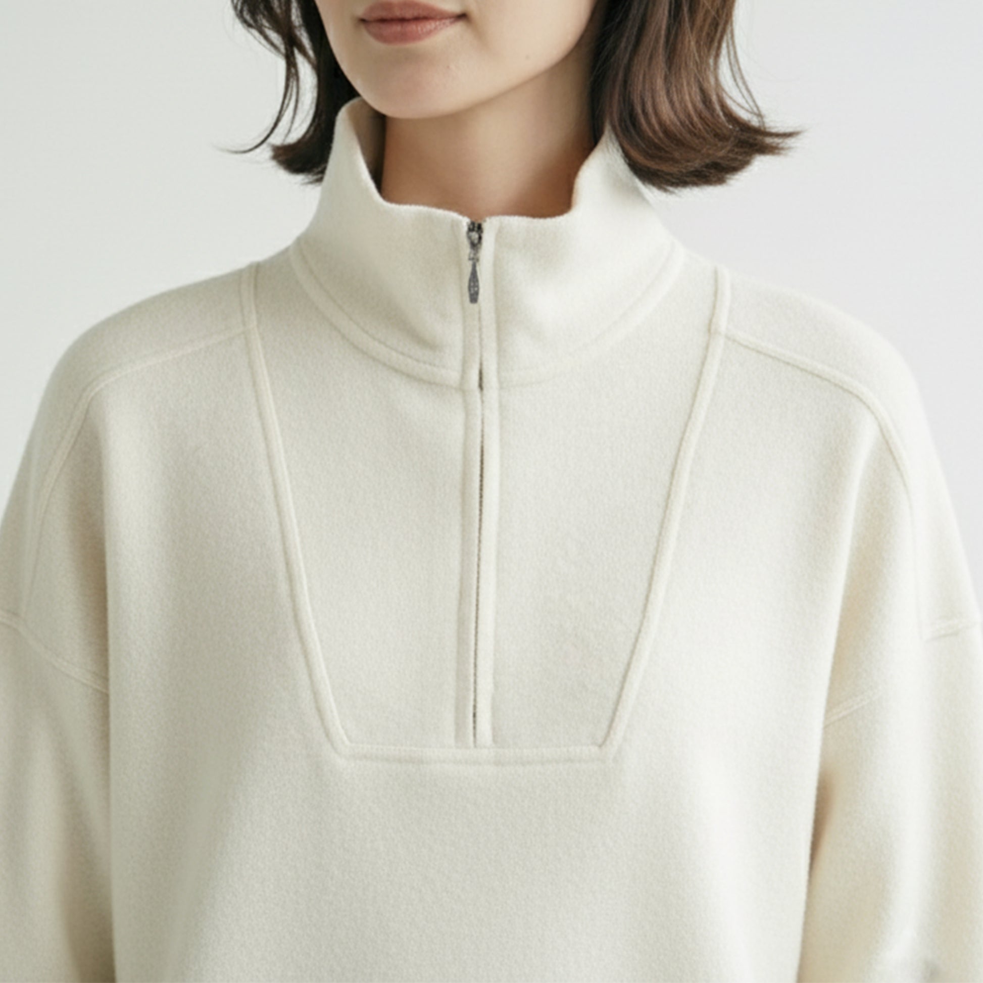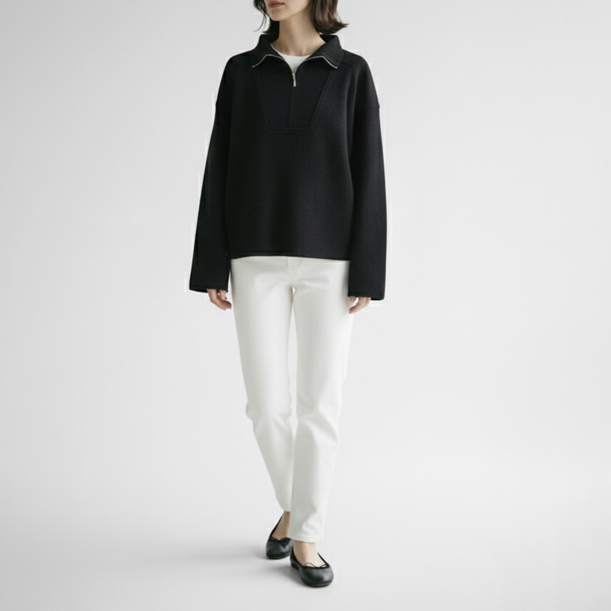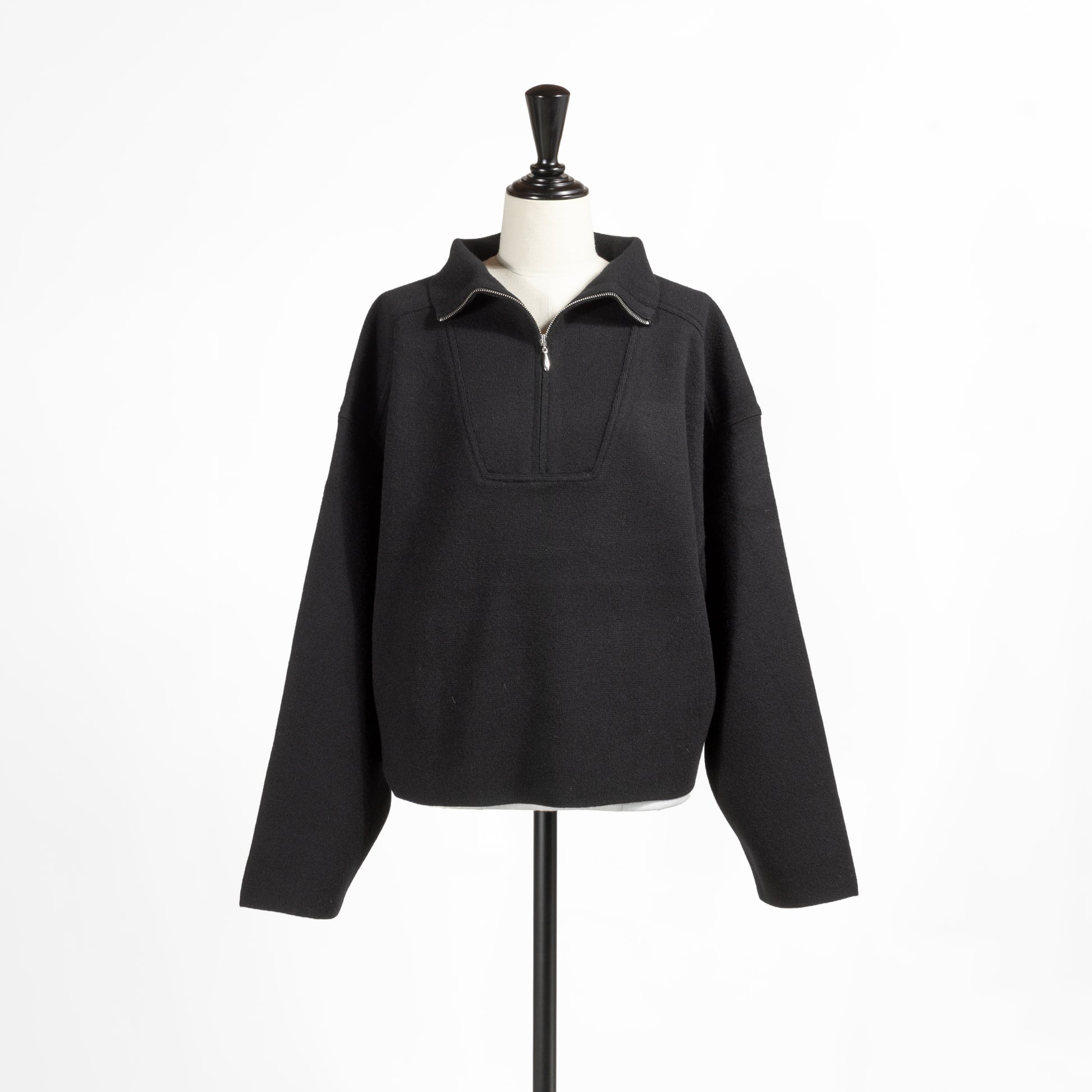 ジップの開き具合で襟の雰囲気を変えられるプルオーバーニット
