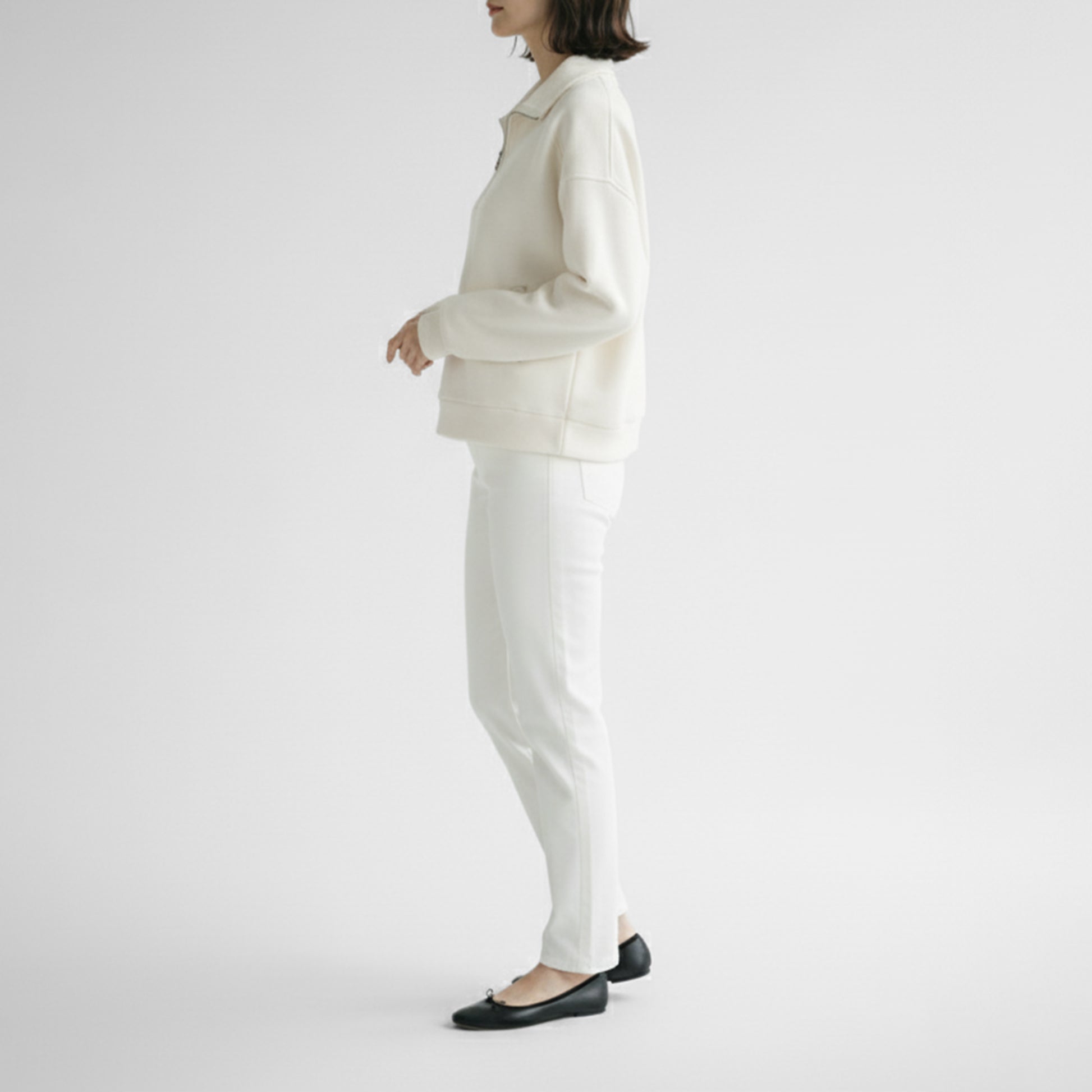 顔まわりをスッキリさせたいときはジップを開いて襟風に