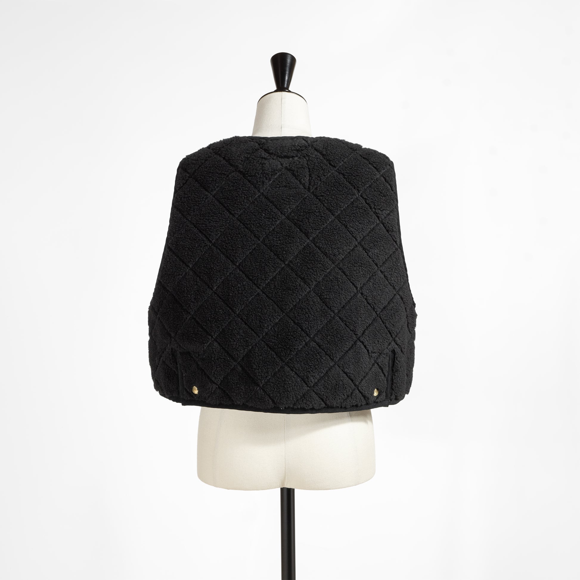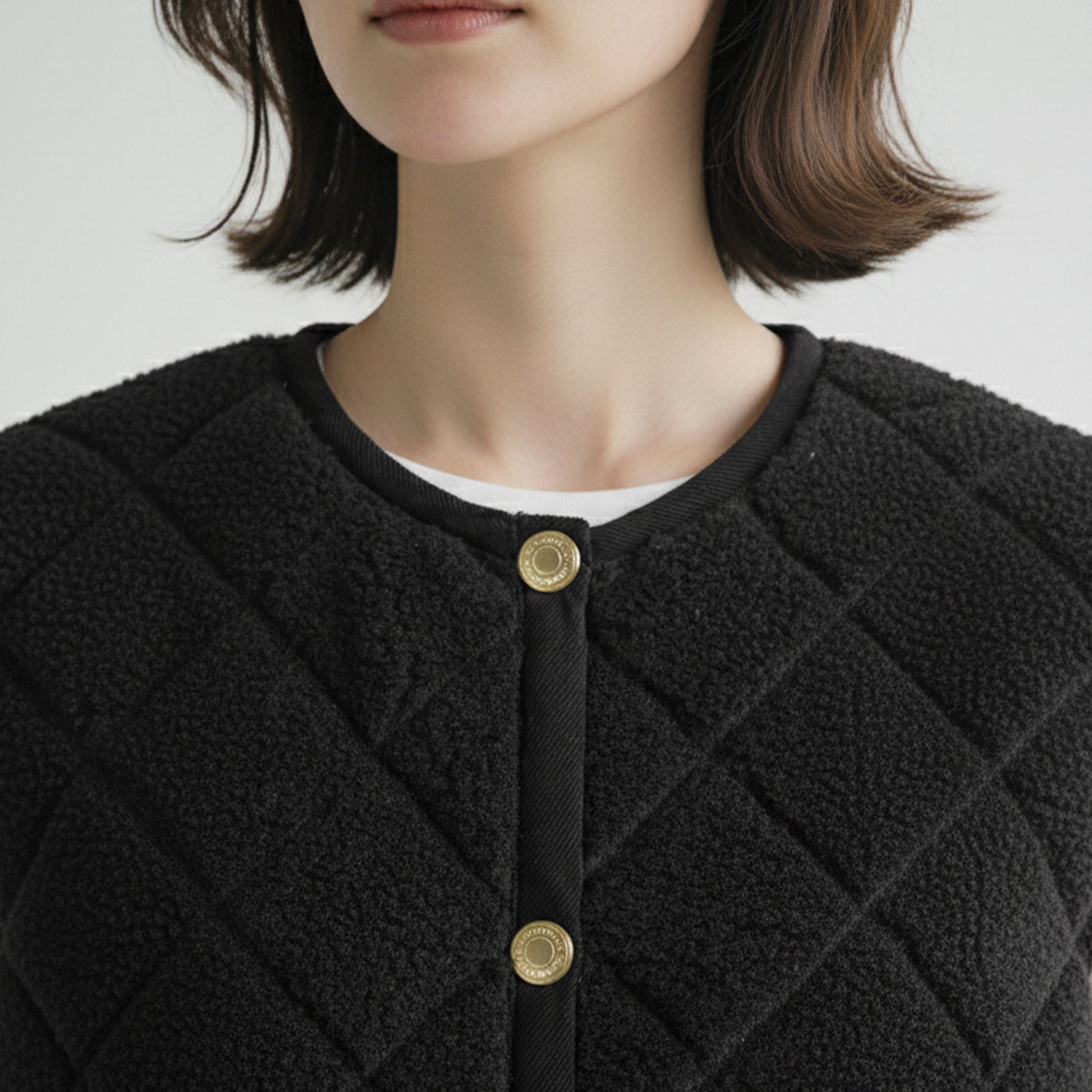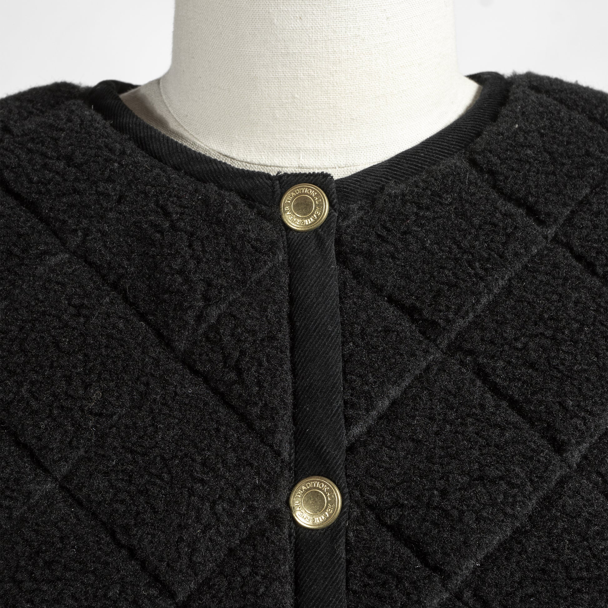 エコファーを使用した上質なボアに、コーデュロイのパイピングとゴールドのボタンがアクセントをプラス