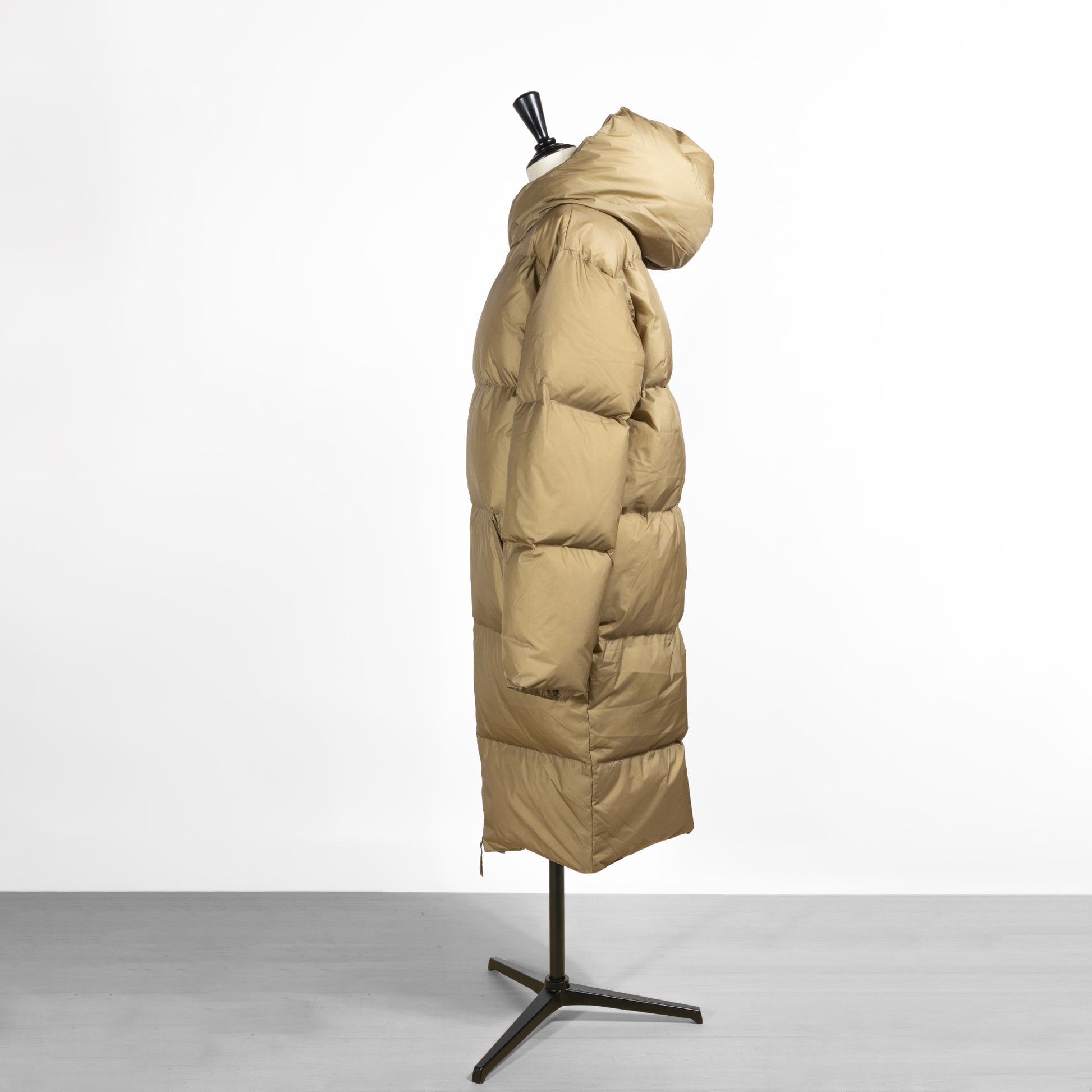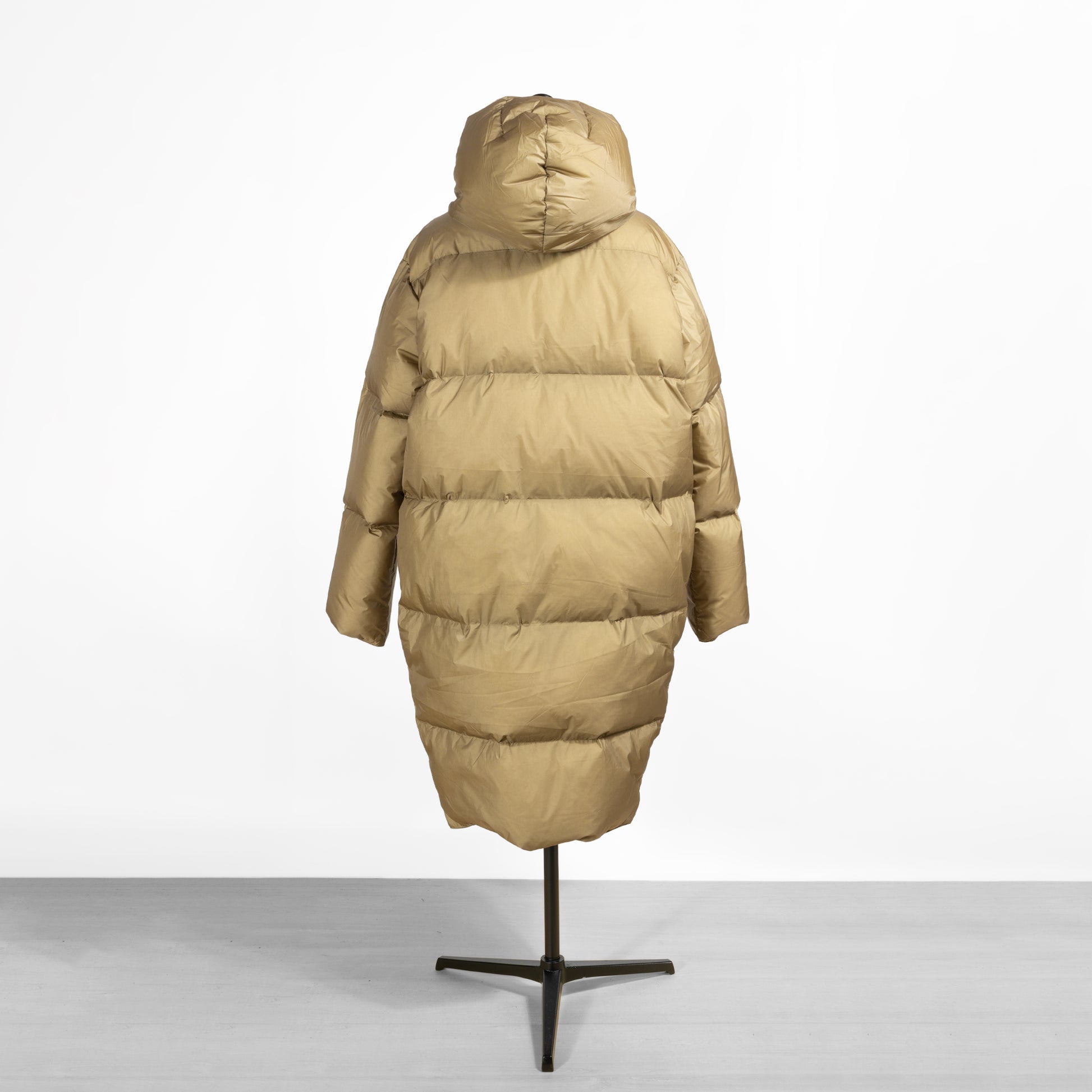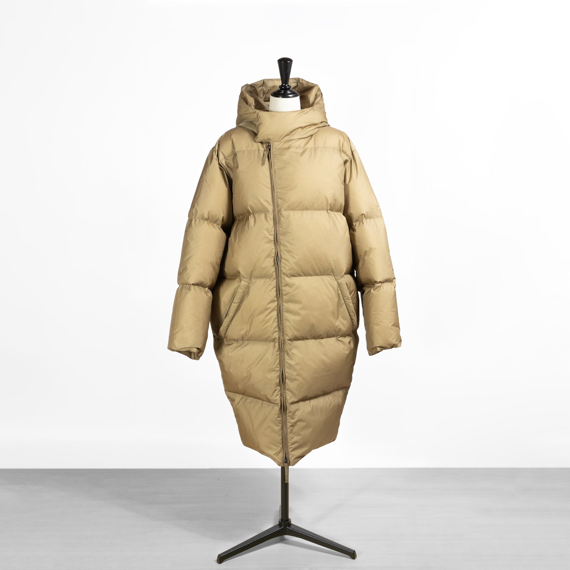 ボリューミーなスタンドカラー、中心をずらしたオフセットファスナー、裾にむかって細くなる寝袋のようなシルエットなど、シンプルに見えてこだわりが詰まった個性的なデザインが魅力的です