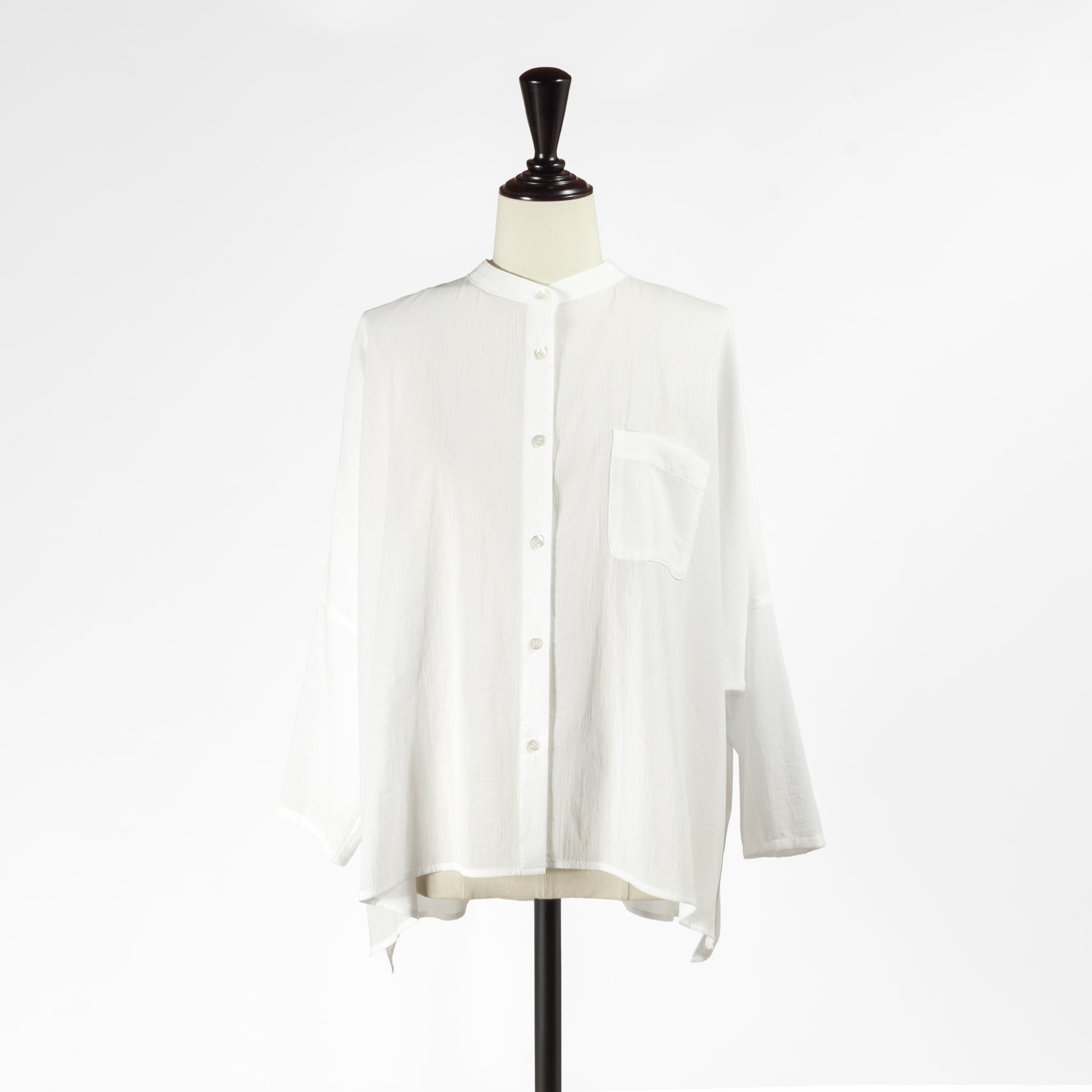 窮屈さがゼロでリラックスして着られつつ、クラシカルなバンドカラーのおかげでカジュアルになりすぎないのが嬉しいです