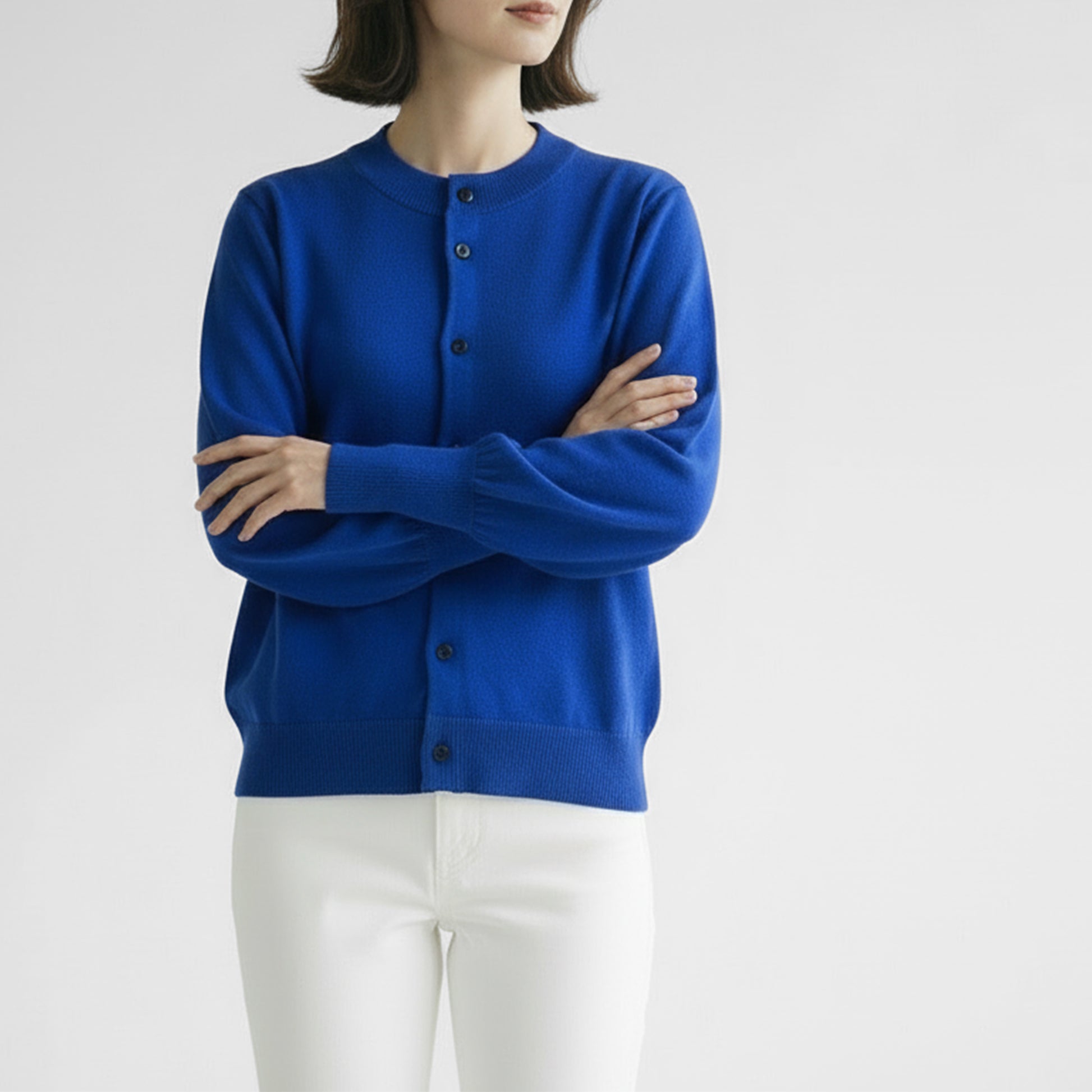 コットンカシミヤ素材で編みたてられたシンプルなカーディガン