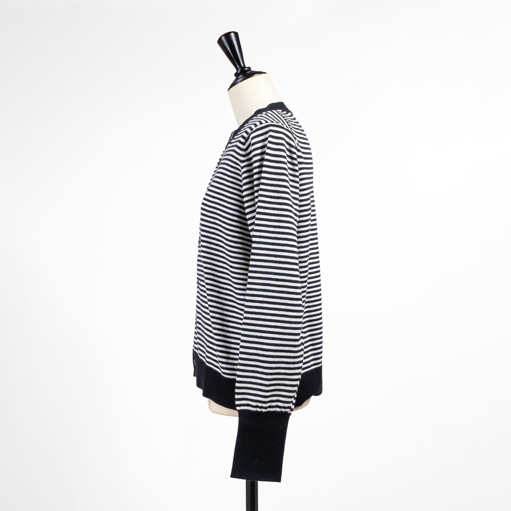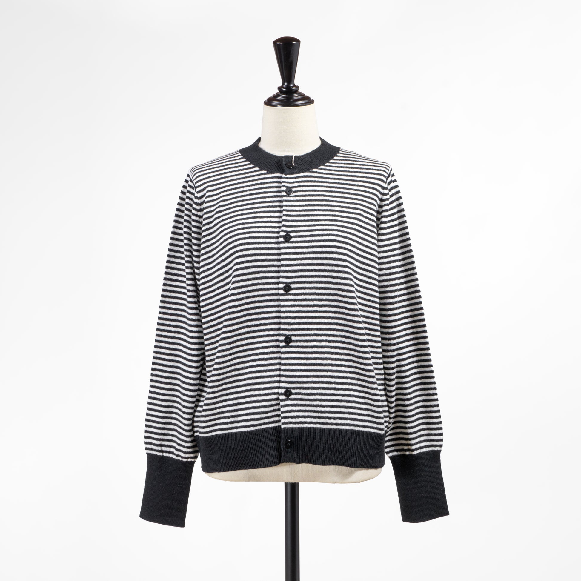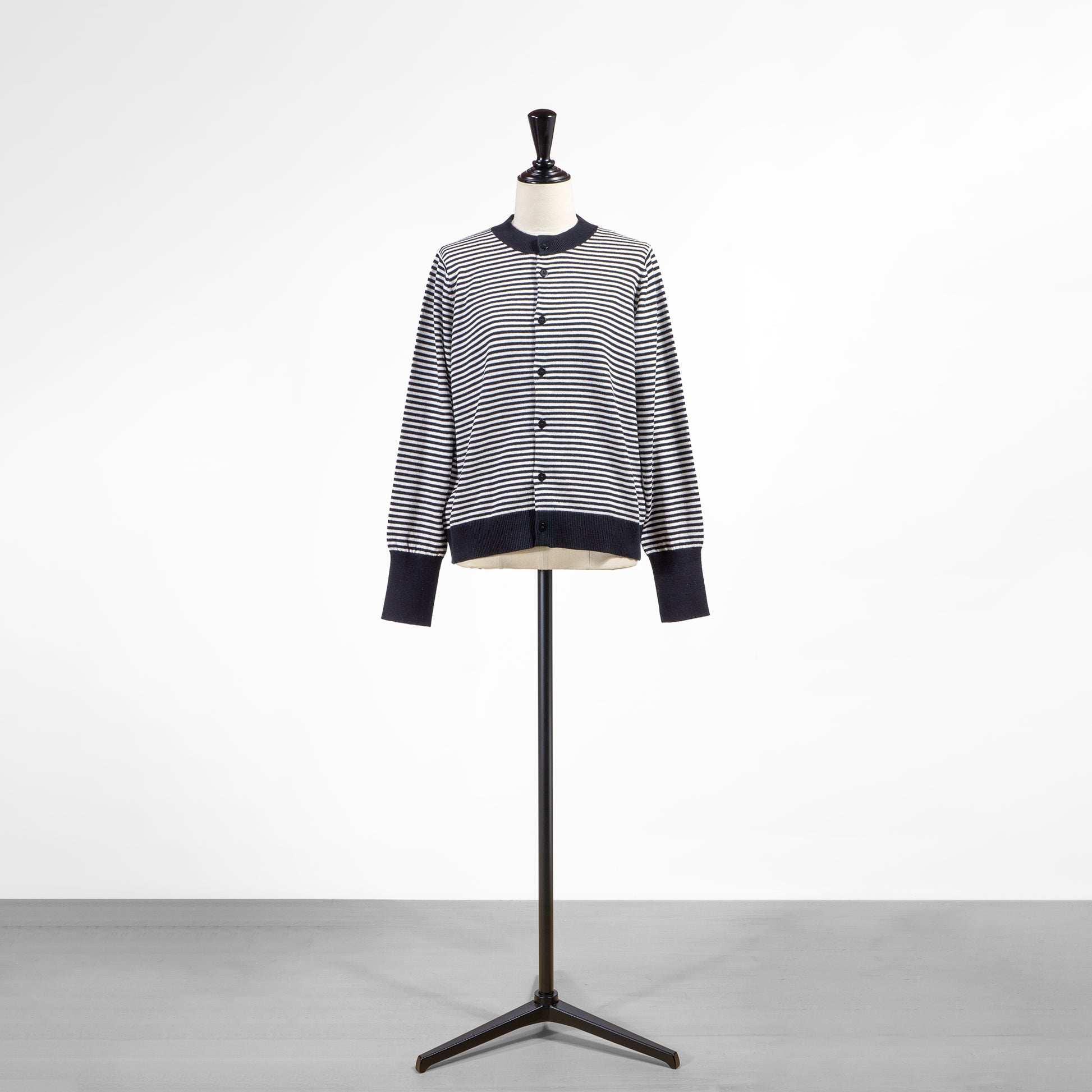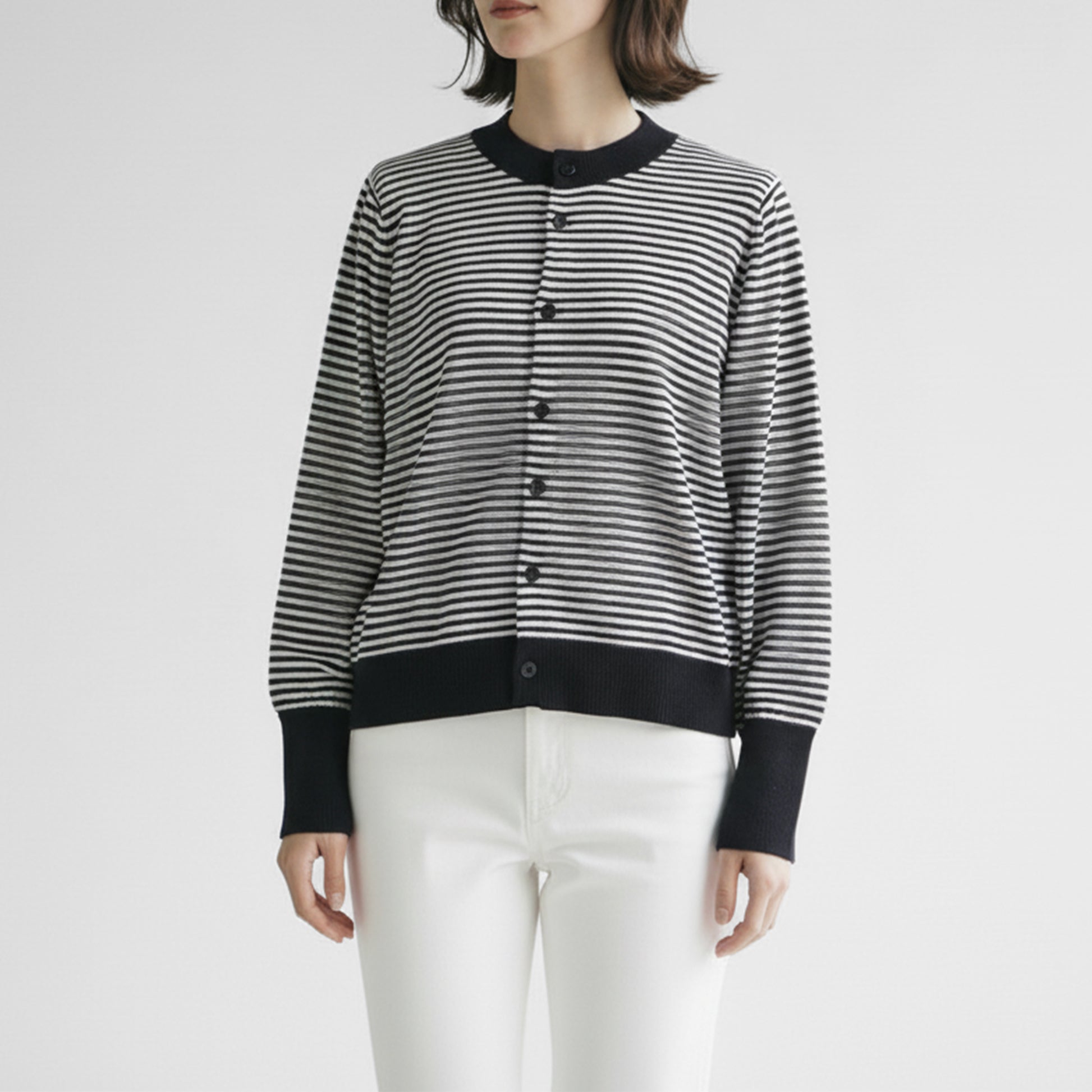 ブルーとボーダーの2色展開でスタイリングのアクセントにも使いやすく、黒やネイビーといった定番色以外の明るいカーディガンをお探しの方にももってこい