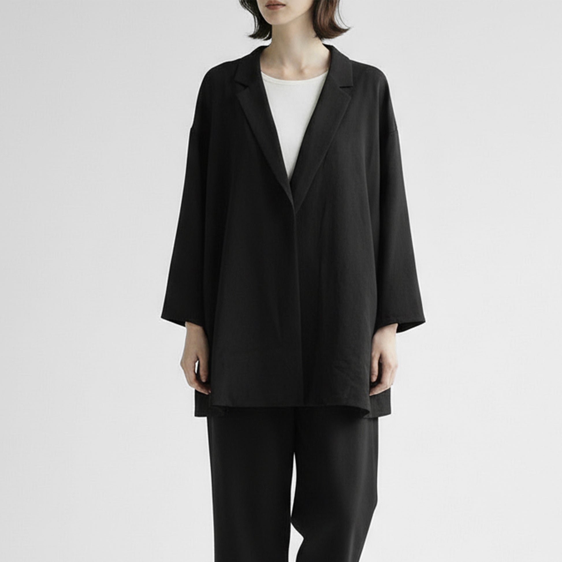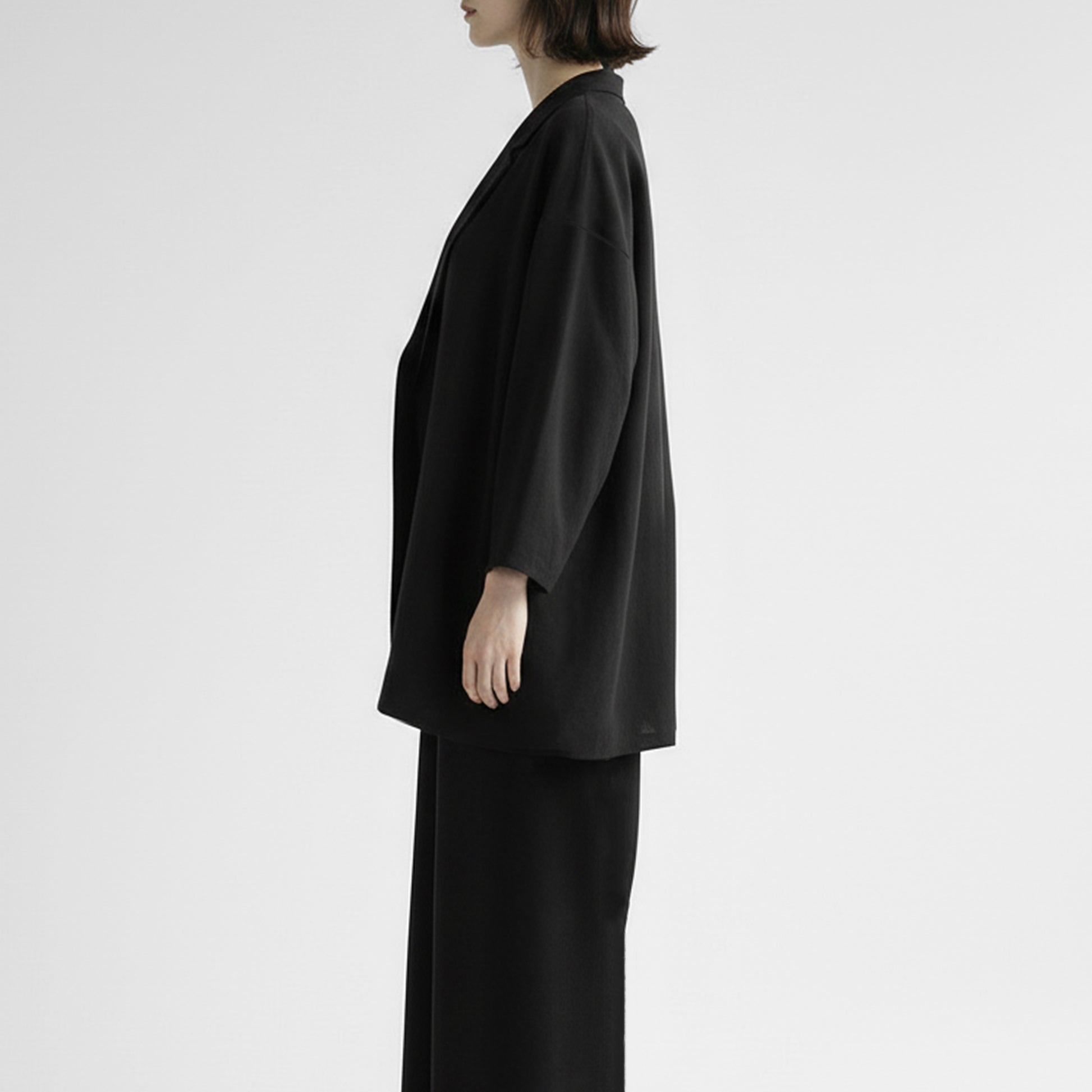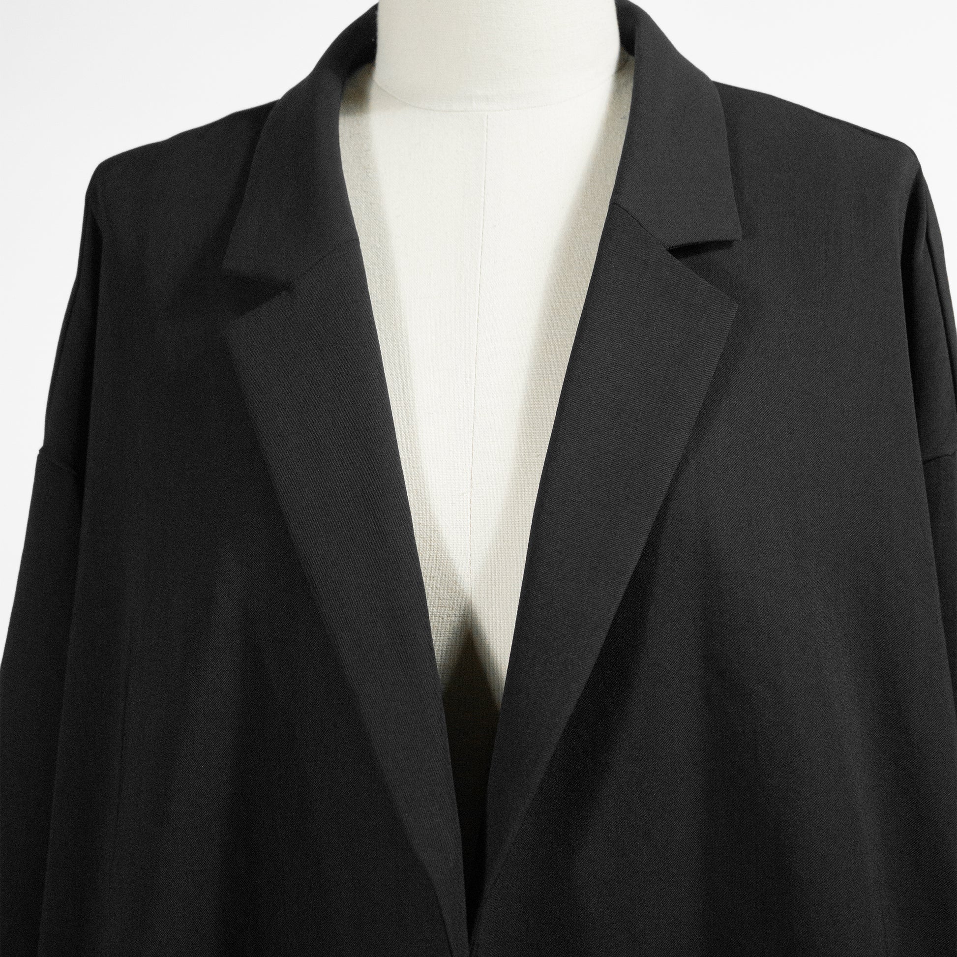 ドロップショルダーのゆったりとしたシルエットと、長めの着丈がモードな雰囲気を漂わせるテーラードジャケット