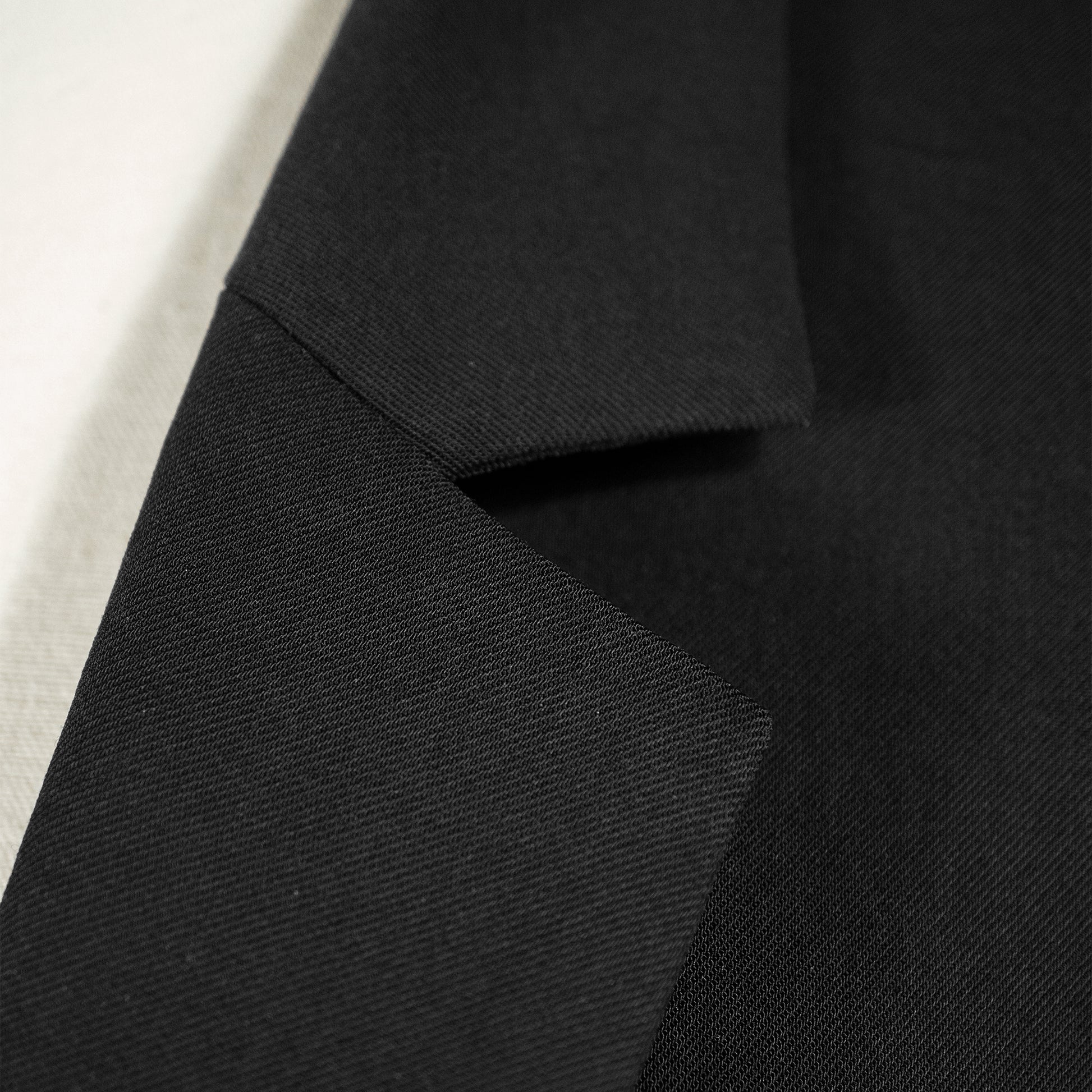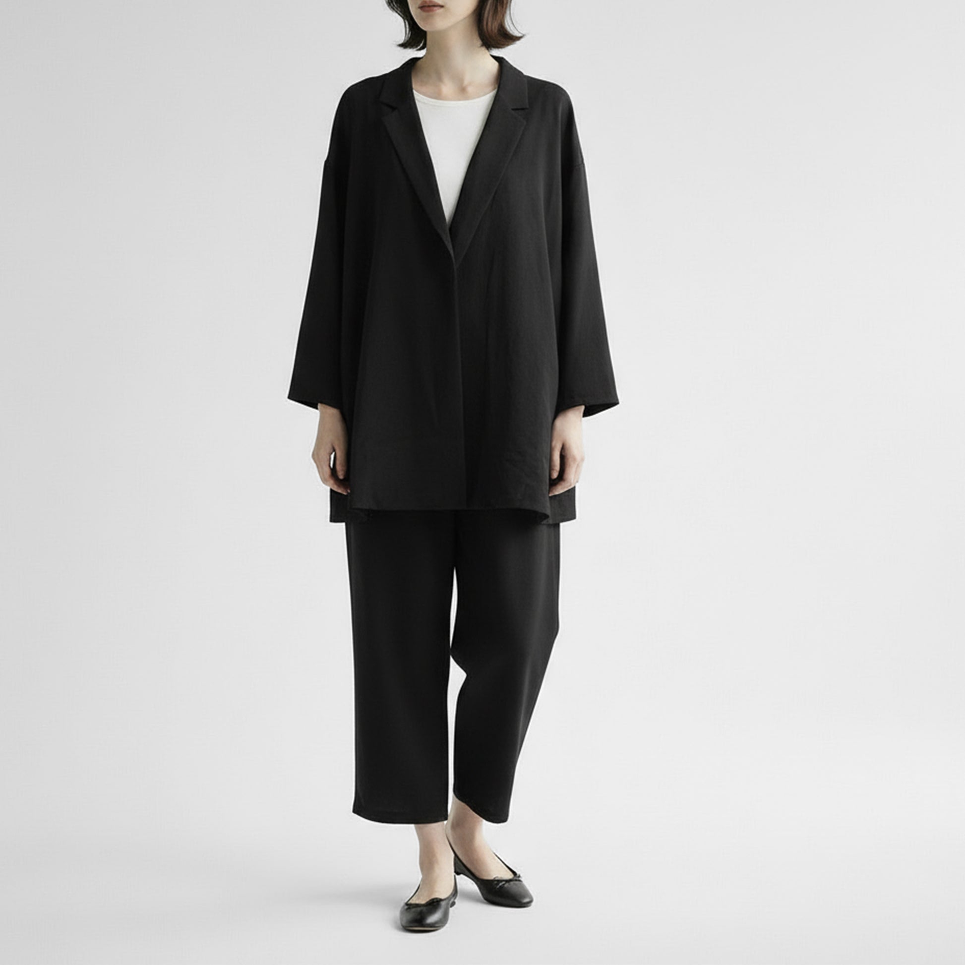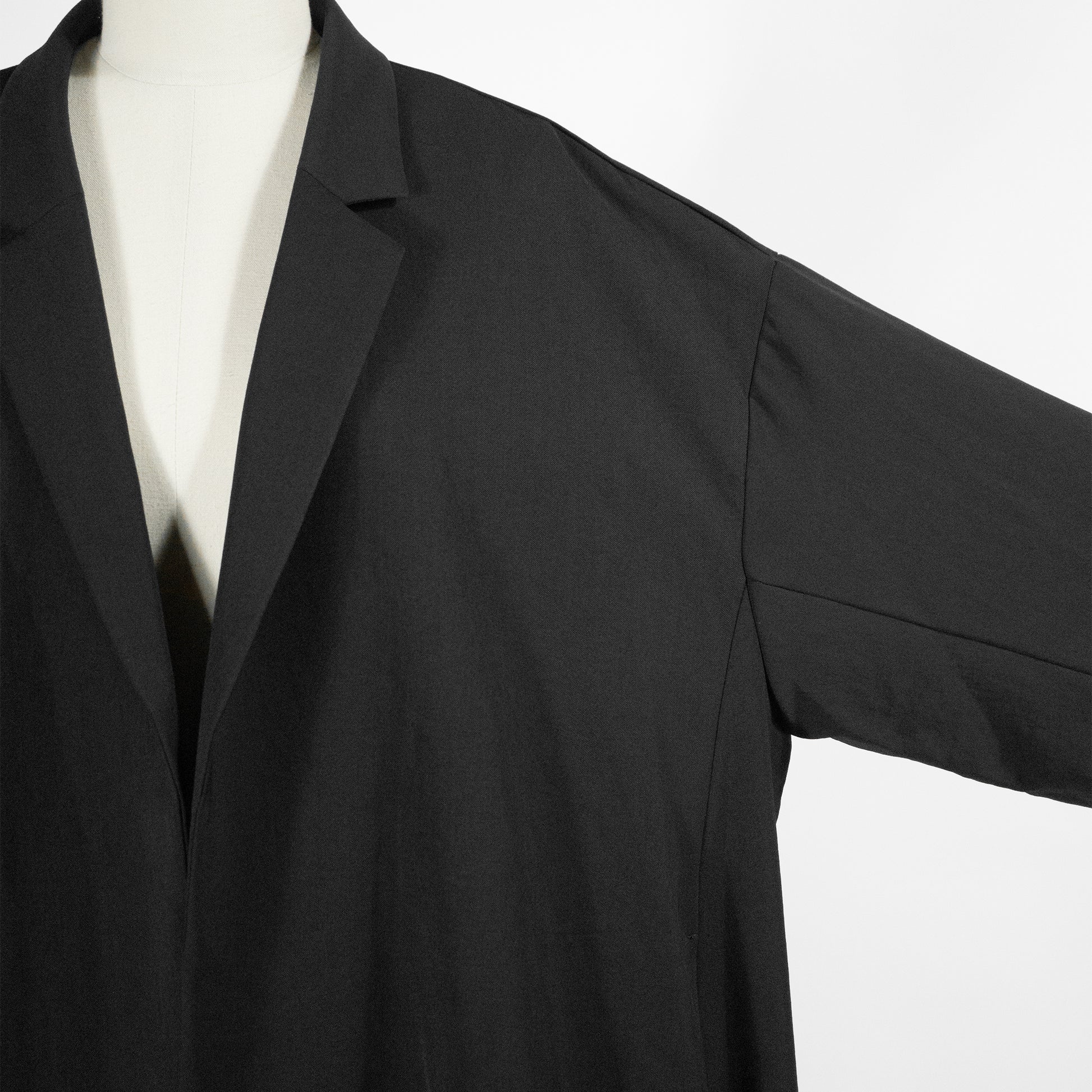 ドロップショルダーのゆったりとしたシルエットと、長めの着丈がモードな雰囲気を漂わせるテーラードジャケット