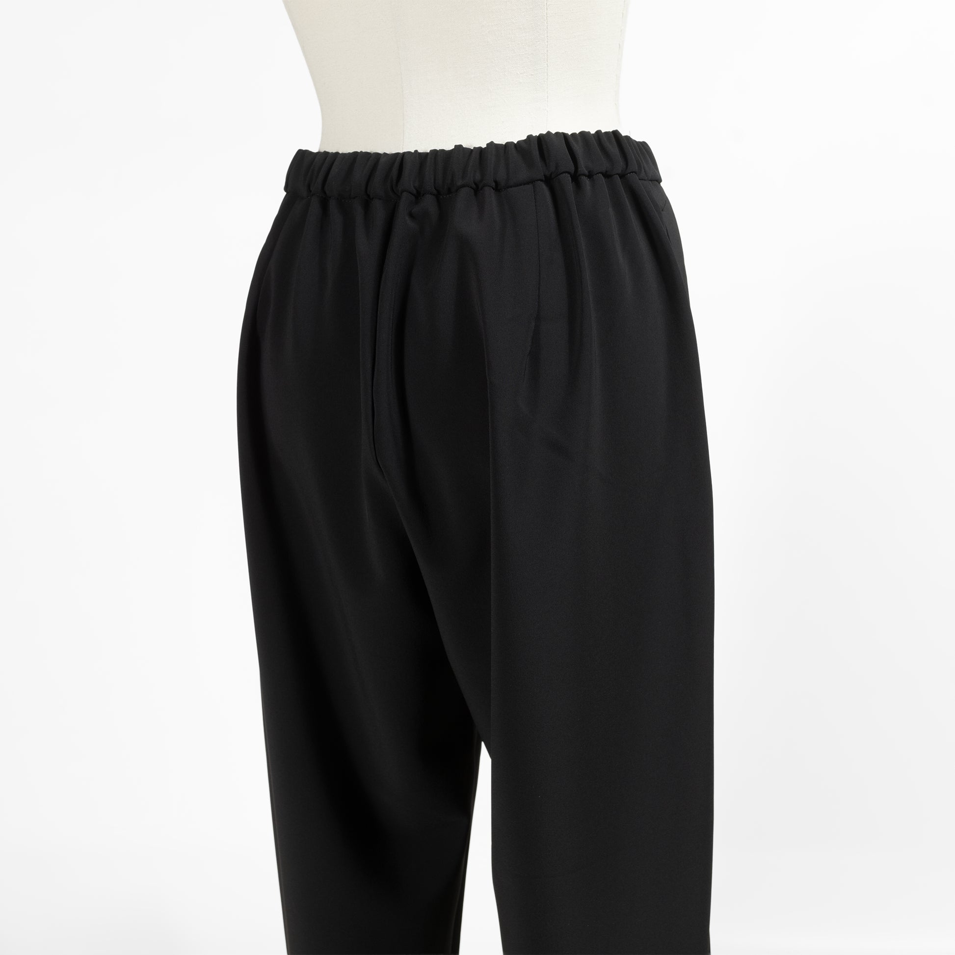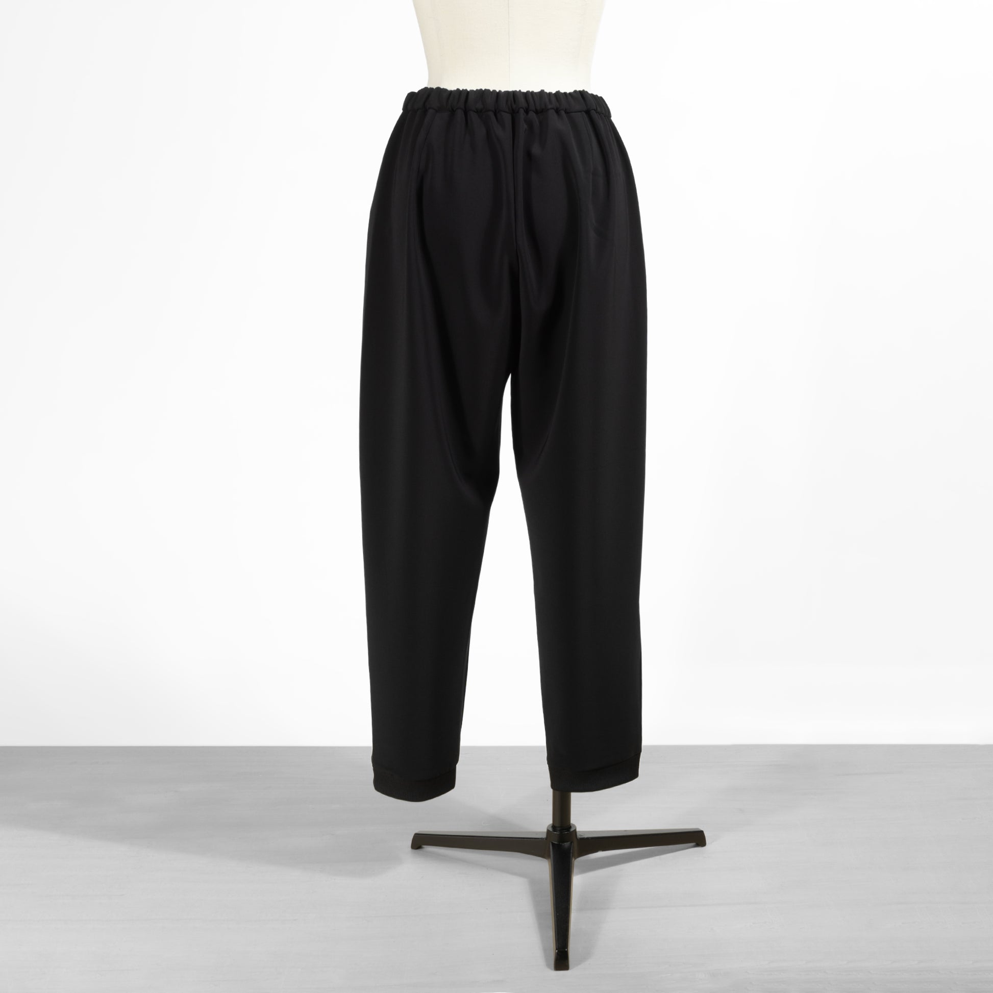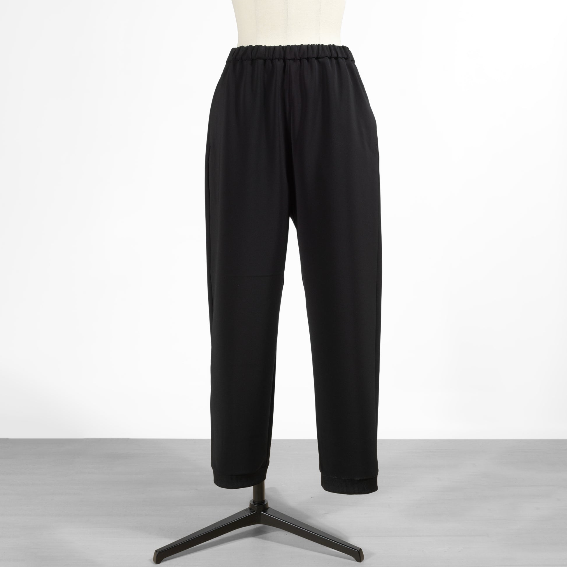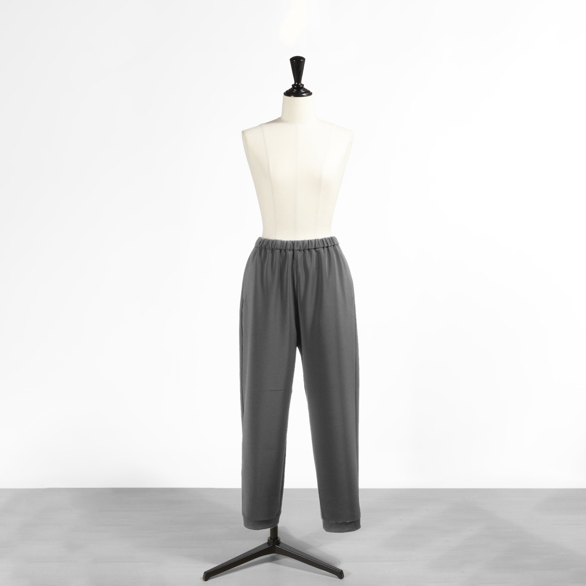 ほんのりテーパードを効かせた綺麗なシルエットが魅力的で、ウエストゴムのイージーパンツながらカジュアルになりすぎないのが使いやすいポイント