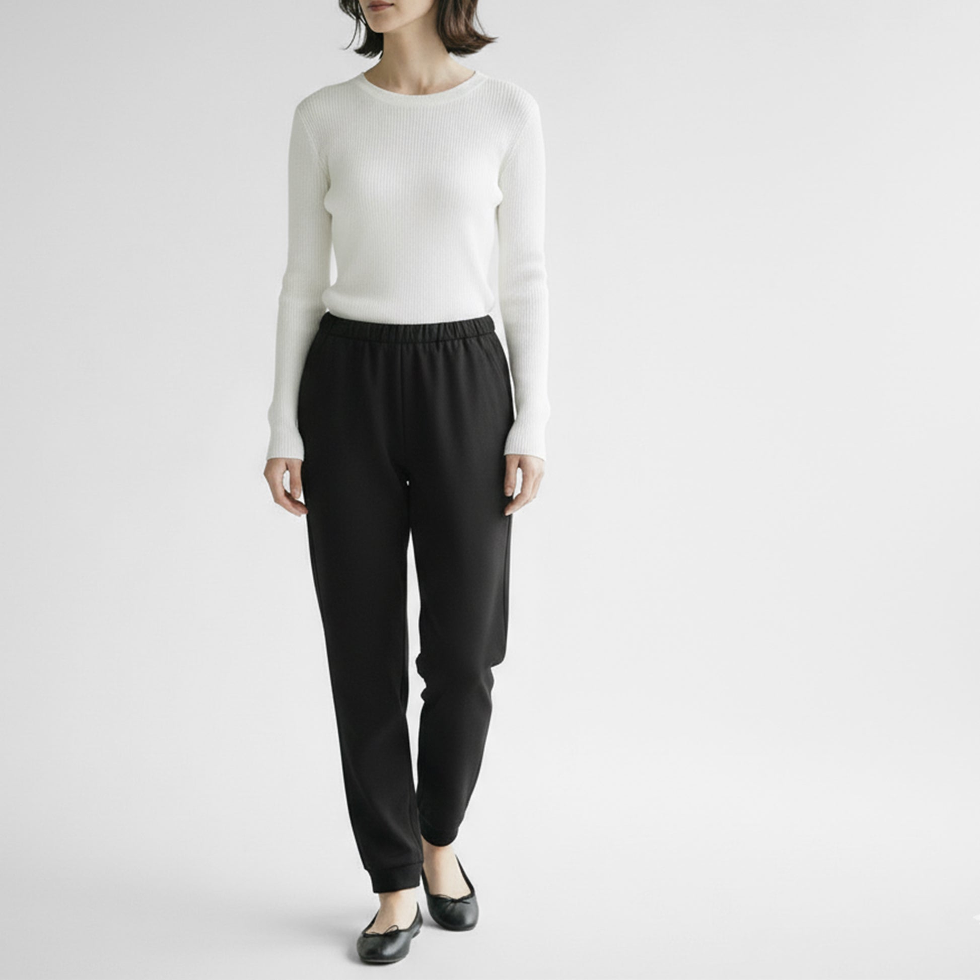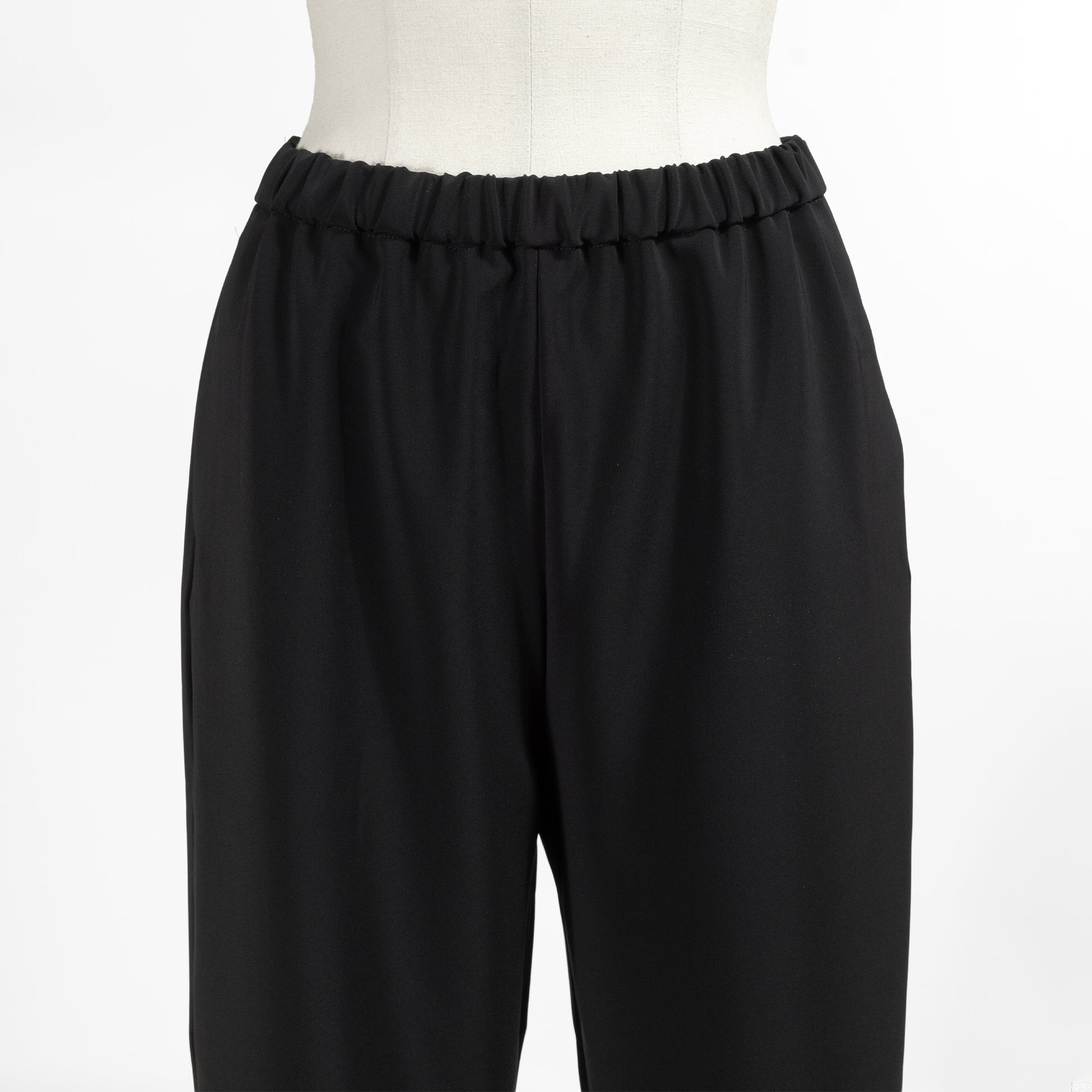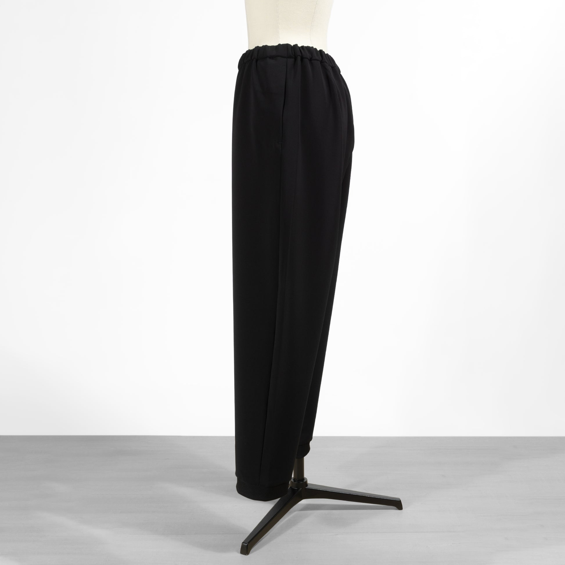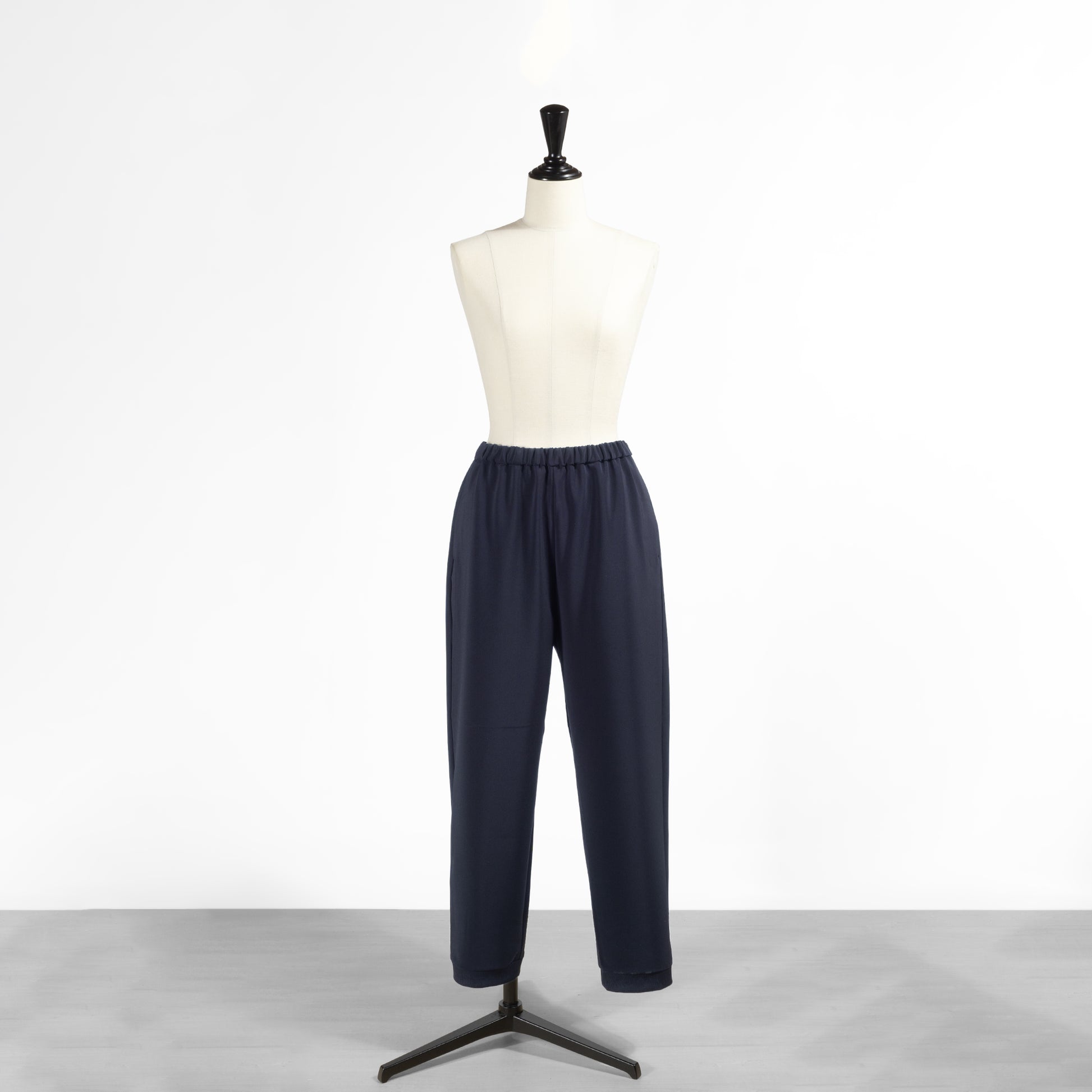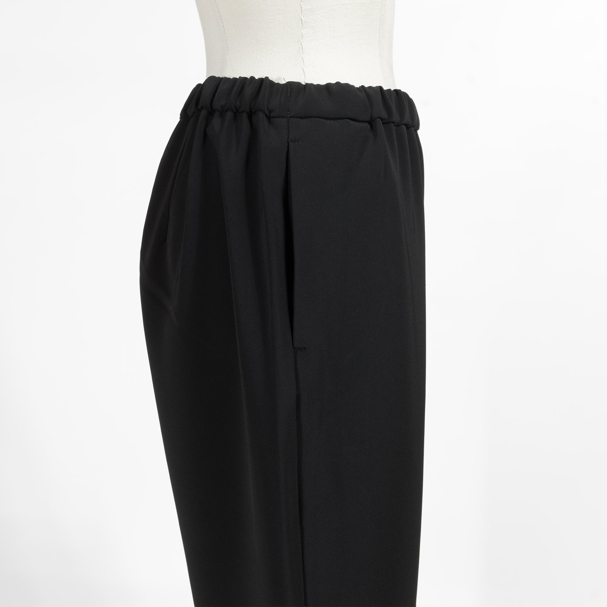 ほんのりテーパードを効かせた綺麗なシルエットが魅力的で、ウエストゴムのイージーパンツながらカジュアルになりすぎないのが使いやすいポイント