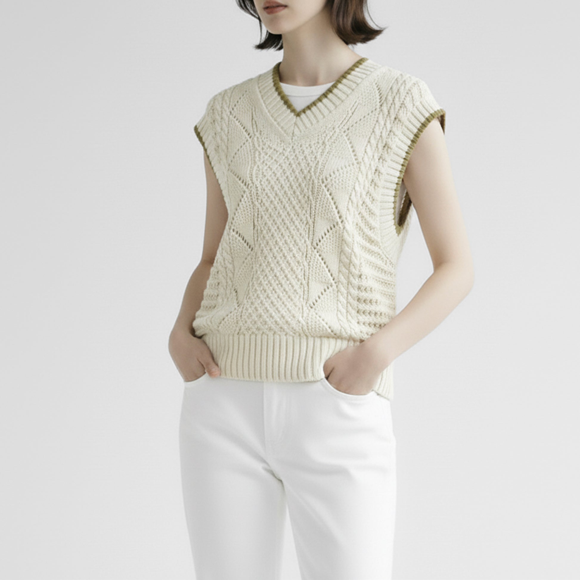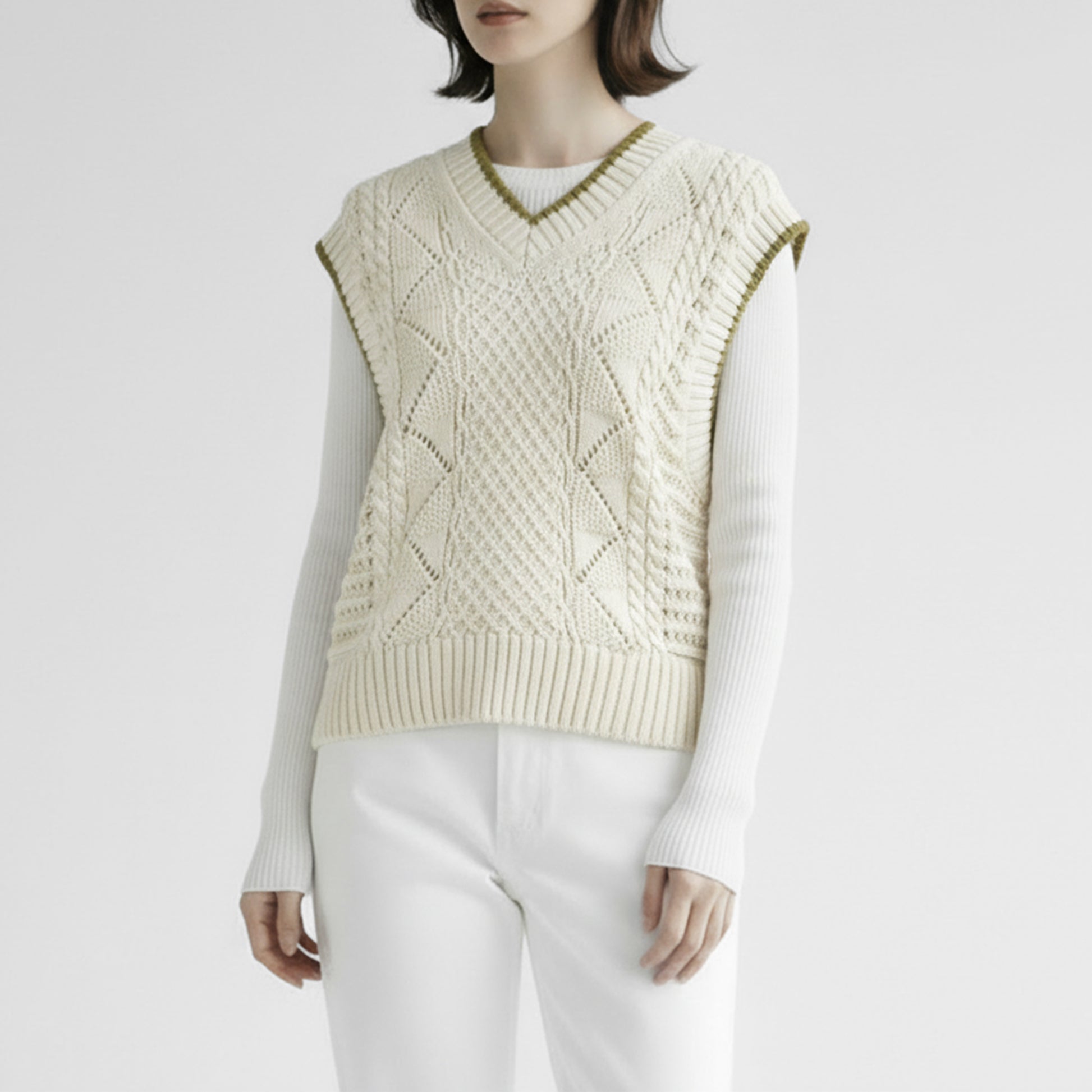 大人のレイヤードスタイルに重宝するVネックベストです