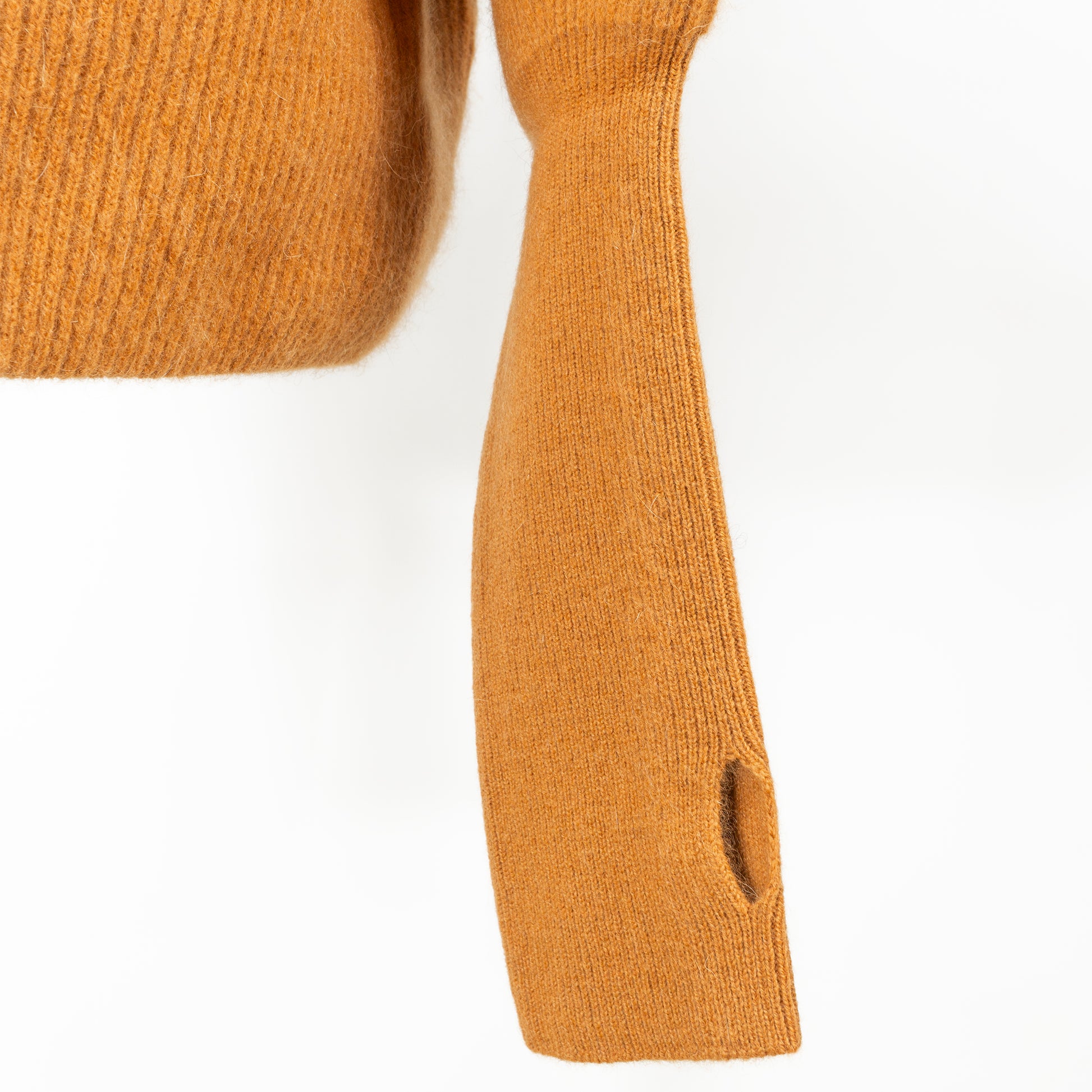 フィンガーホール付きの長いリブ編みの袖口がデザインポイント