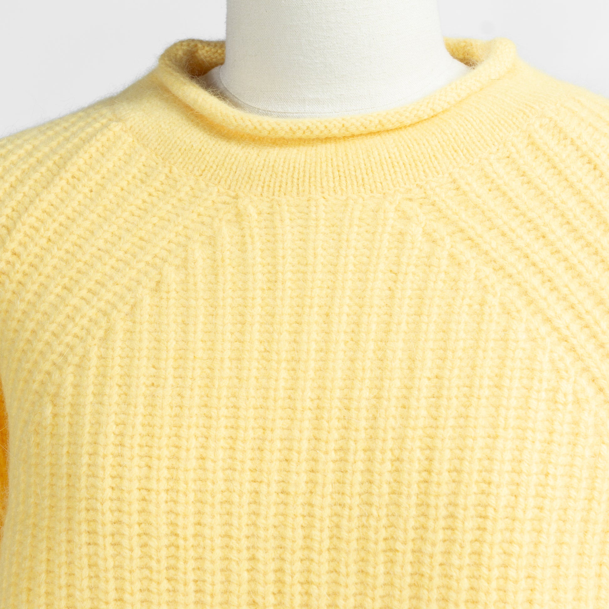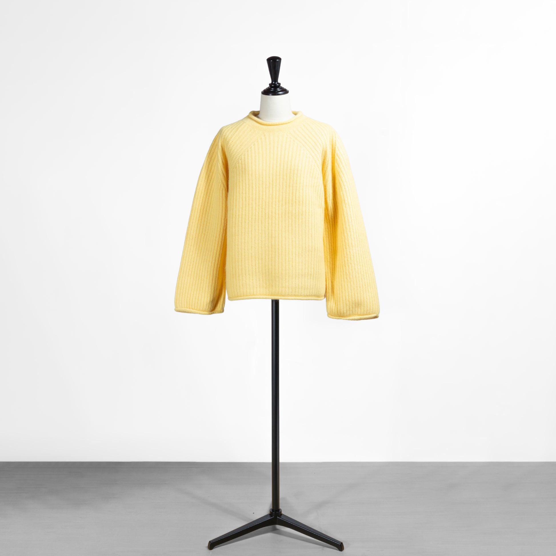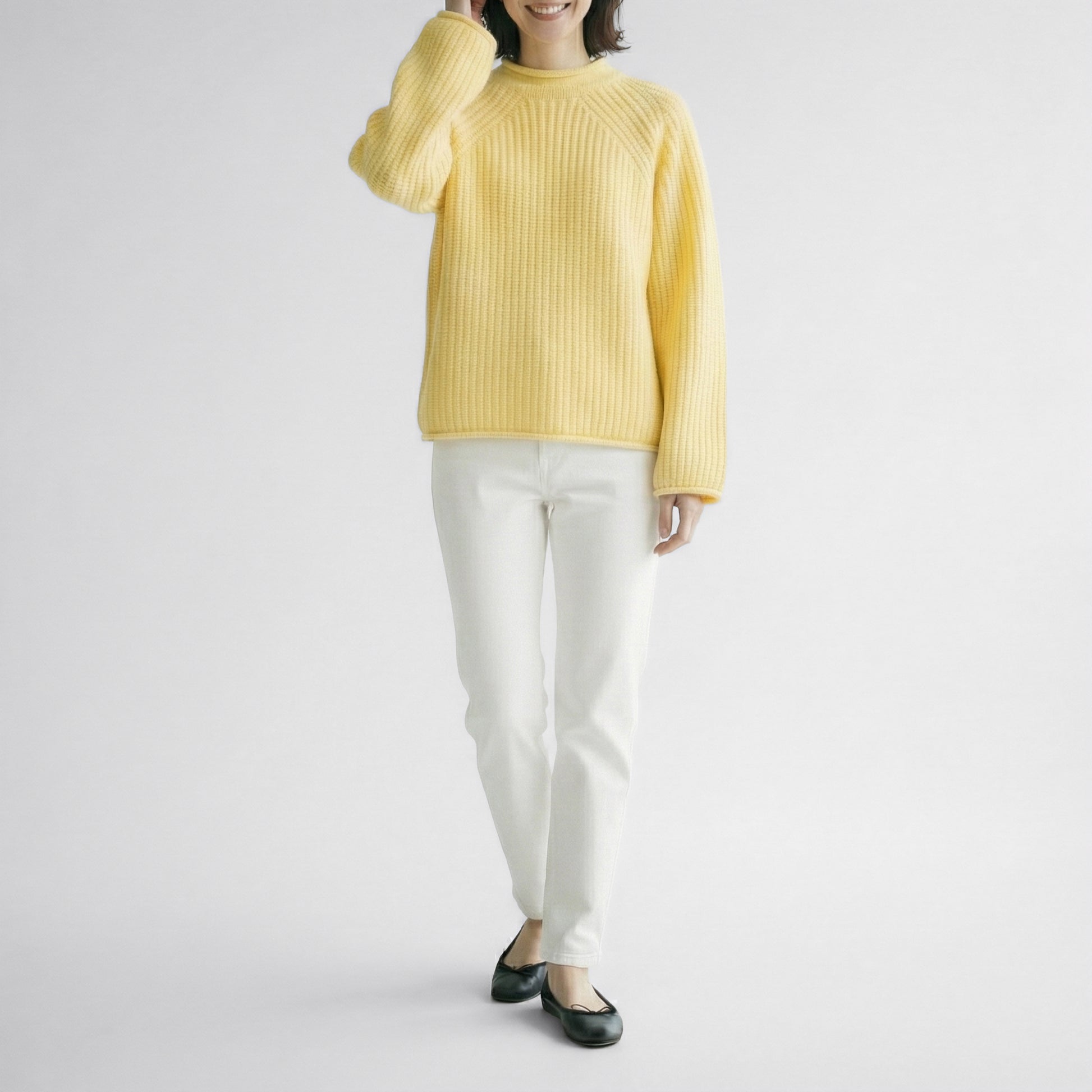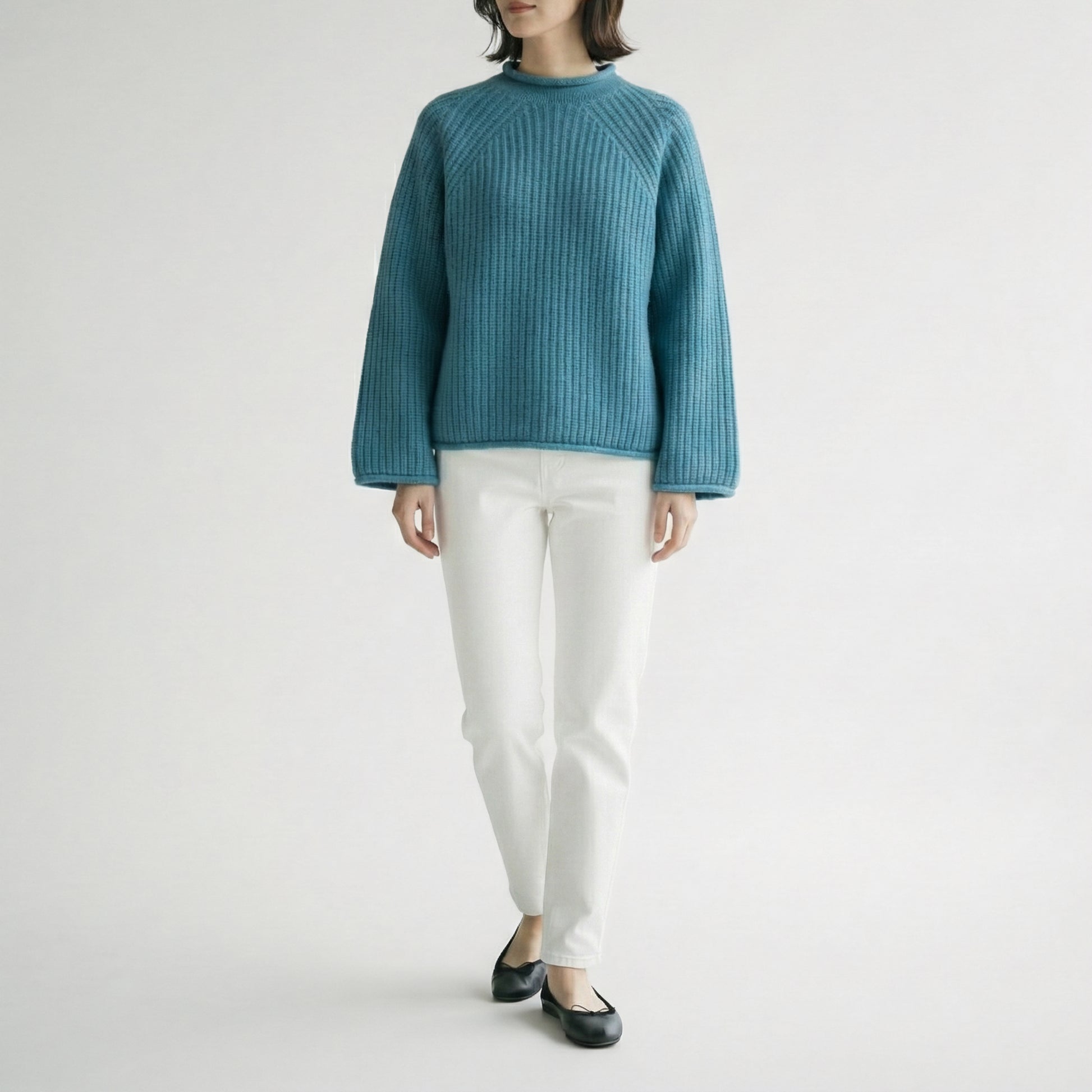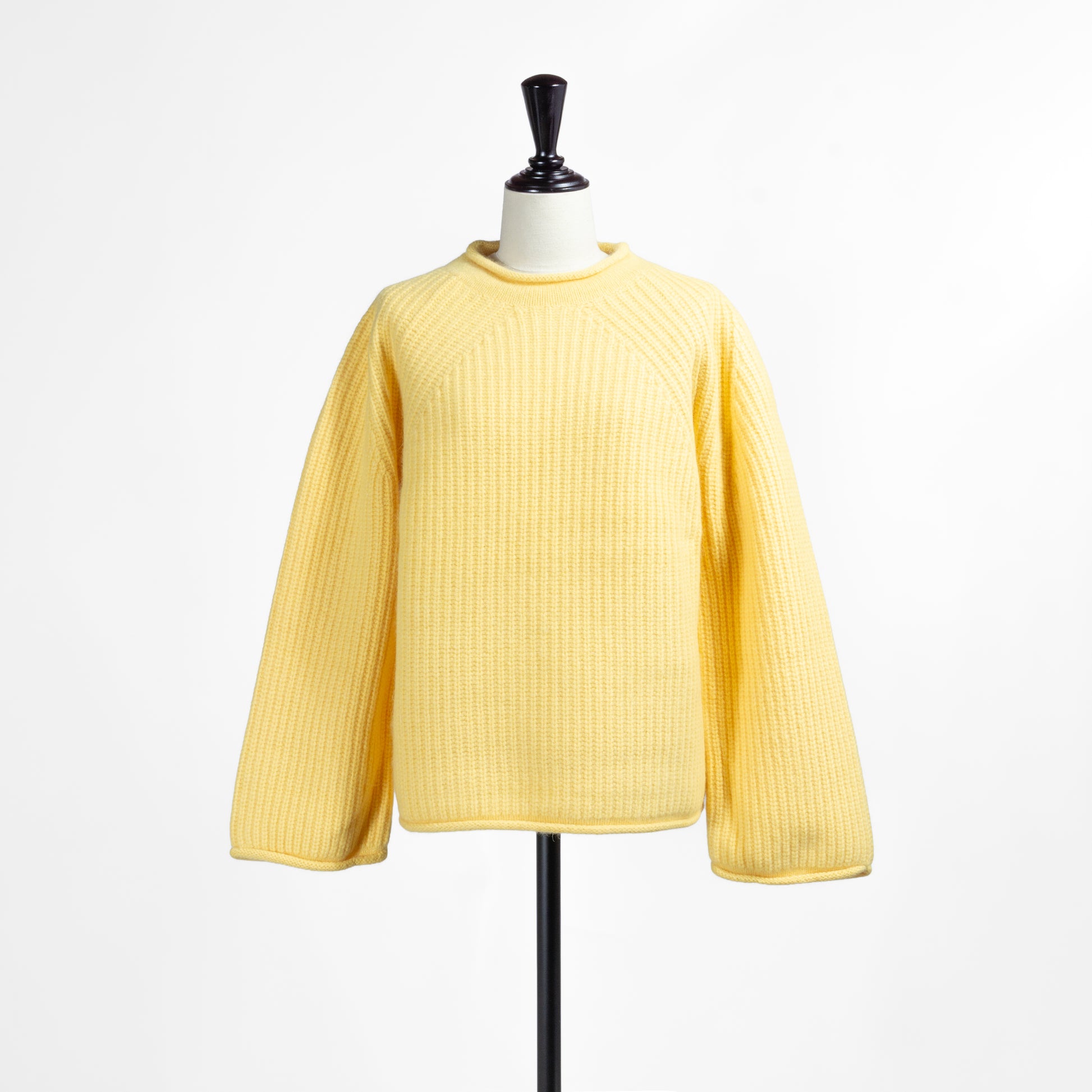 くるんと丸まったネックラインや袖口、裾のディティールがポイントになったセーター