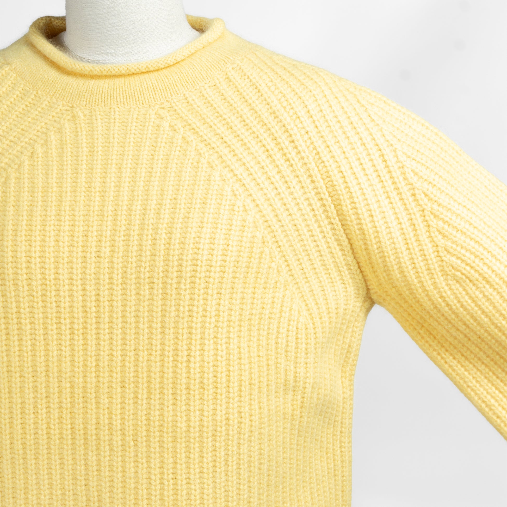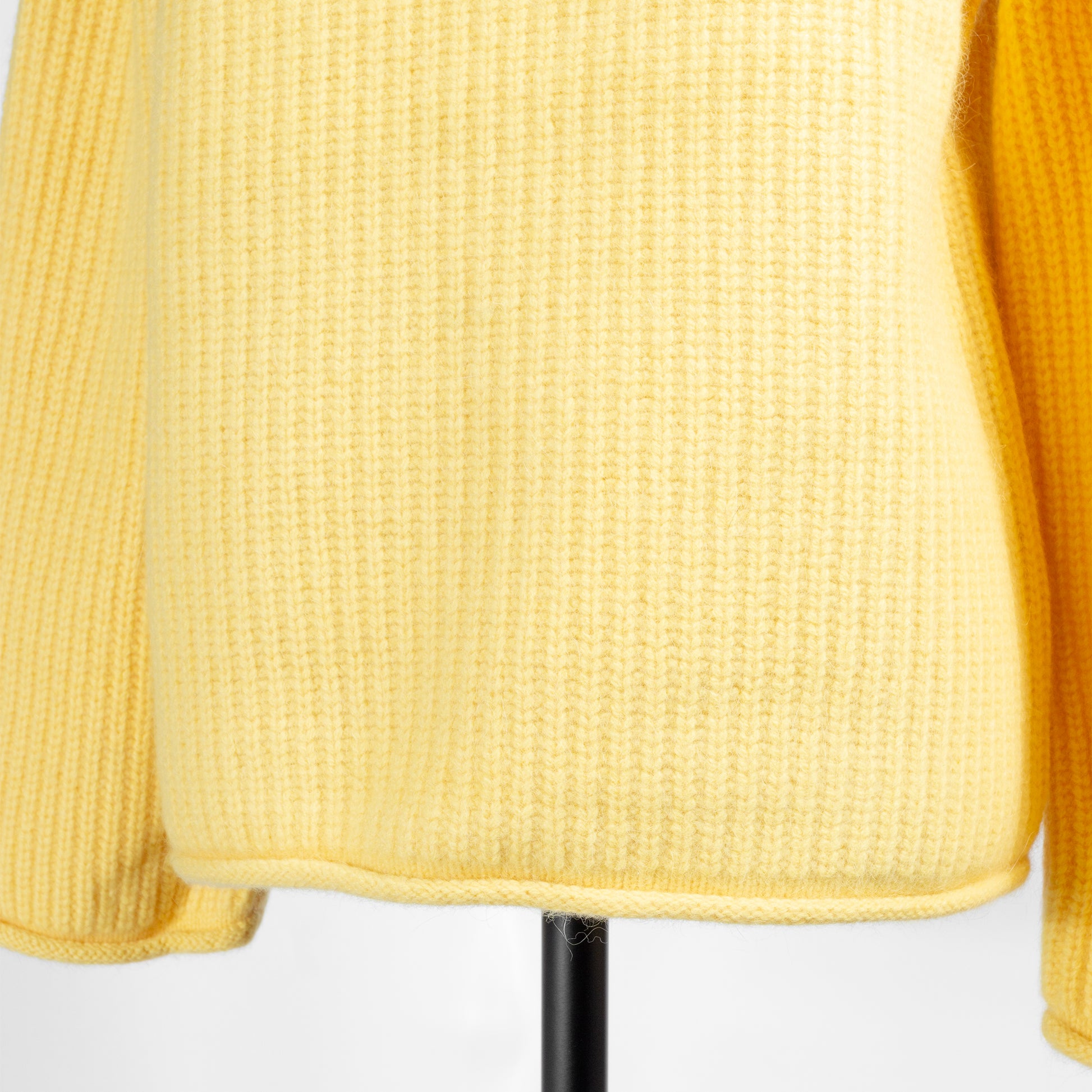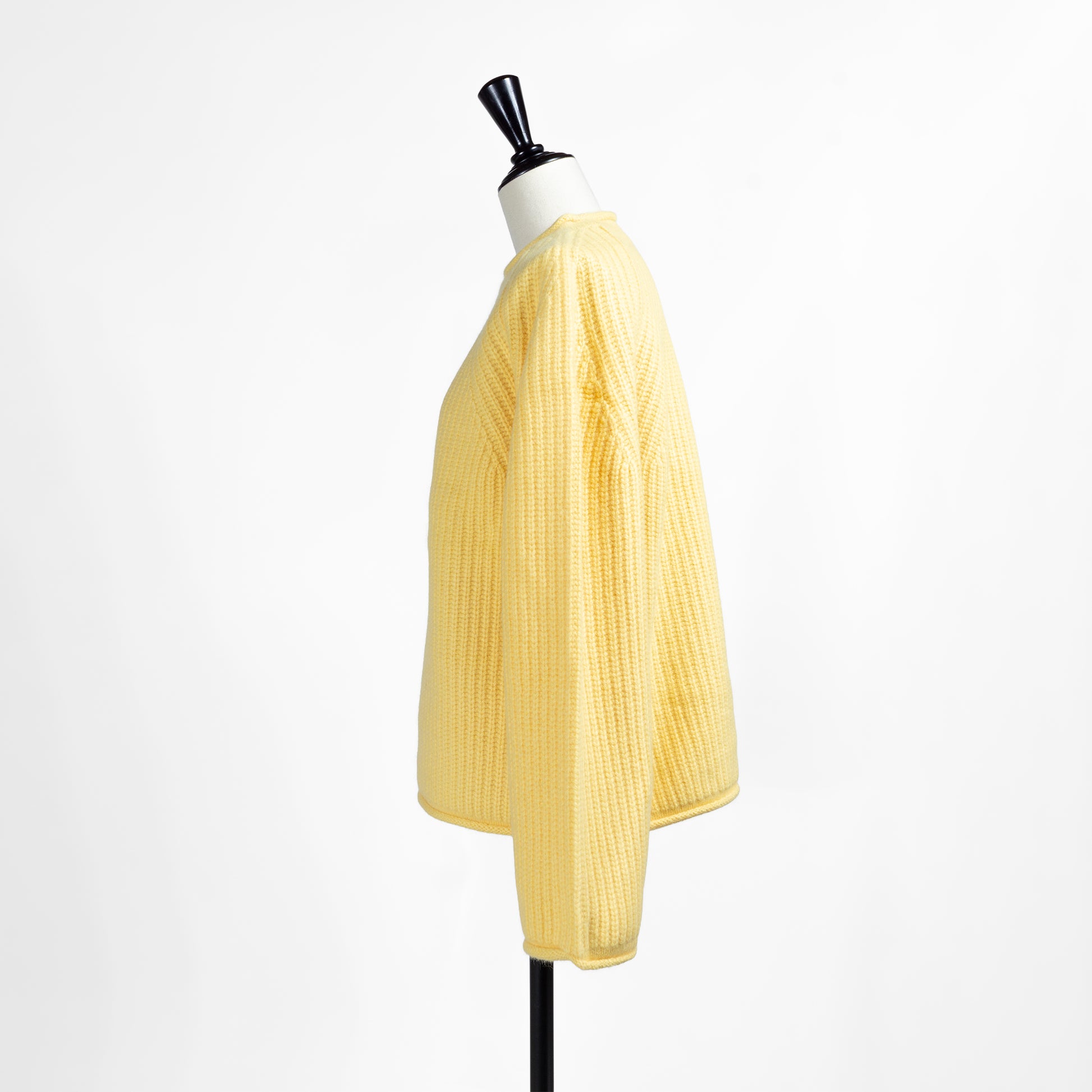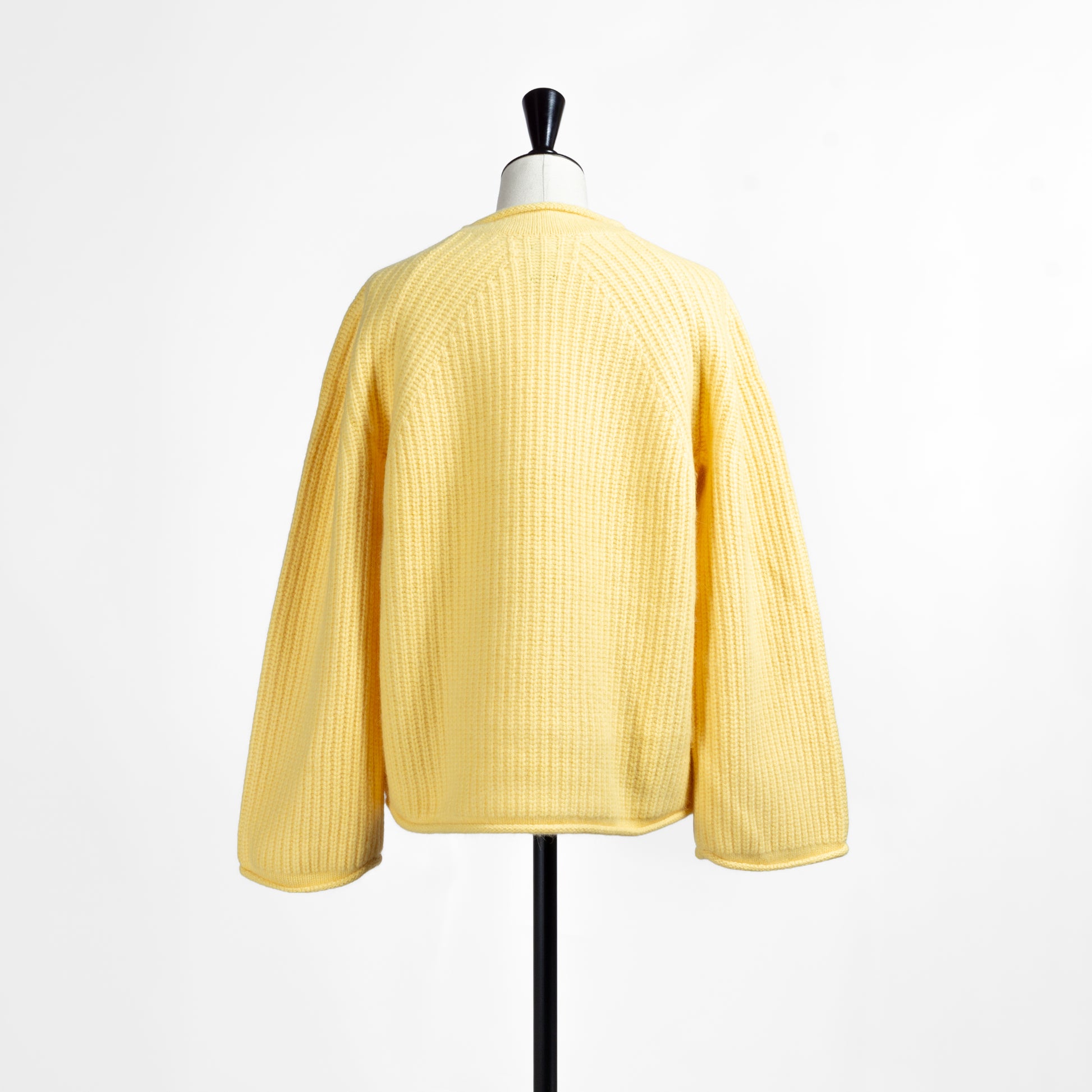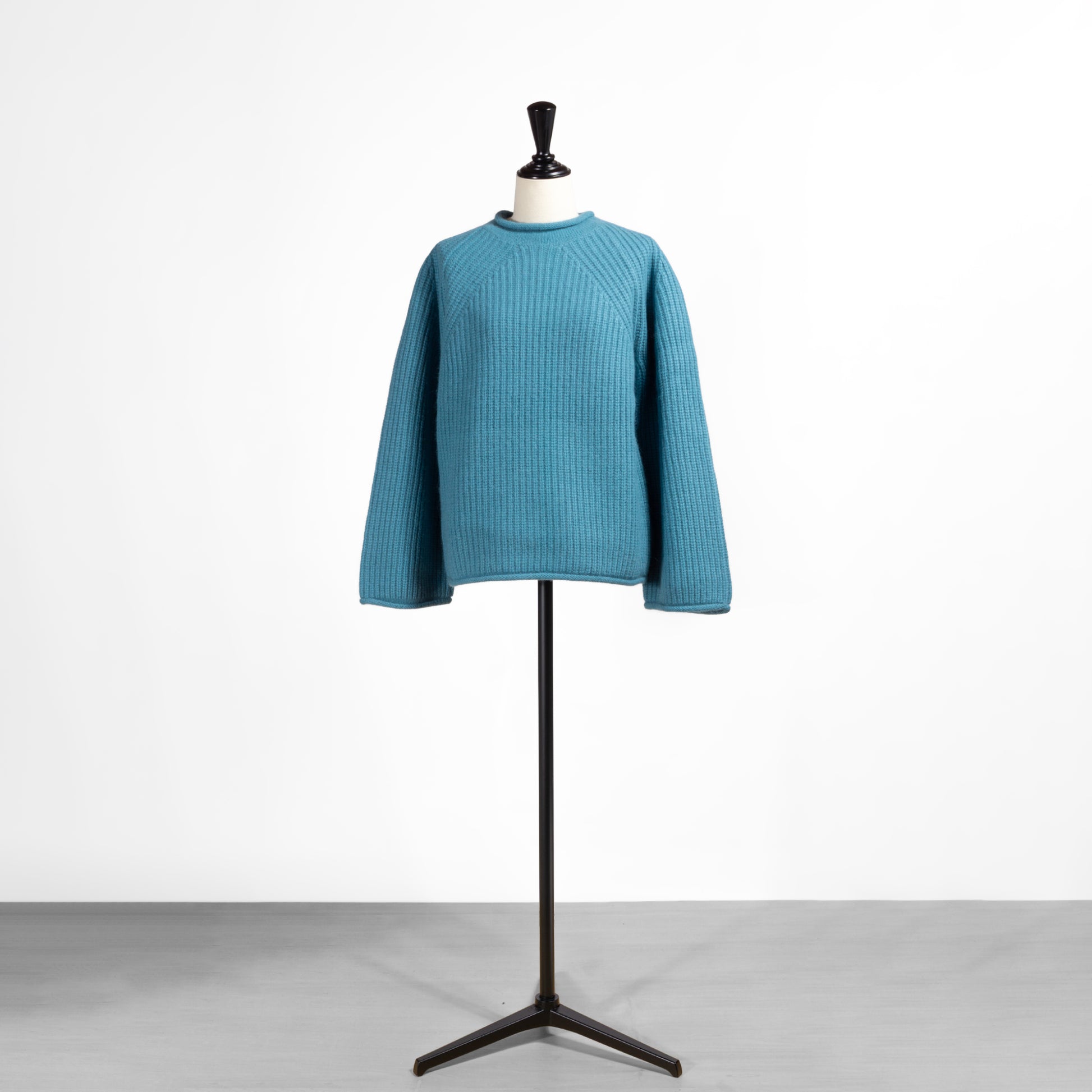 くるんと丸まったネックラインや袖口、裾のディティールがポイントになったセーター